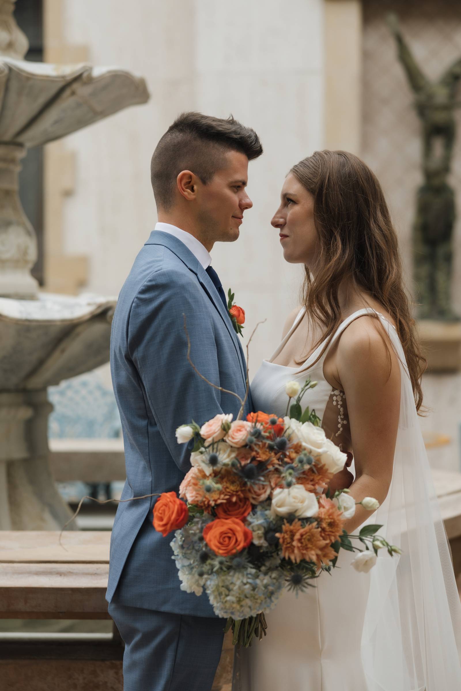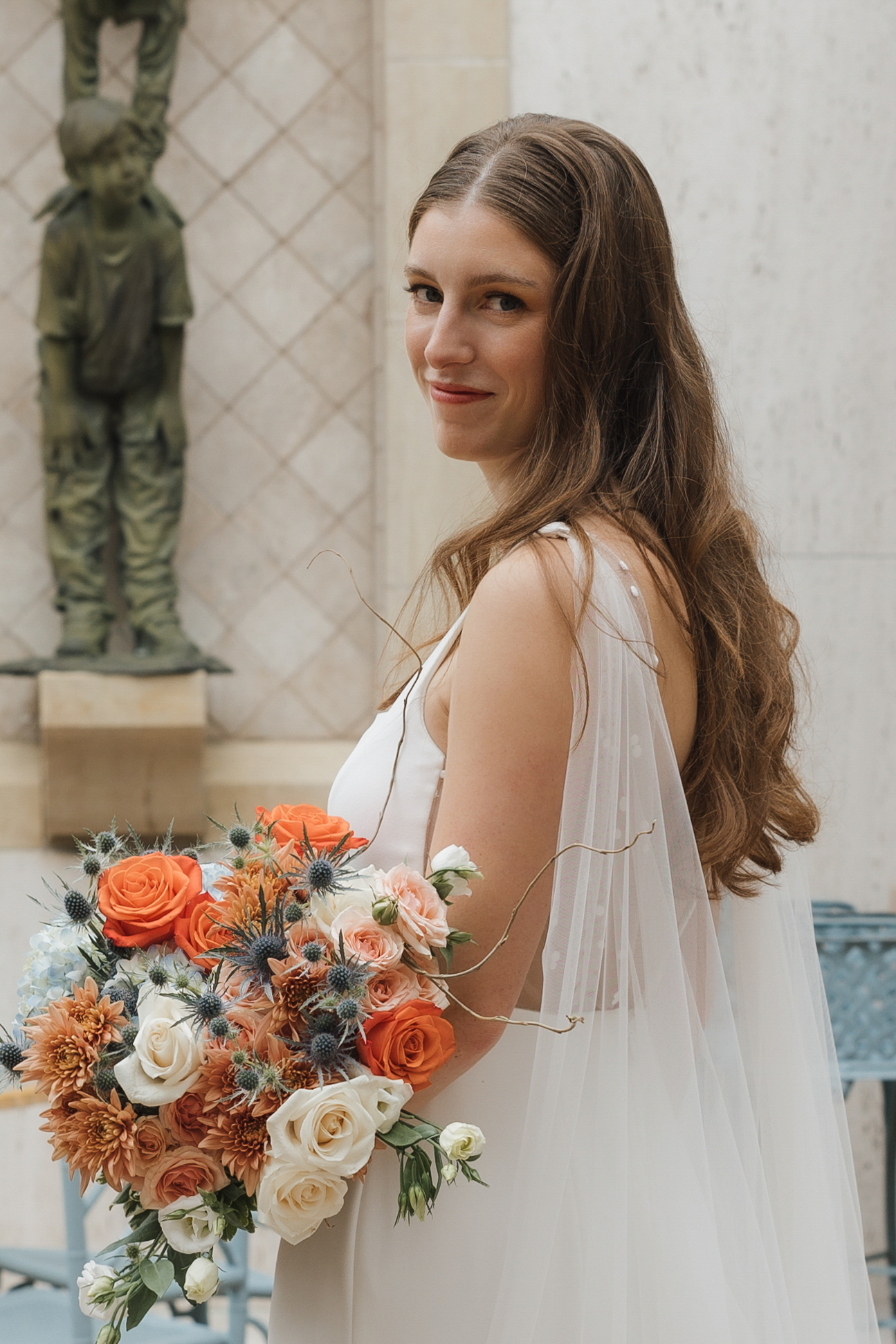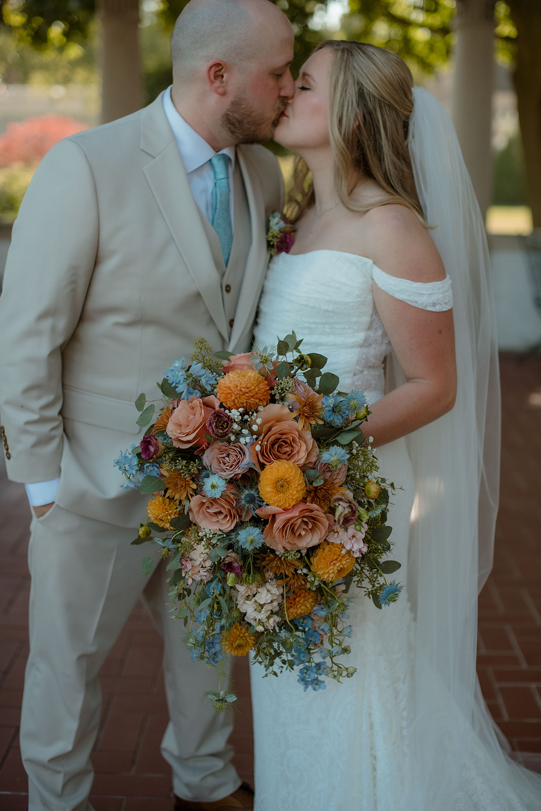 INGREDIENTS: cappuccino roses, orange dahlias, marigolds, blue nigella, chocolate lisianthus, chrysanthemums, peach stock flowers, hydrangea, baby’s breath, blue thistle, and textured greenery