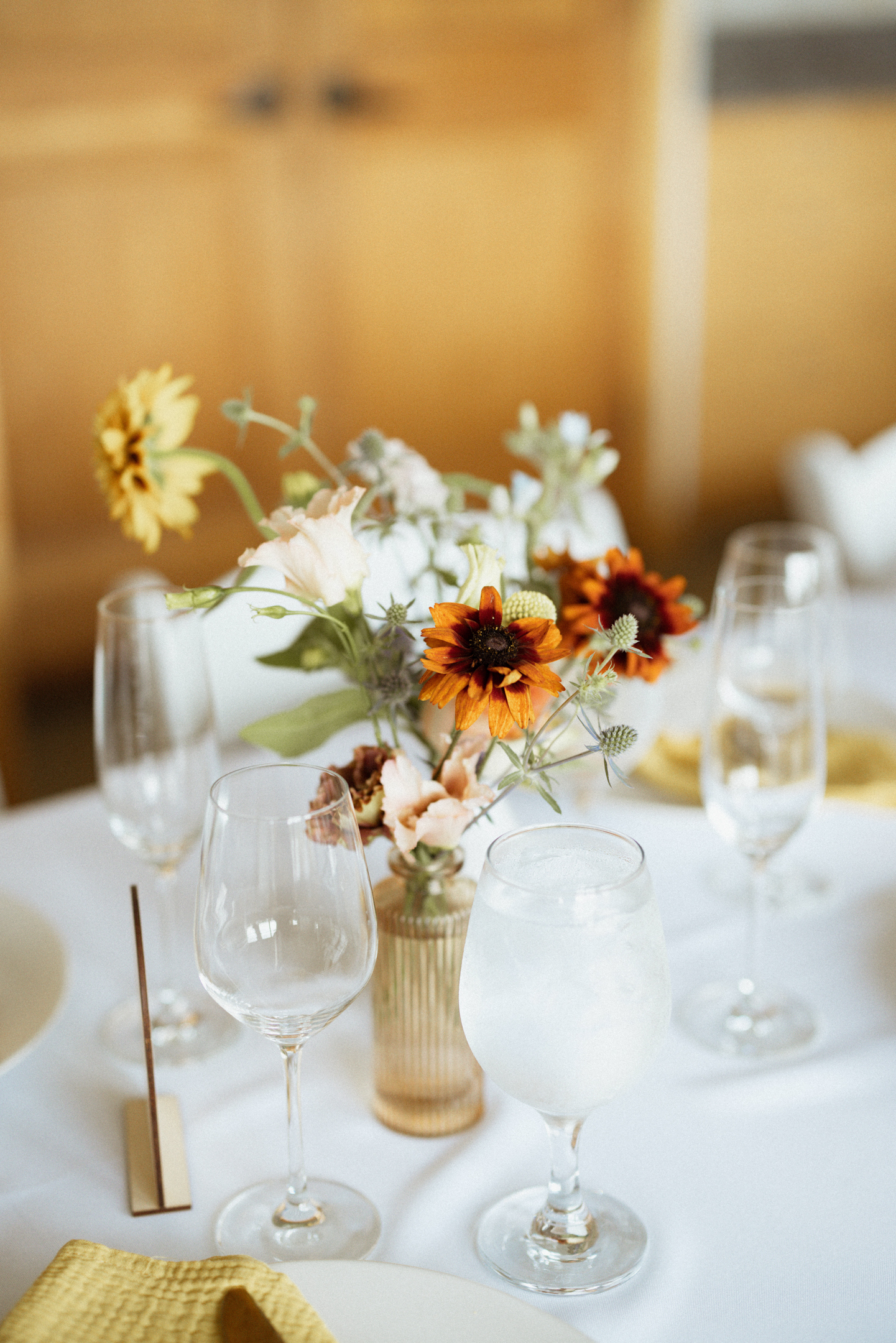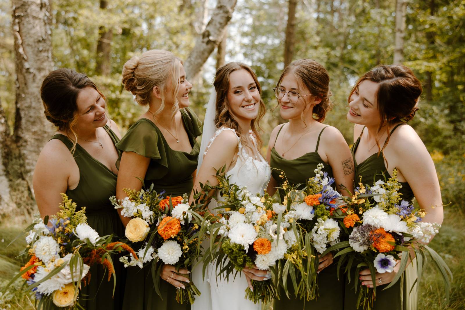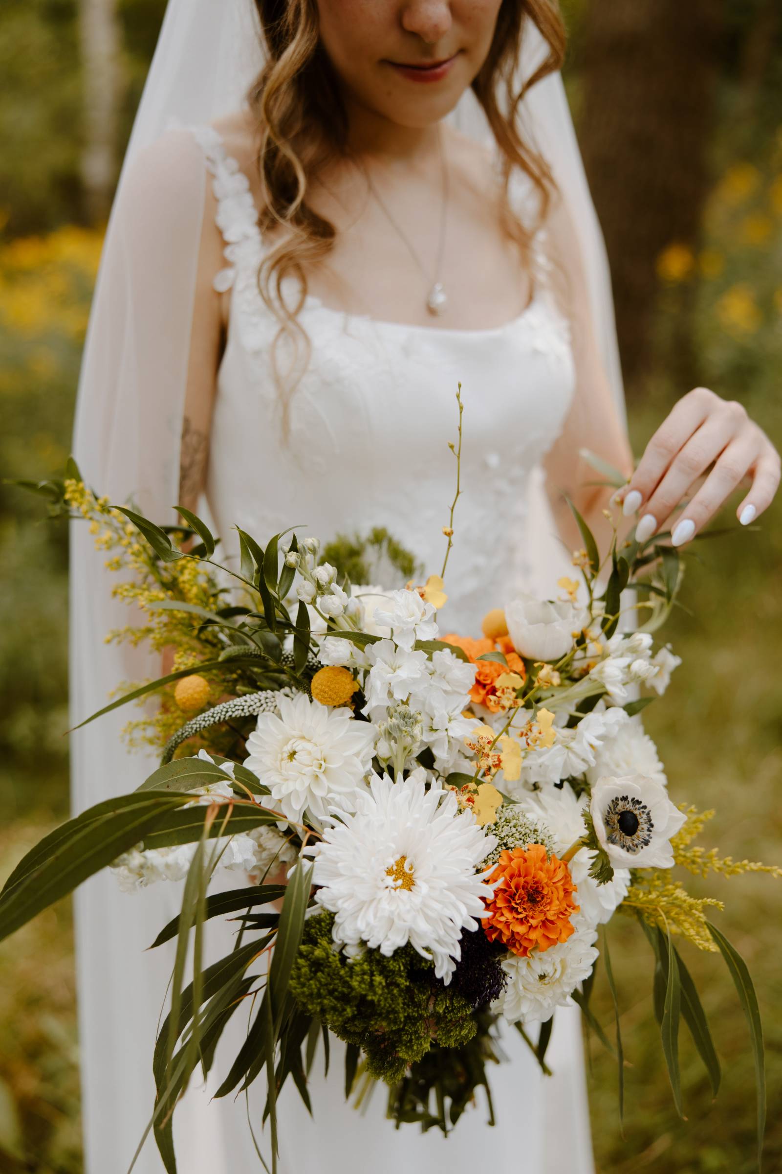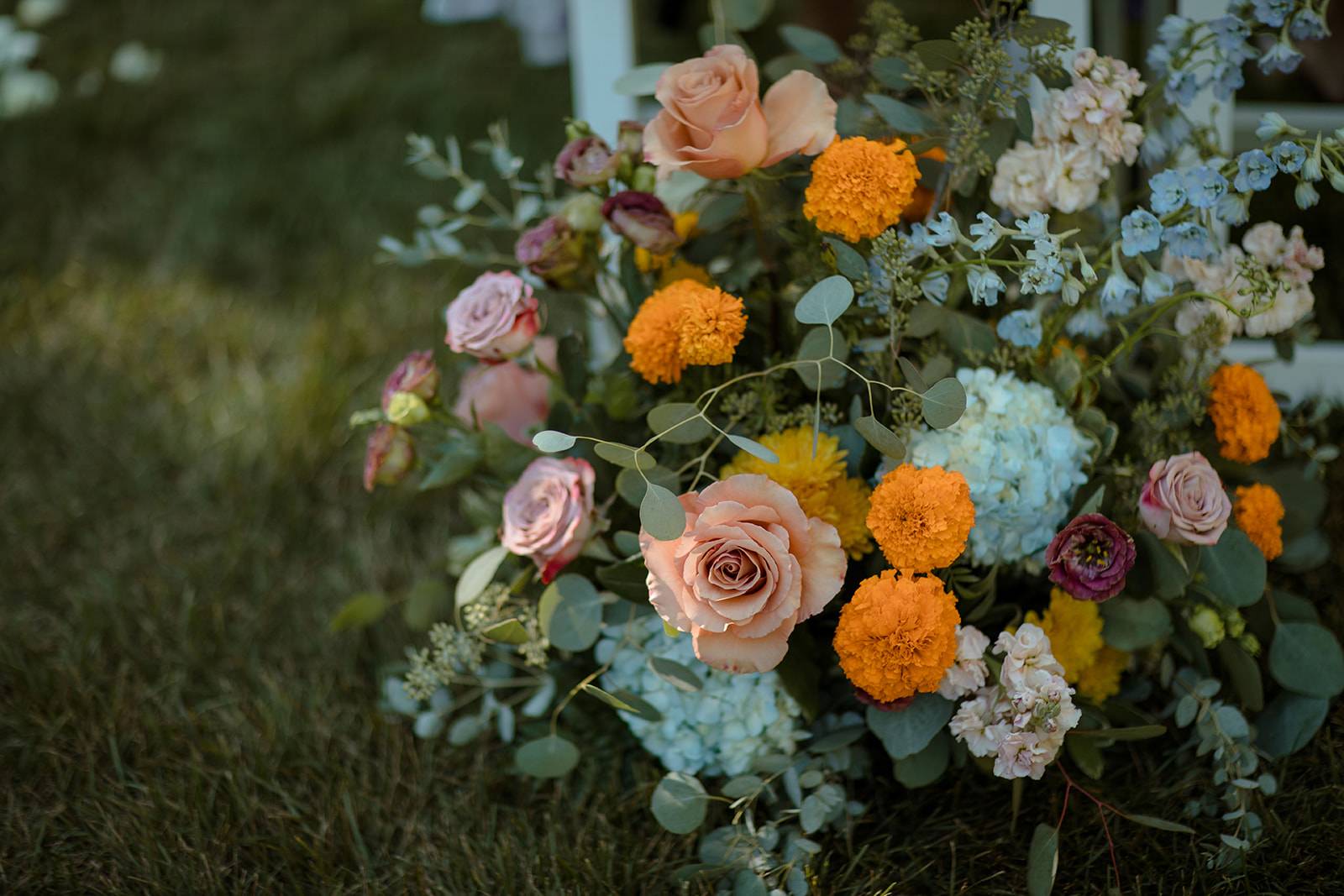 INGREDIENTS: white dahlias, orange marigolds, yellow garden roses, blue larkspur, white snapdragons, anemones, queen anne’s lace, yellow solidago, eucalyptus leaves, rust amaranthus, white, and willow greenery