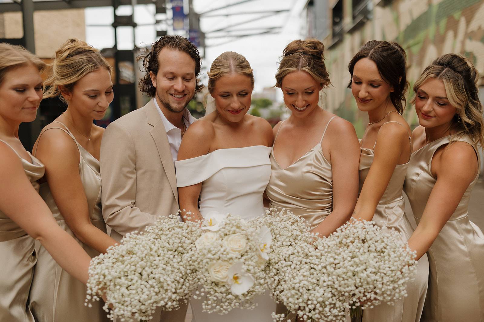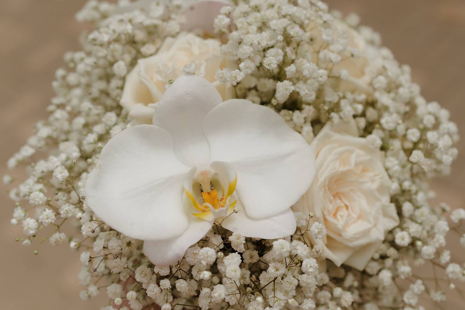 This dreamy bouquet balances softness and sophistication. The bride's monochromatic arrangement features delicate baby's breath, creamy white roses, and elegant orchids for depth and texture. Her bridesmaids carried minimalist arrangements consisting of only baby's breath, making her bouquet subtly stand out.
