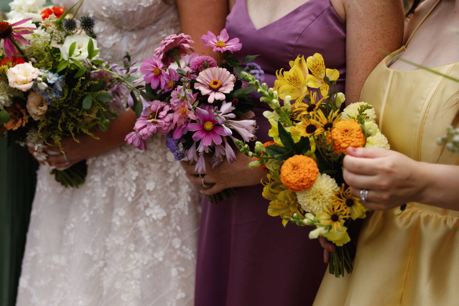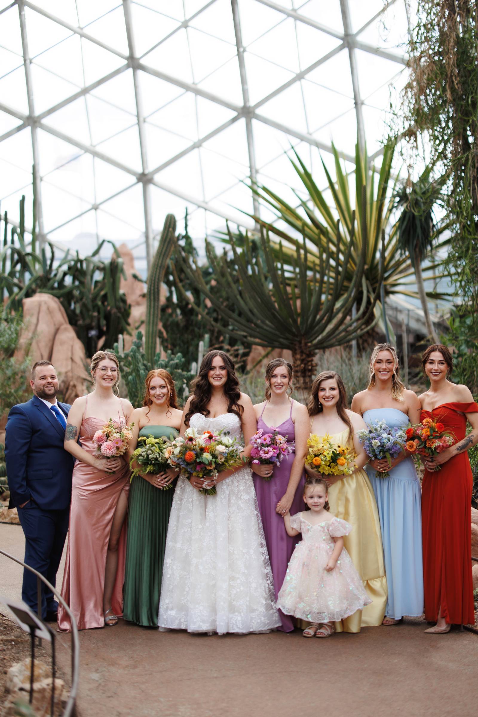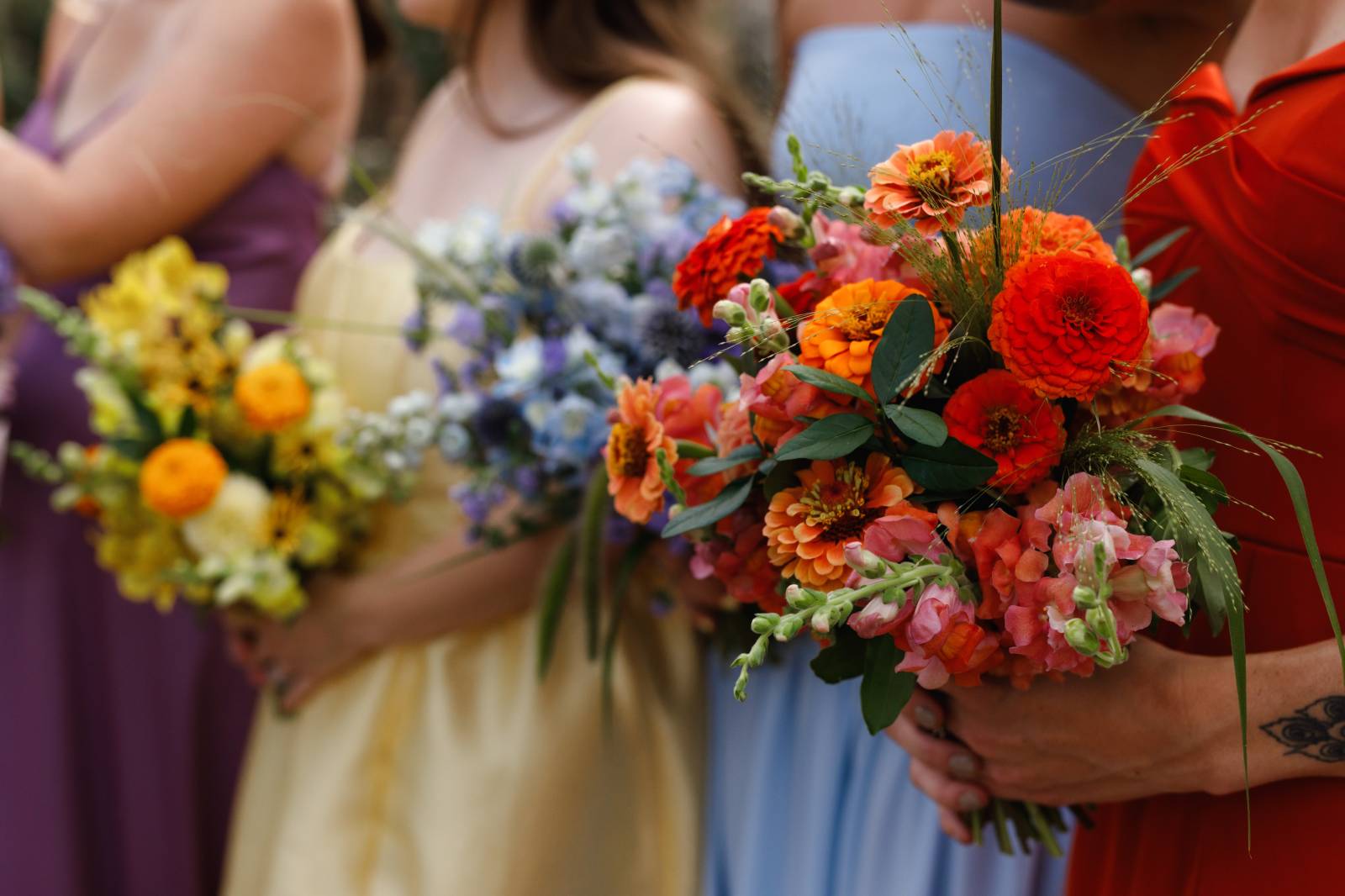 Even more fun, each bridesmaid was styled with a unique, near-monochromatic bouquet that matched the color of her gown. The bridal bouquet was a mix of all colors as a nod to the friends who stood by her side as she said her vows.