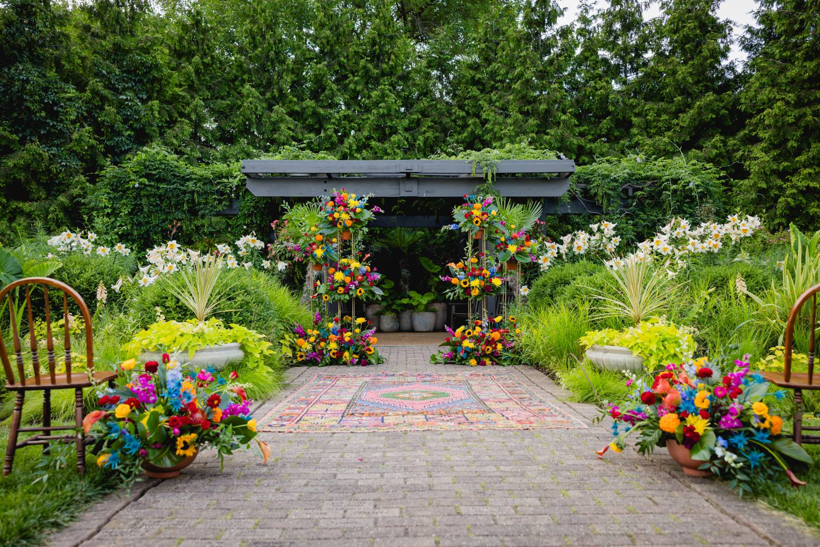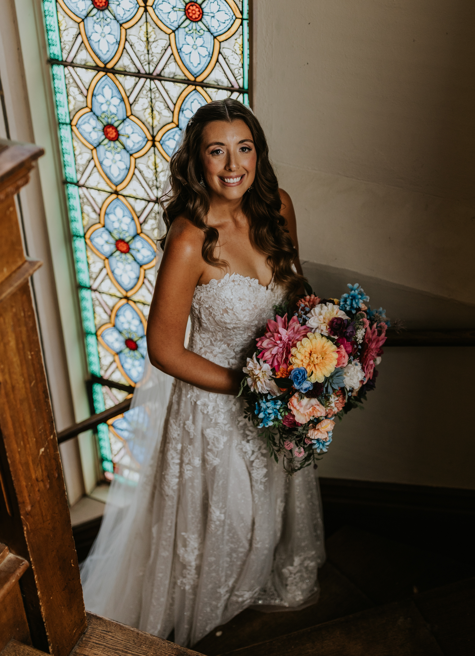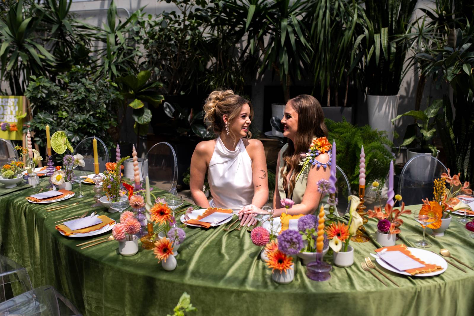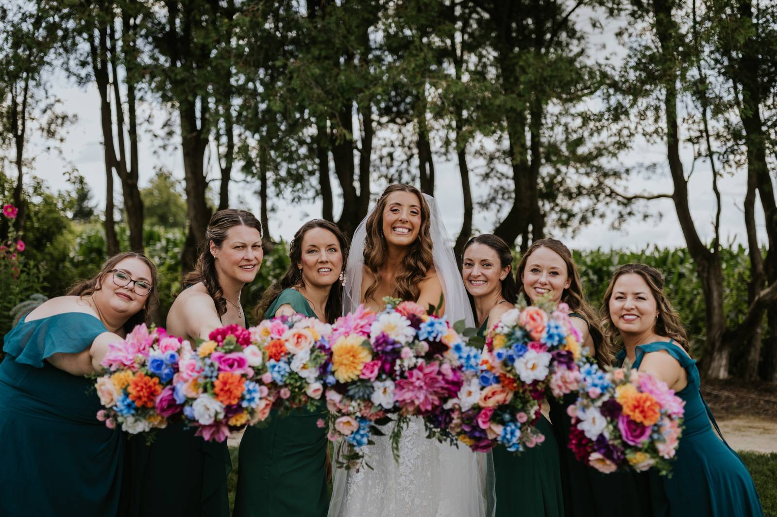 Even more fun, each bridesmaid was styled with a unique, near-monochromatic bouquet that matched the color of her gown. The bridal bouquet was a mix of all colors as a nod to the friends who stood by her side as she said her vows.
