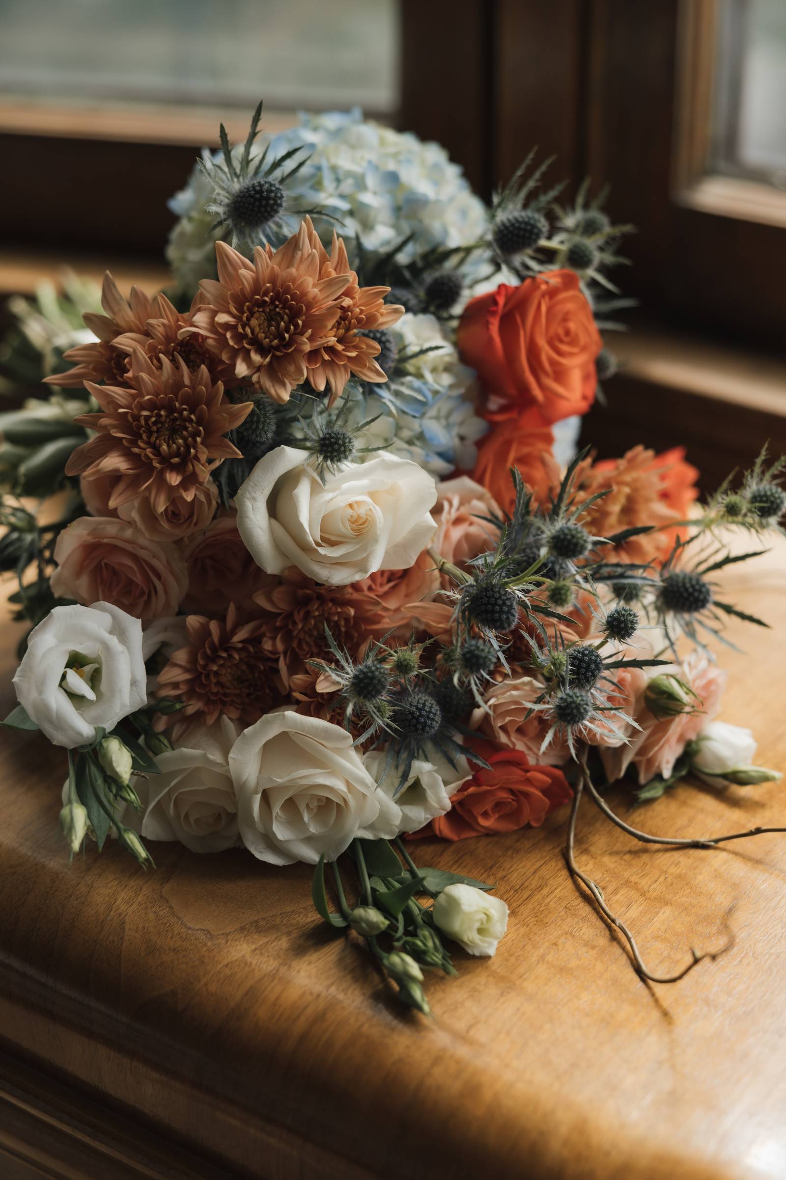 This striking bouquet blends warm and cool tones in a design that feels both timeless and refreshingly unexpected. Vivid orange roses and peach spray roses bring warmth and vibrance, while soft blue hydrangeas and steel-toned thistle cool the palette. White lisianthus adds lightness, spider chrysanthemums contribute a dramatic autumnal edge, and curly willow branches twist through the arrangement with organic movement. The result is a bouquet that feels sculptural and whimsical.