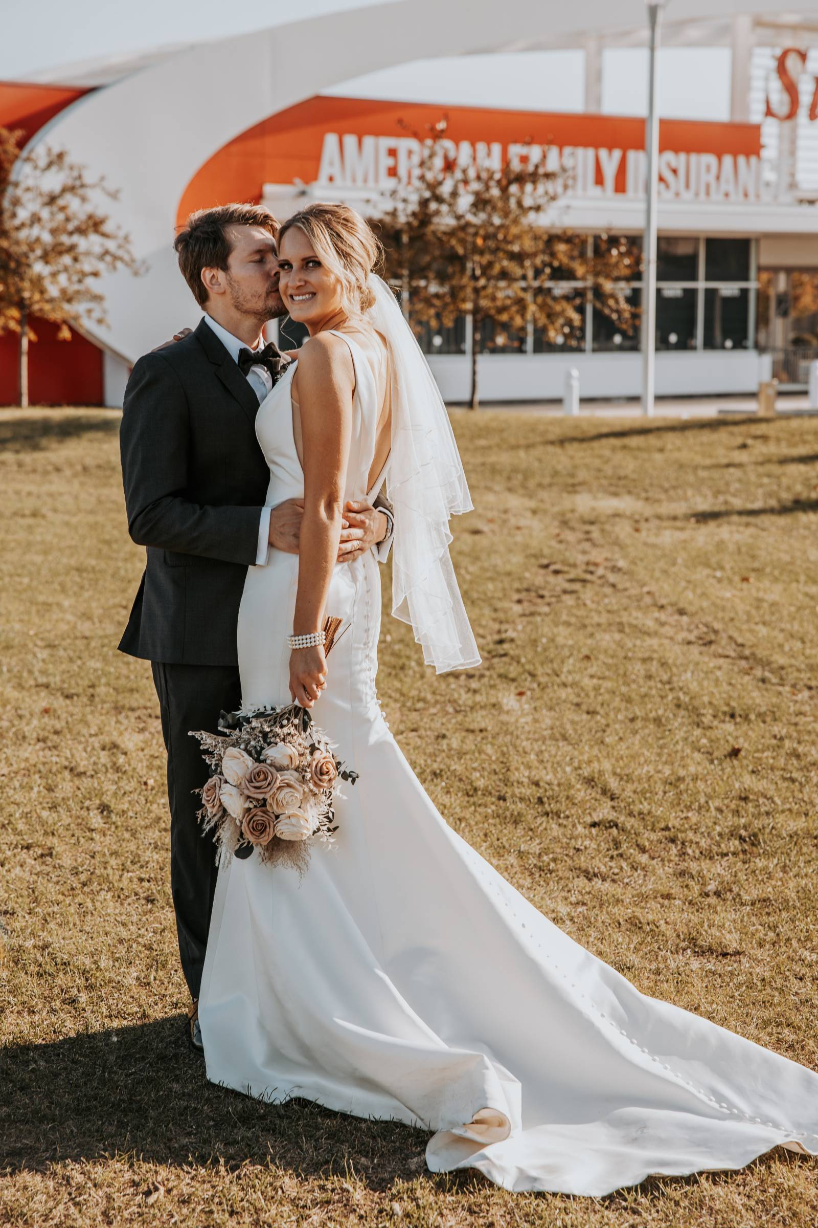 INGREDIENTS: cream and taupe roses, baby’s breath, dried grasses, pampas plumes, dried eucalyptus, dried limonium, and bleached ruscus