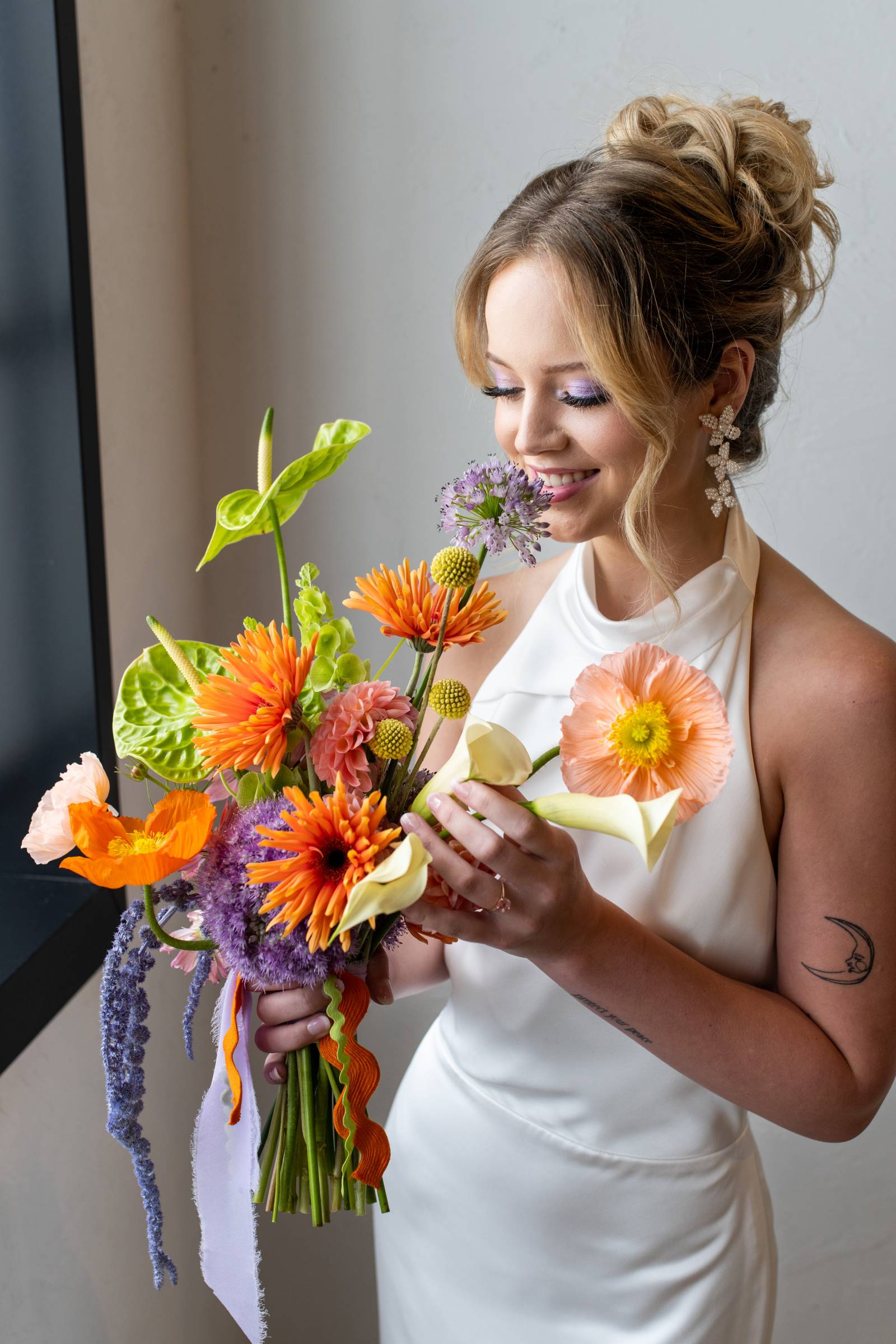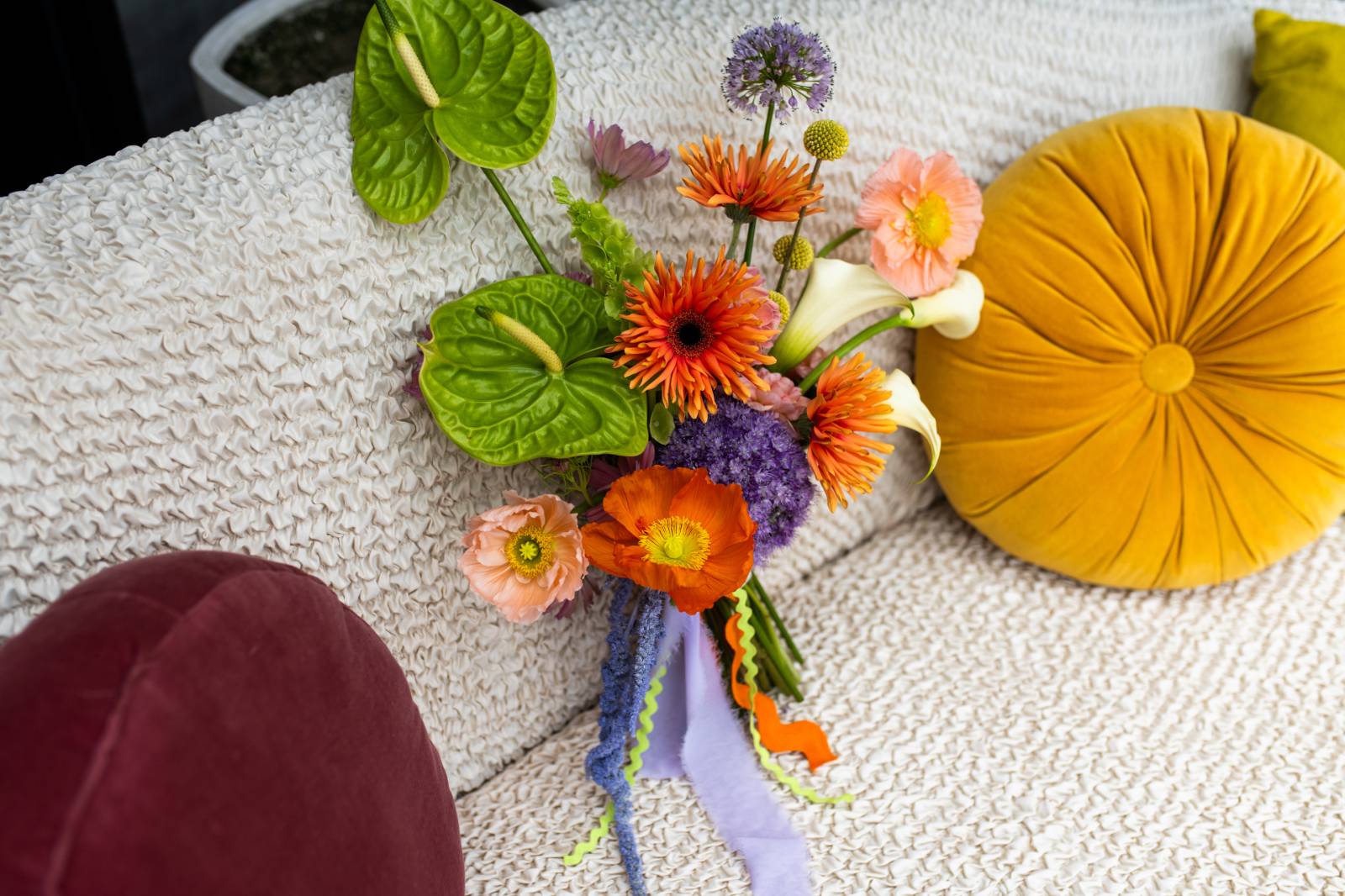 This playful and eclectic bouquet bursts with personality and texture, blending tropical, garden, and whimsical elements in a riot of color. Vivid orange gerberas and poppies pop against sculptural green anthurium and creamy calla lilies, while purple allium and amaranthus add contrast and movement. Finished with wavy rickrack ribbons in bright hues, it’s a fresh, funky, and joyfully modern bouquet perfect for a summer celebration.