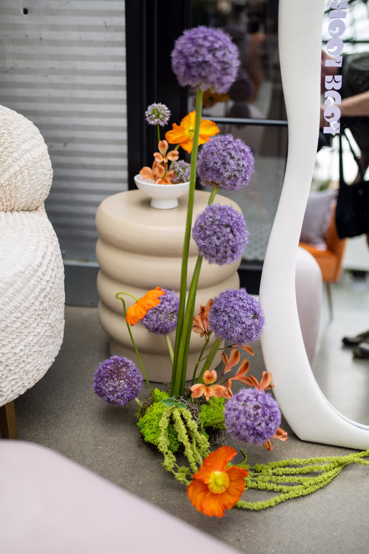 INGREDIENTS: tropical anthurium, orange gerbera daisies, poppies, calla lilies, billy balls, allium, pink and purple cosmos, amaranthus, bells of Ireland