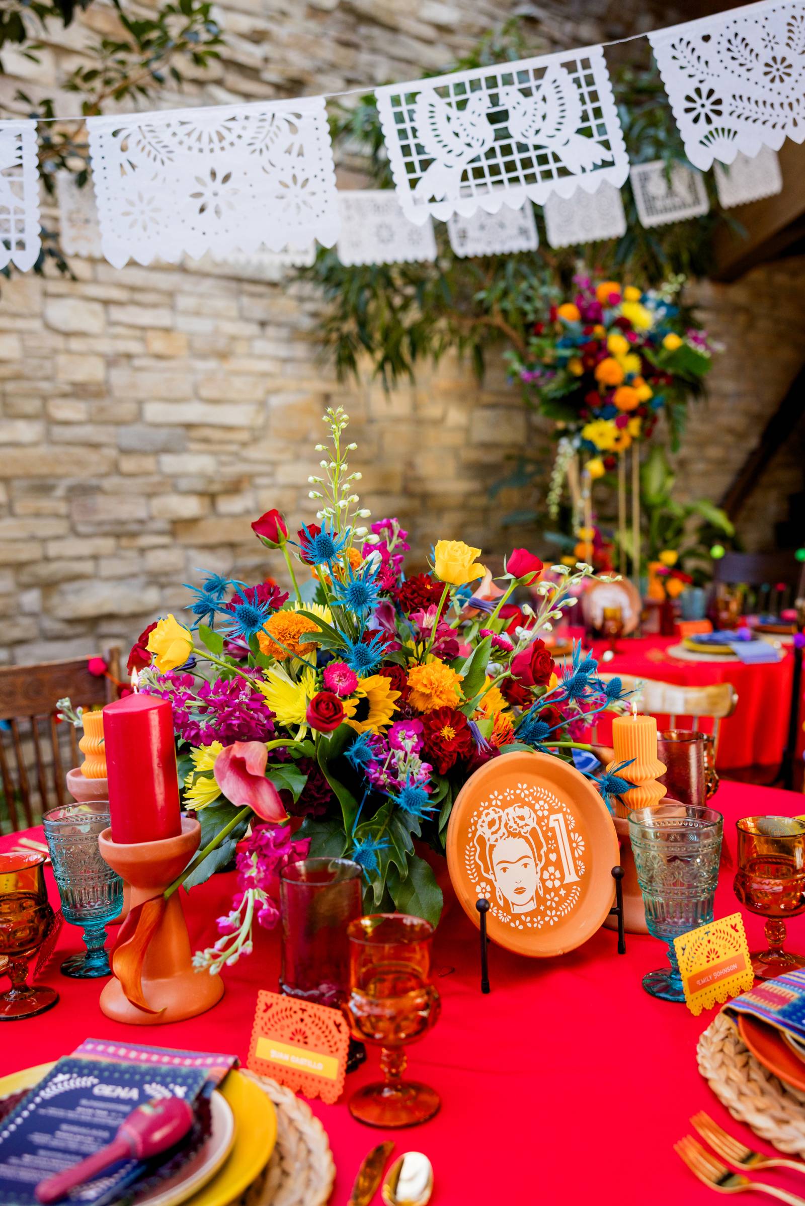 INGREDIENTS: dinnerplate dahlias, magenta peonies, garden roses, blue ranunculus, scabiosa, pincushion flowers, bright blue hydrangea, delphinium, billy balls, baby’s breath, blue tweedia, succulents, and assorted greenery