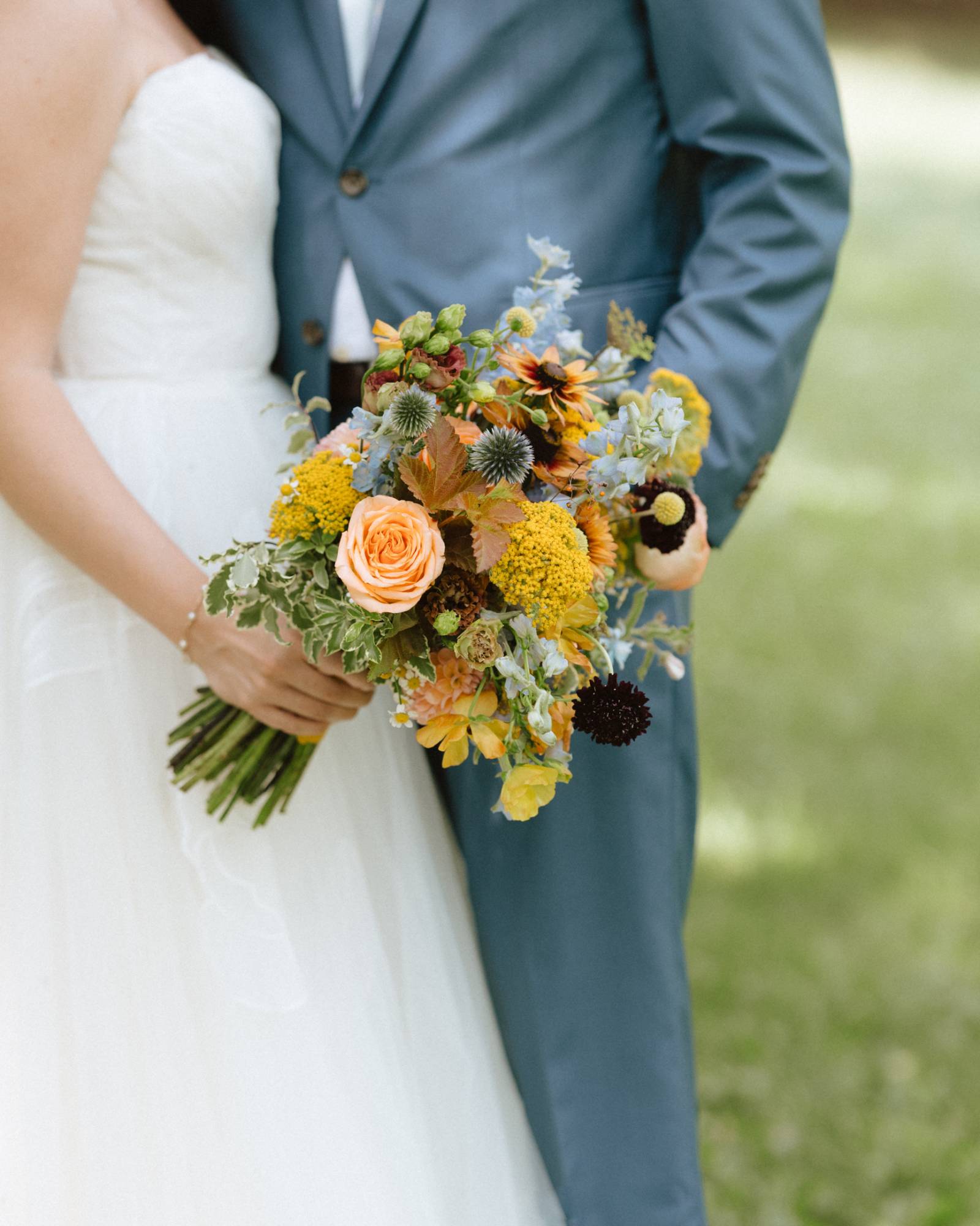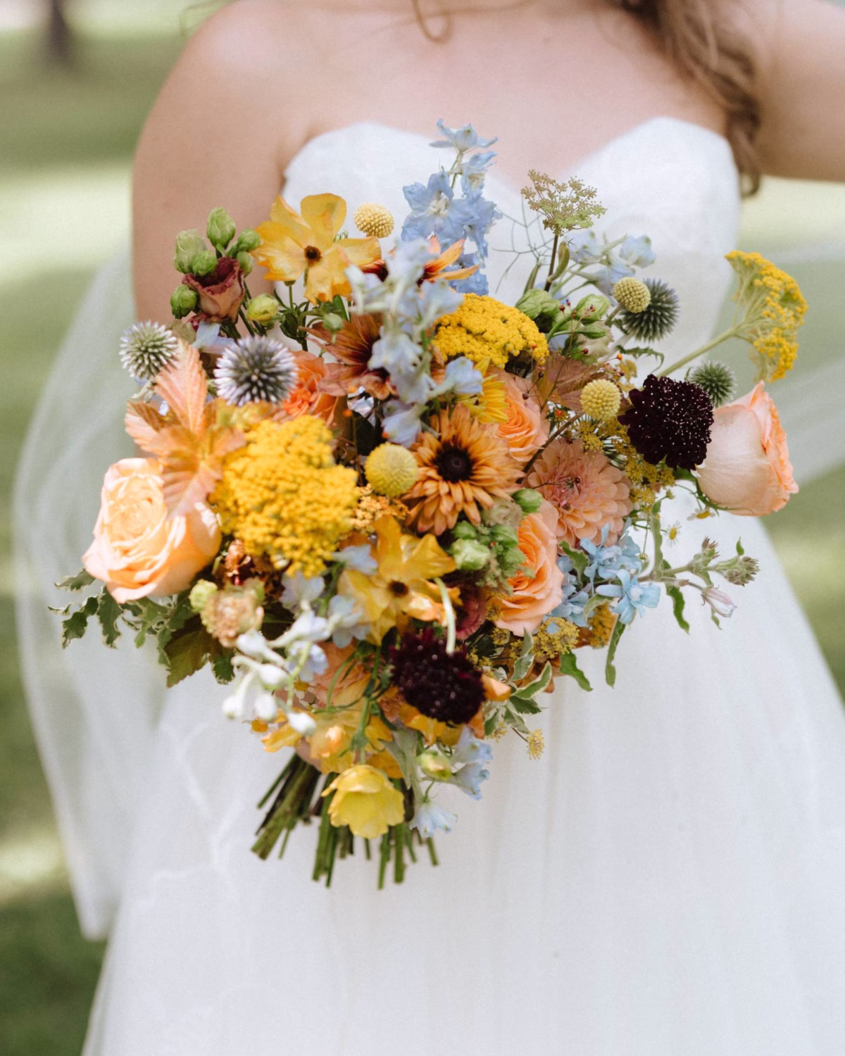 INGREDIENTS: peach roses, yellow yarrow, blue delphinium, scabiosa, billy balls, zinnias, blush lisianthus, yellow buttercups, butterfly ranunculus, blue thistle, chamomile, queen anne’s lace