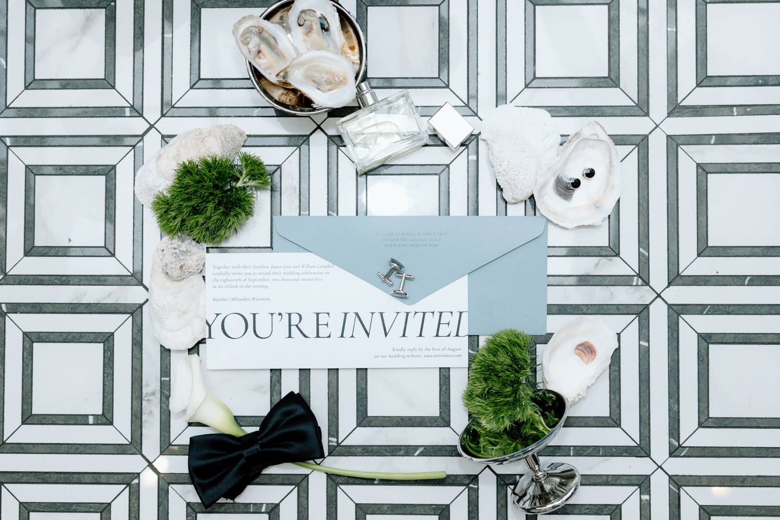 Hall Creative Co. provided an invitation suite and other printed pieces for the styled shoot, beginning with a horizontal, letter-sized invitation. The suite utilized an oversized, modern serif font with artful cropping, with details placed in the negative space. The invitation was completed by a light blue envelope, looking elegant against the geometric tiling on the venue floor.