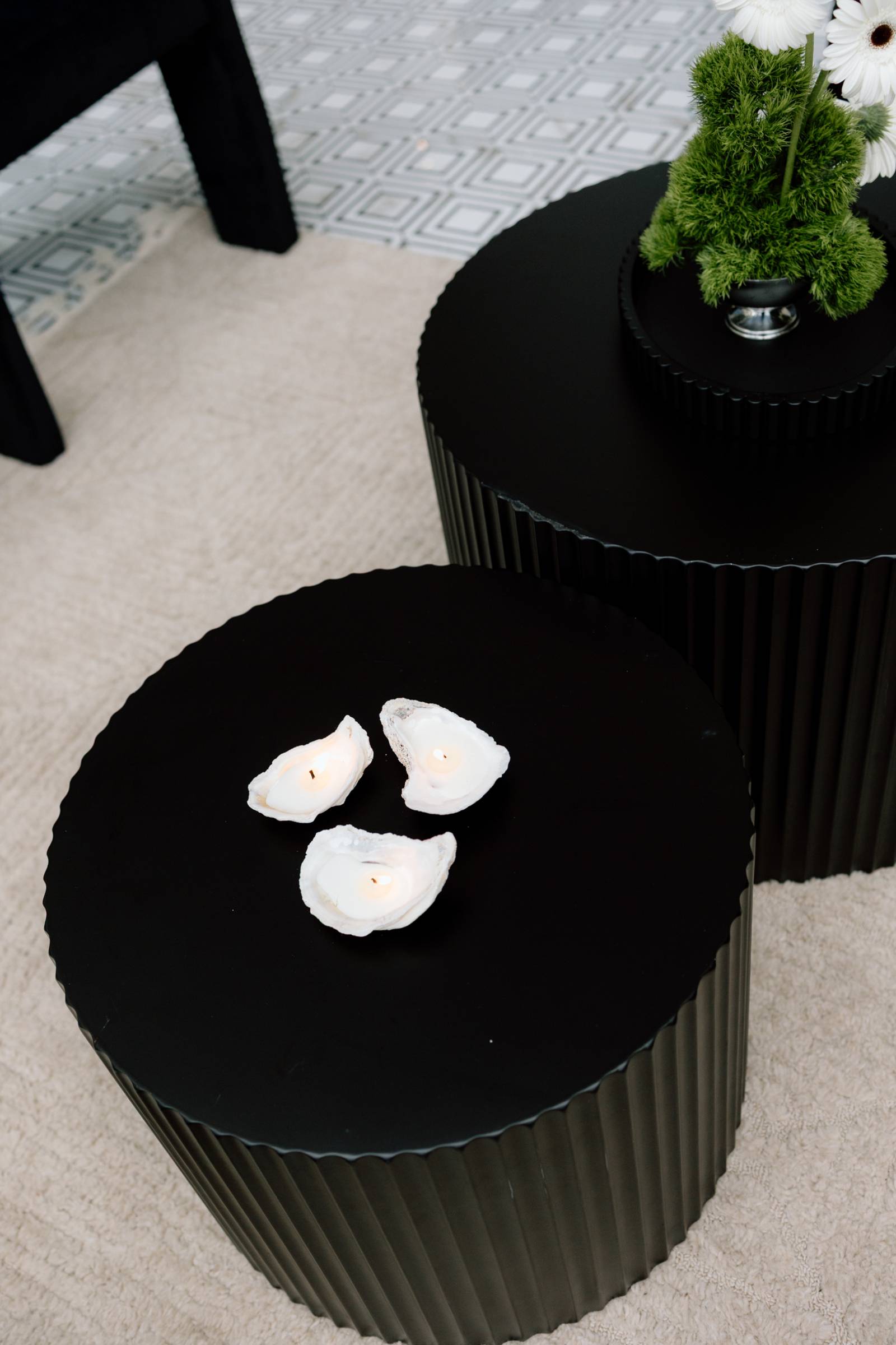 Nearby, the lounge, with rentals from Adorn Event Company, was stylish and modern. Standout furniture included fluted end tables and trays, wooden spindle end tables, botanical throw pillows, lamps, and three-legged velvet chairs.