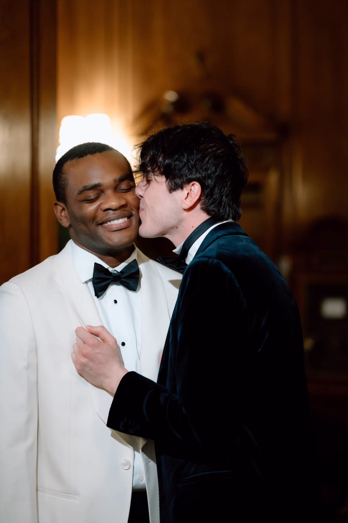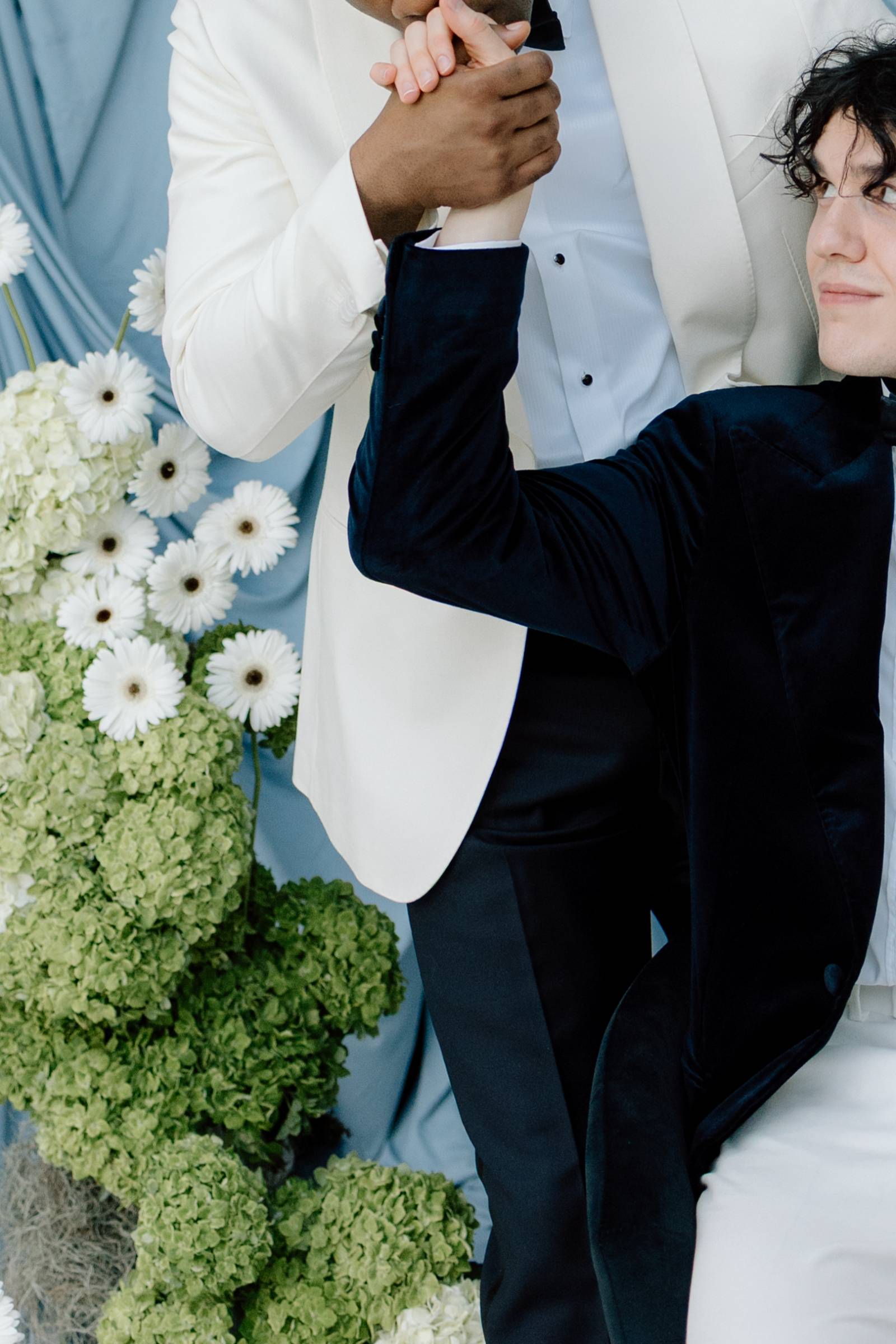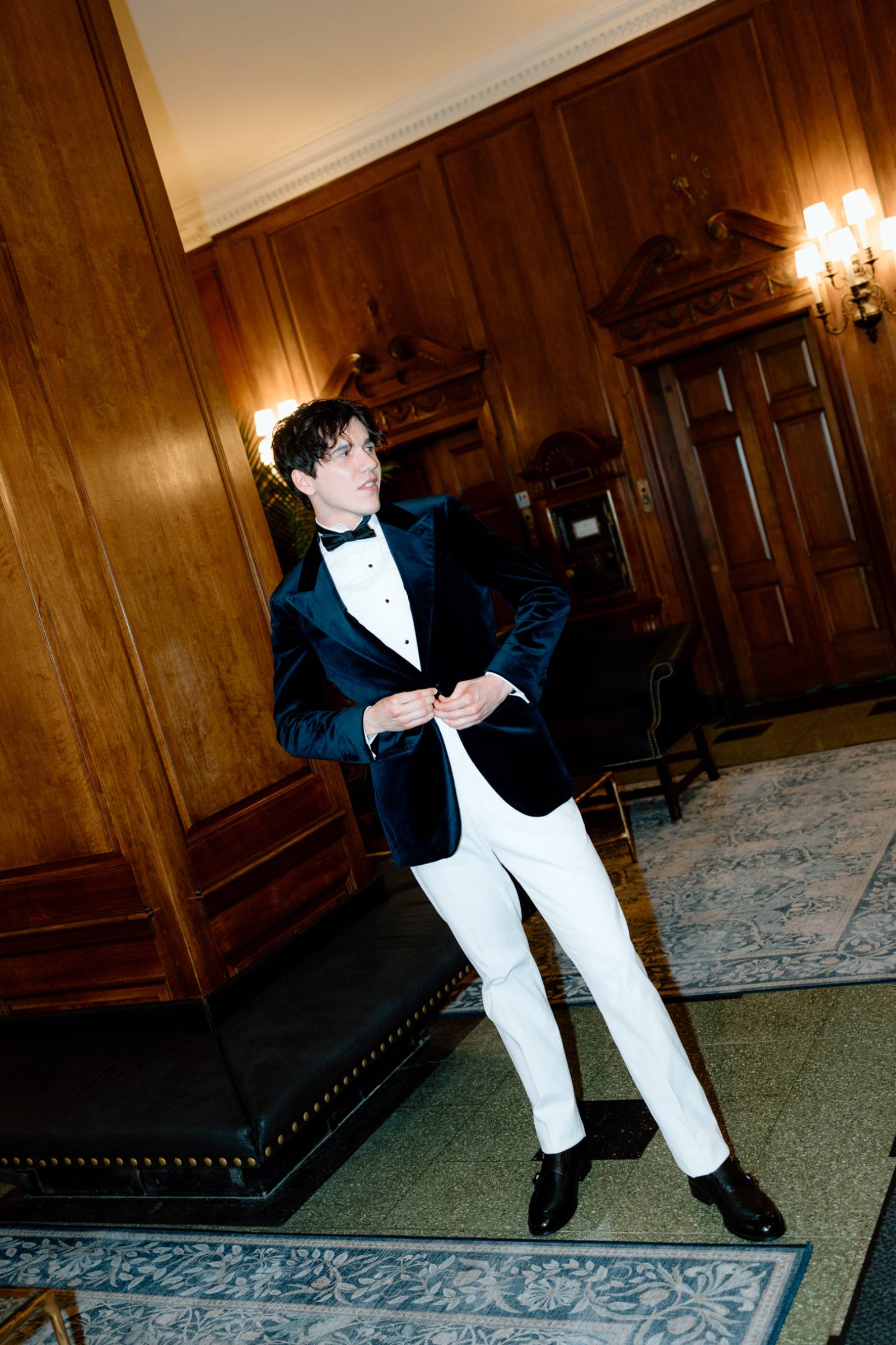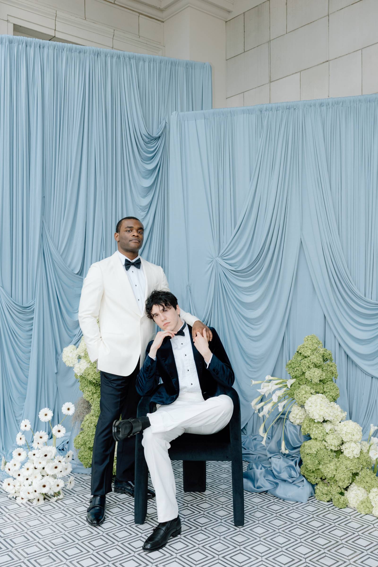 Teak & Ivory Bridal styled the grooms for the day, selecting coordinating, yet personal and unique pieces for each model. Harrison wore a blue velvet suit jacket, white pants, a white, pleated undershirt with black buttons, black shoes, and a black bowtie.