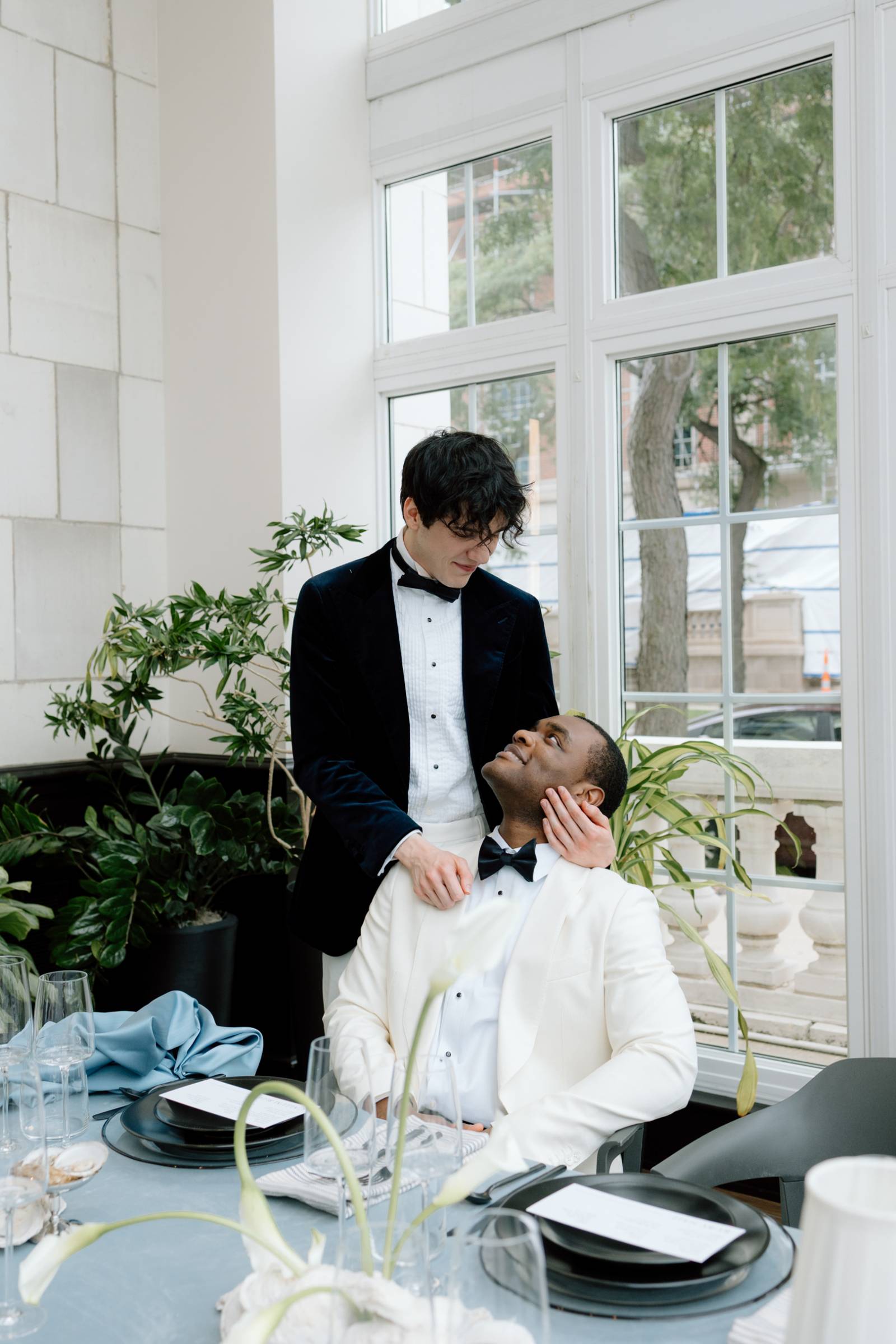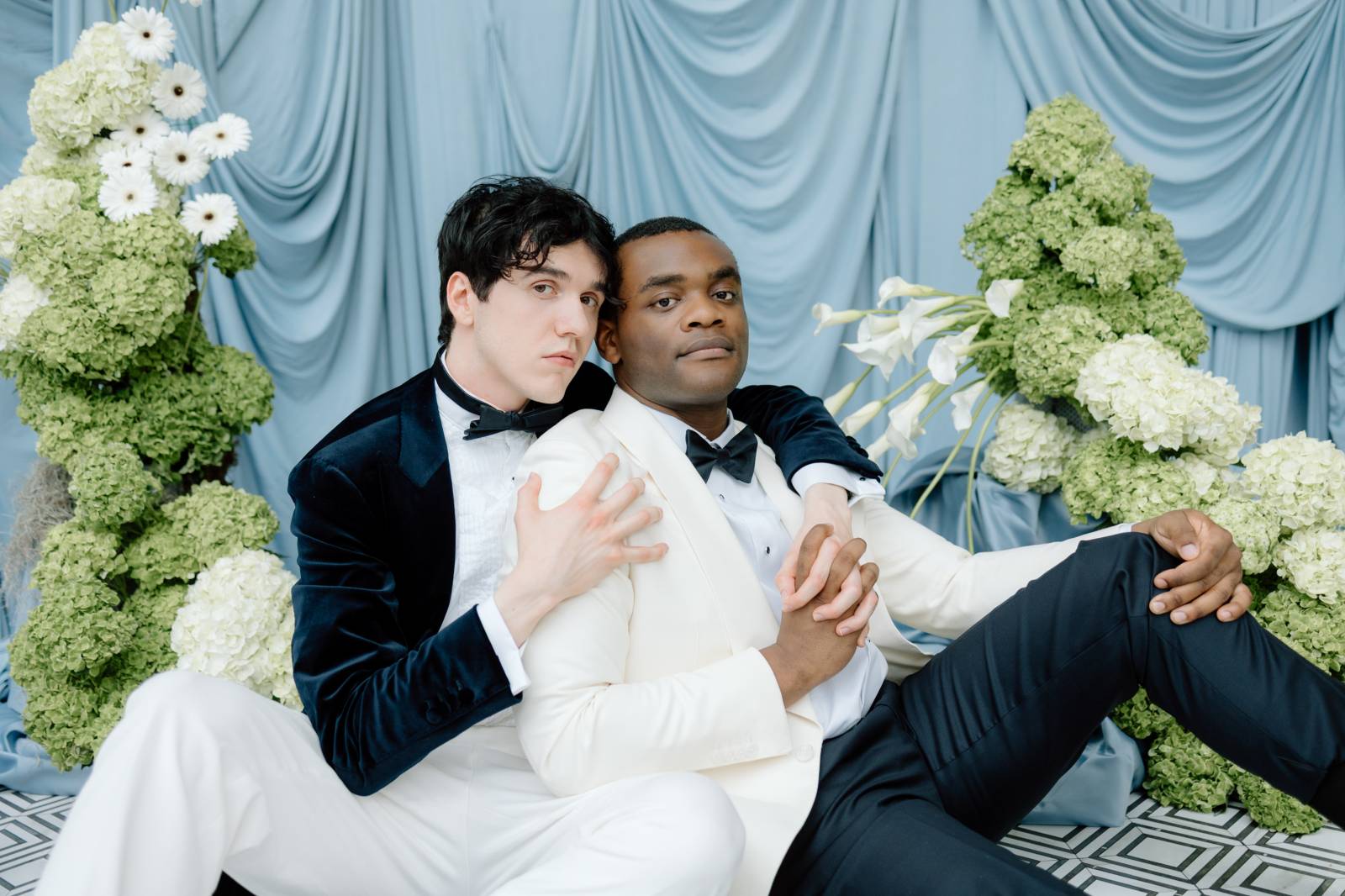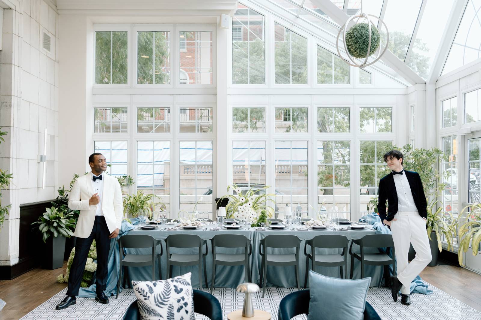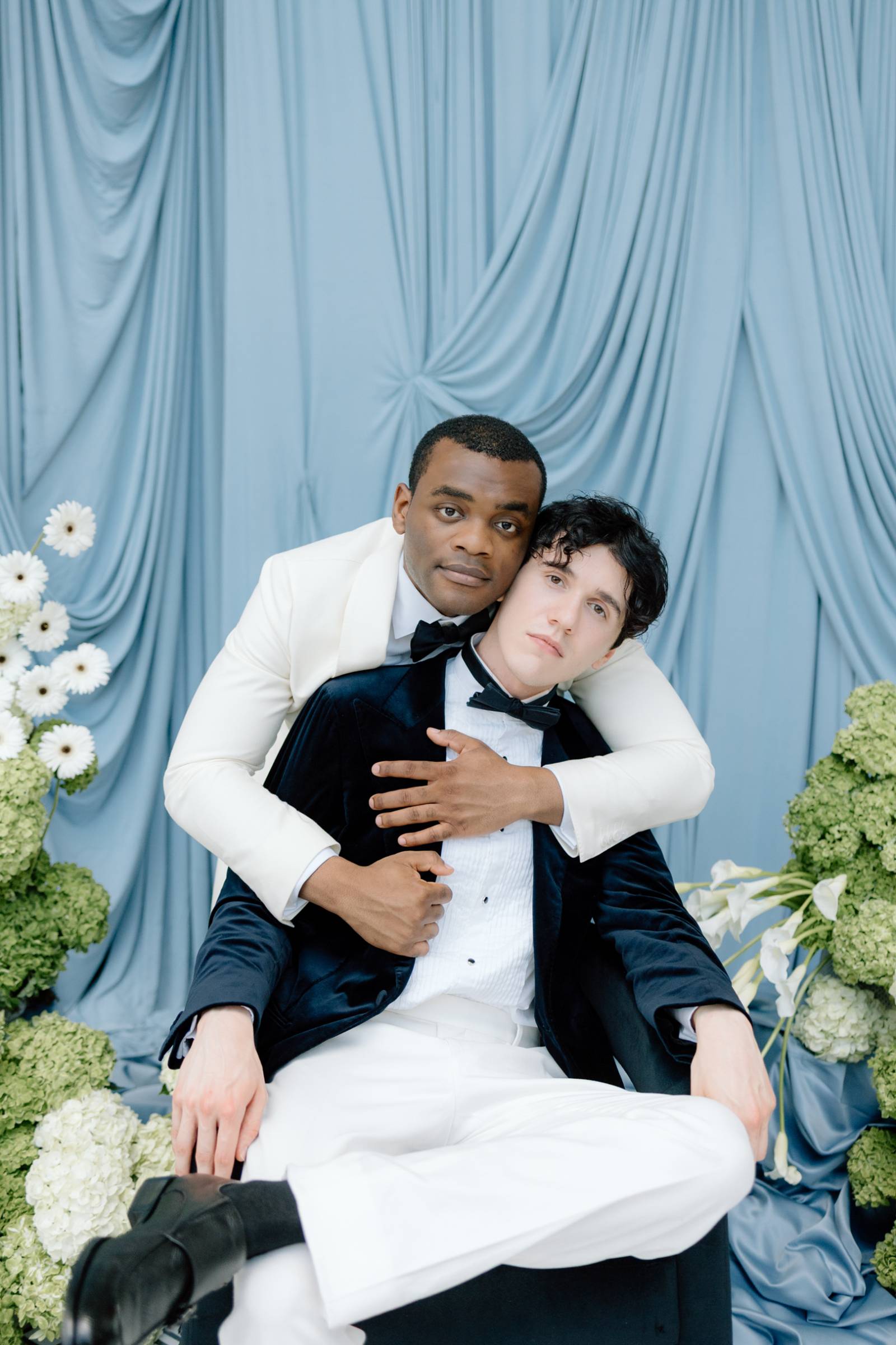 Teak & Ivory Bridal styled the grooms for the day, selecting coordinating, yet personal and unique pieces for each model. Harrison wore a blue velvet suit jacket, white pants, a white, pleated undershirt with black buttons, black shoes, and a black bowtie.