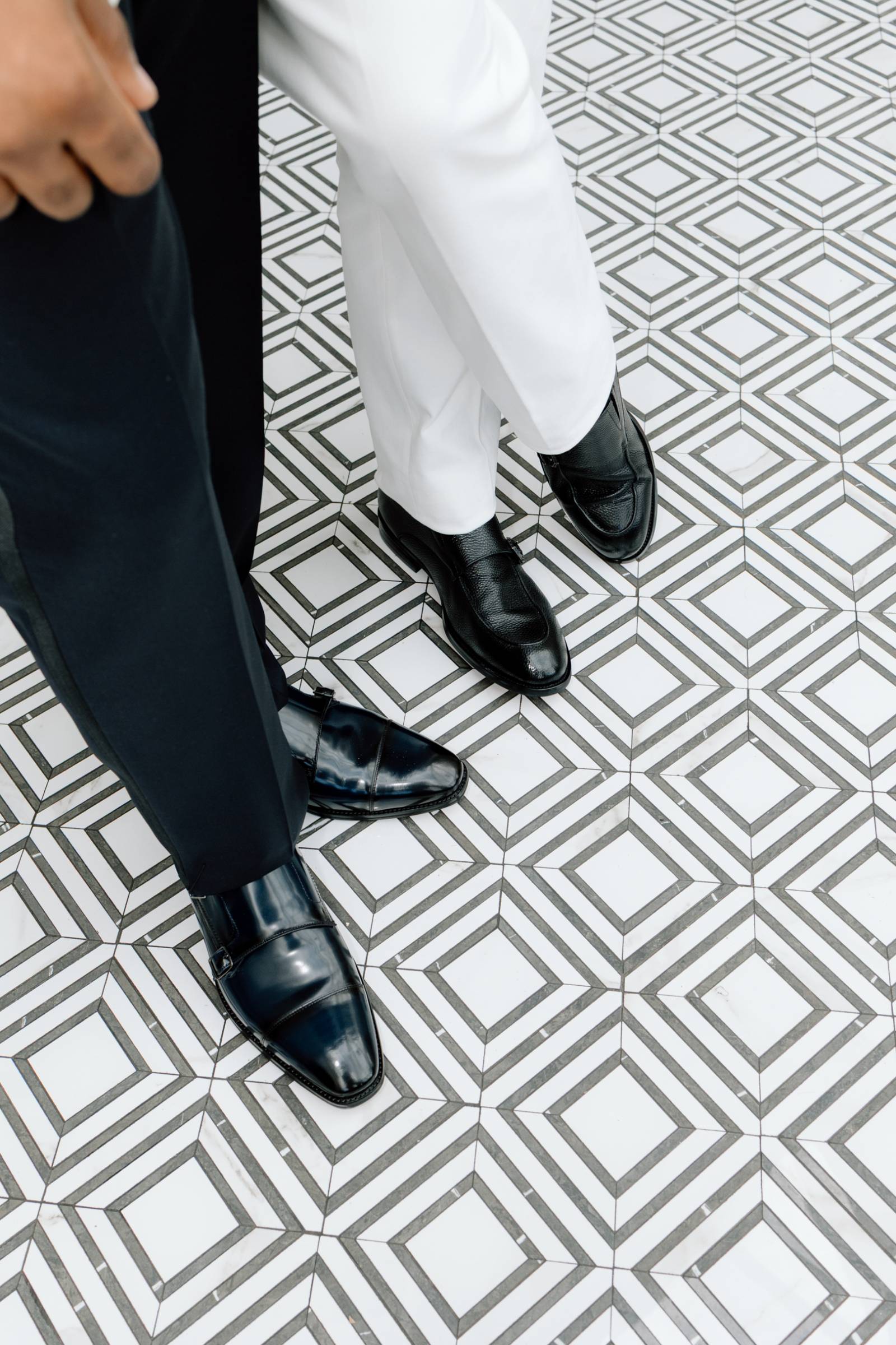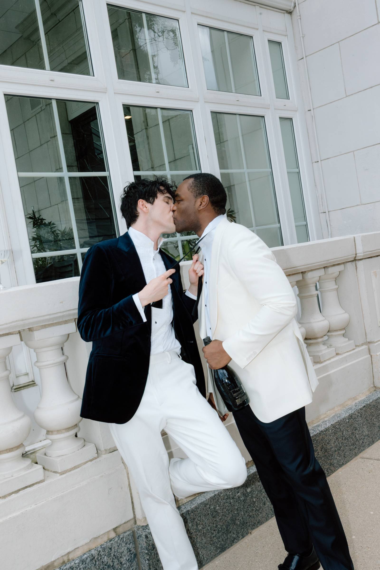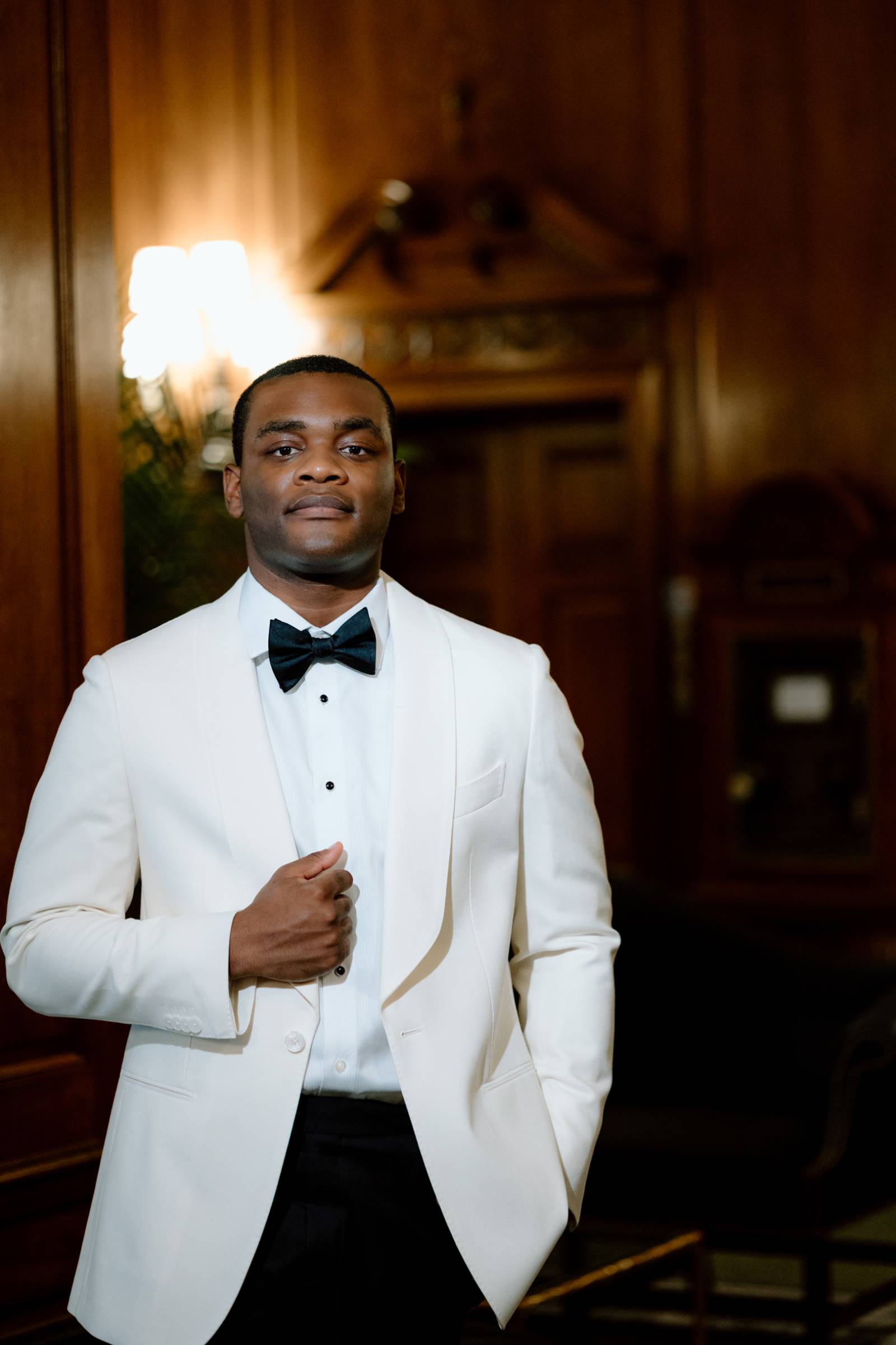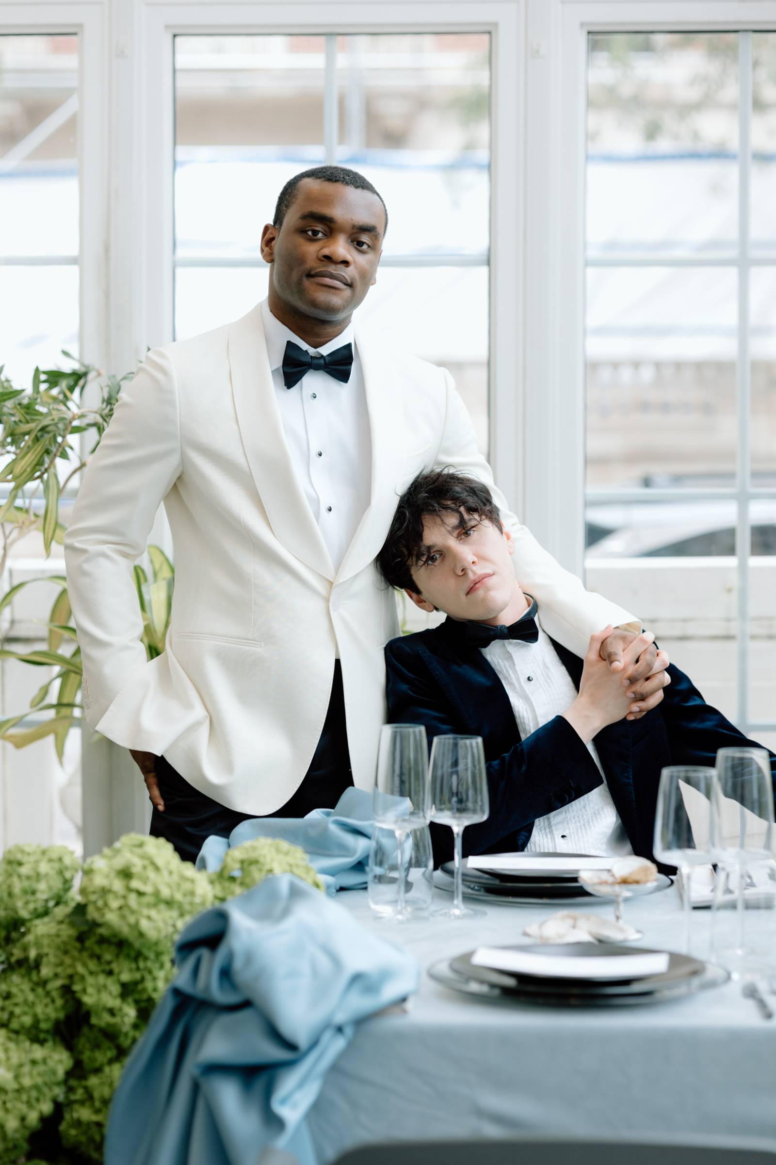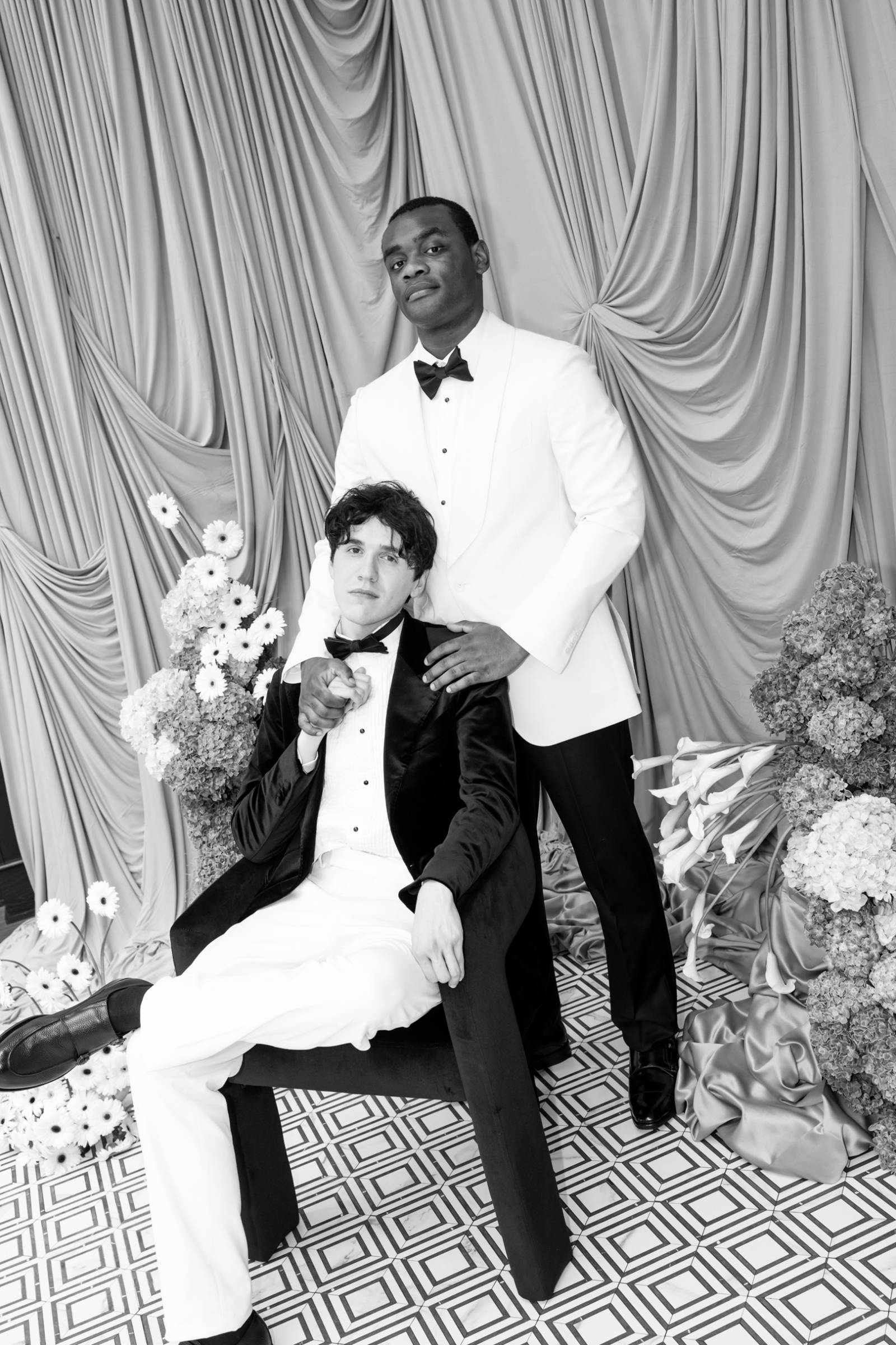 Teak & Ivory Bridal styled the grooms for the day, selecting coordinating, yet personal and unique pieces for each model. Harrison wore a blue velvet suit jacket, white pants, a white, pleated undershirt with black buttons, black shoes, and a black bowtie.