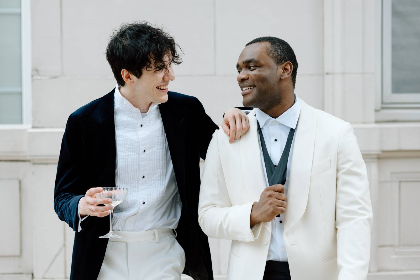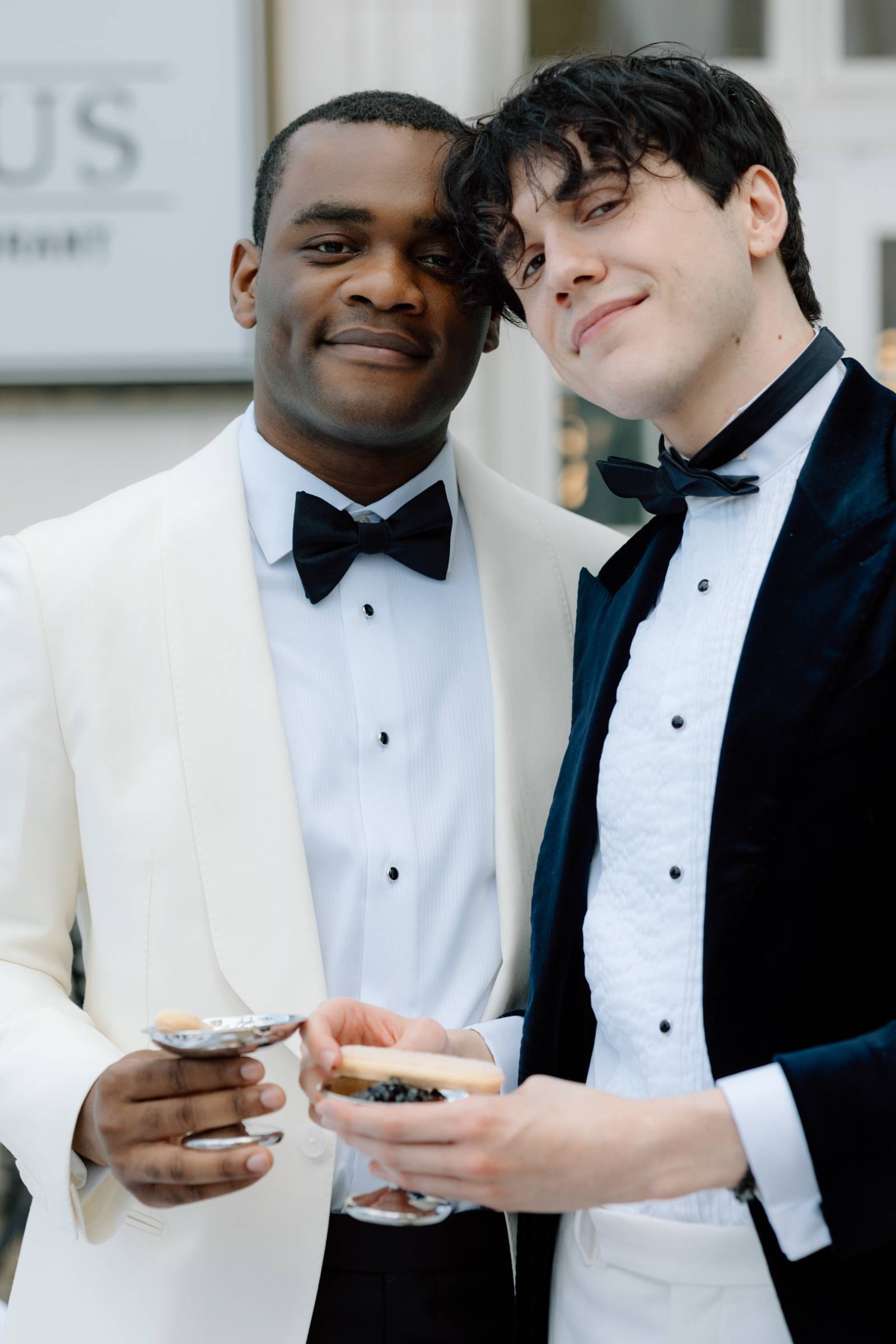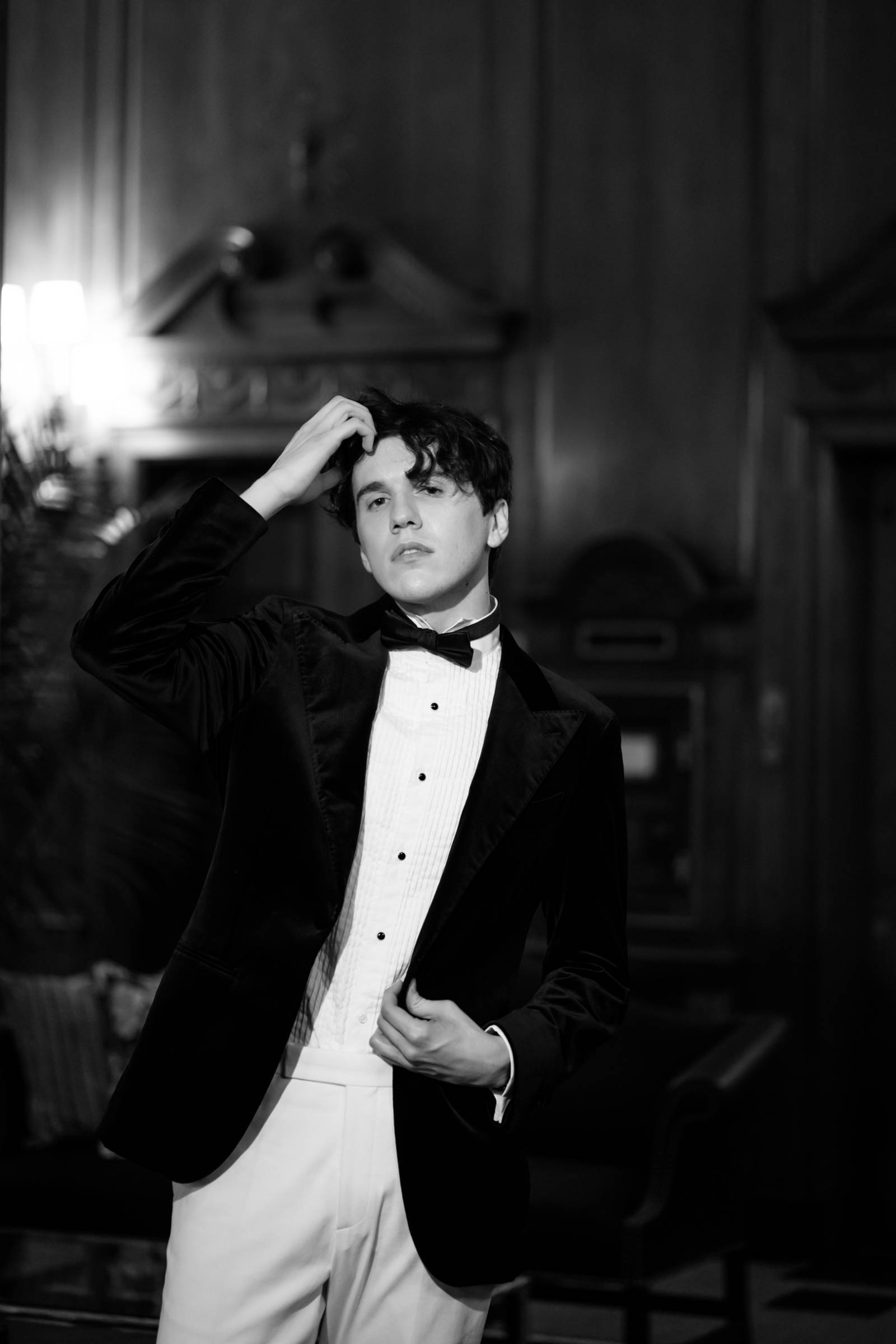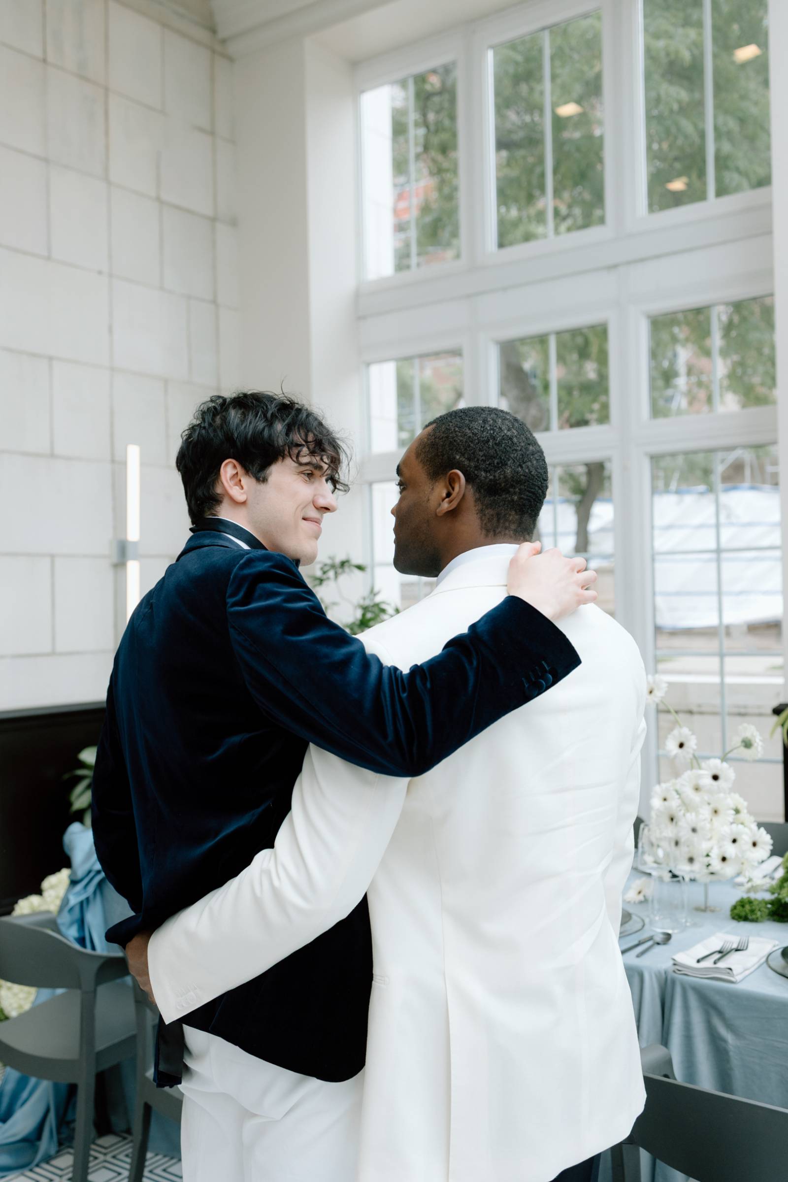 Teak & Ivory Bridal styled the grooms for the day, selecting coordinating, yet personal and unique pieces for each model. Harrison wore a blue velvet suit jacket, white pants, a white, pleated undershirt with black buttons, black shoes, and a black bowtie.