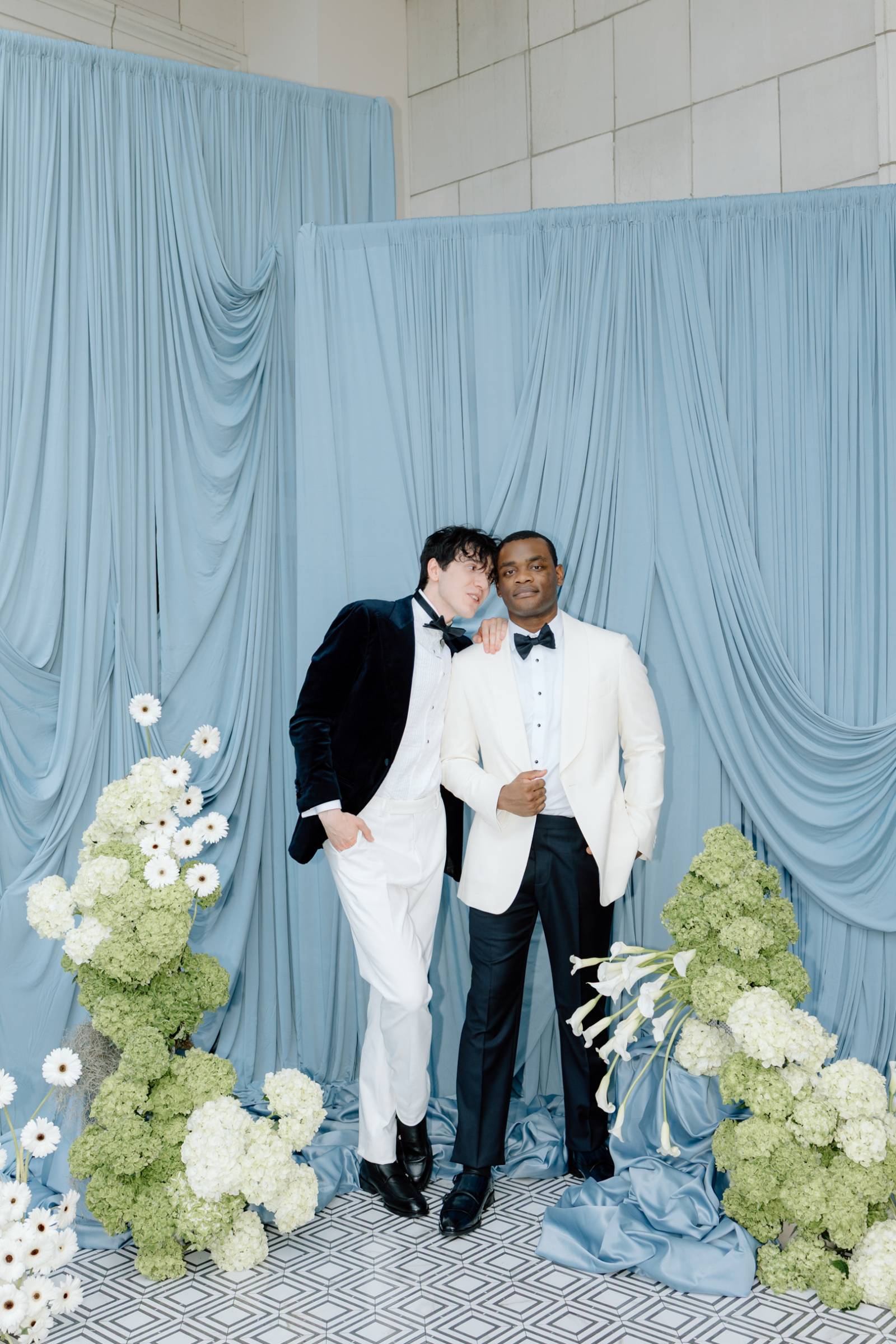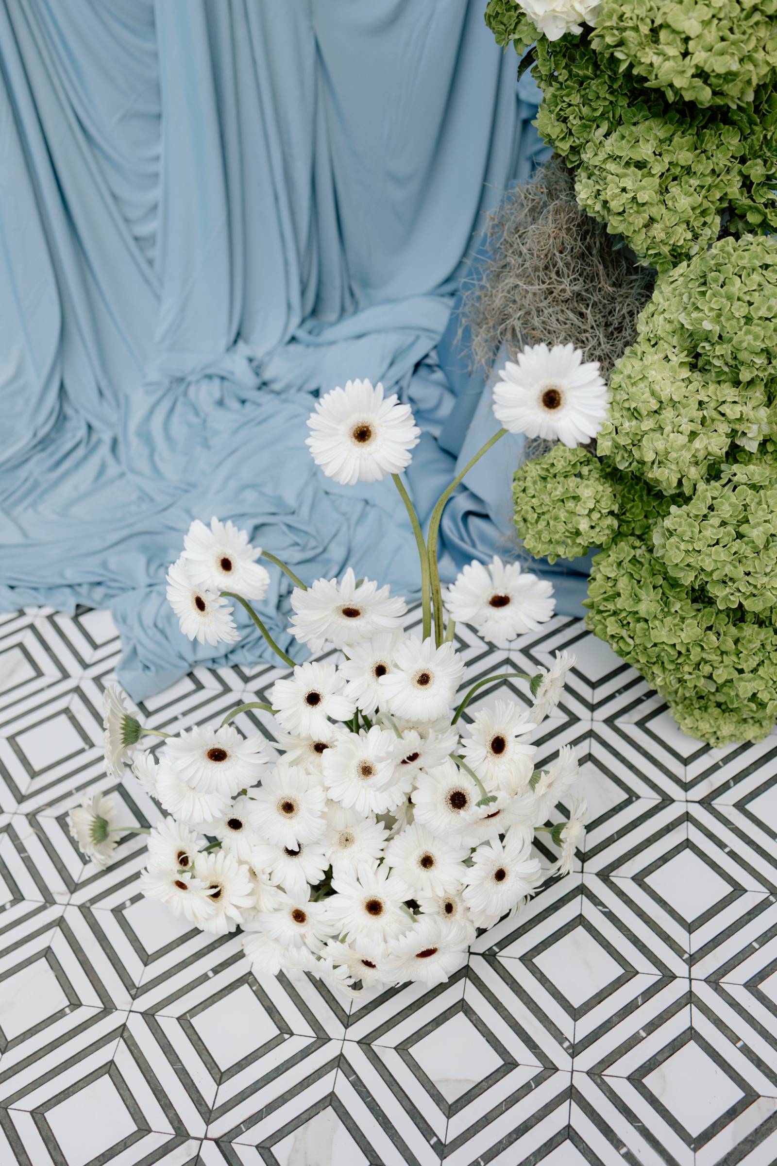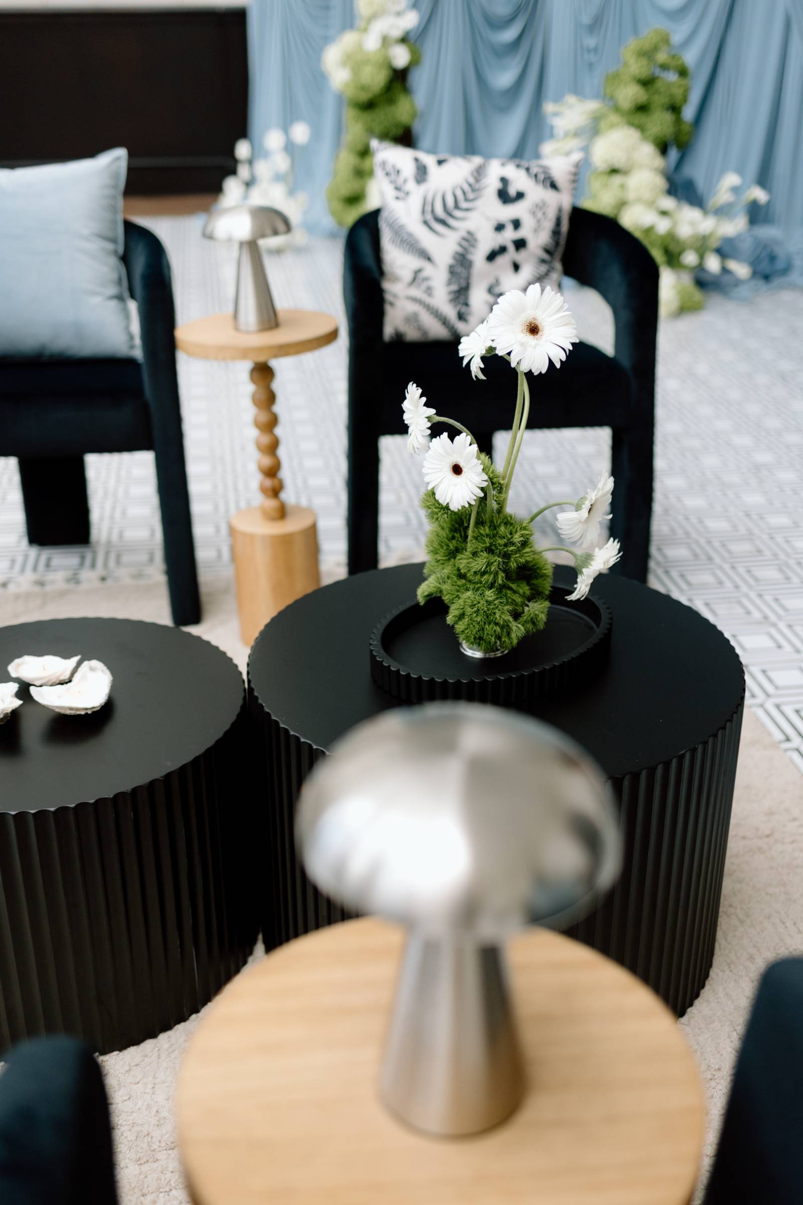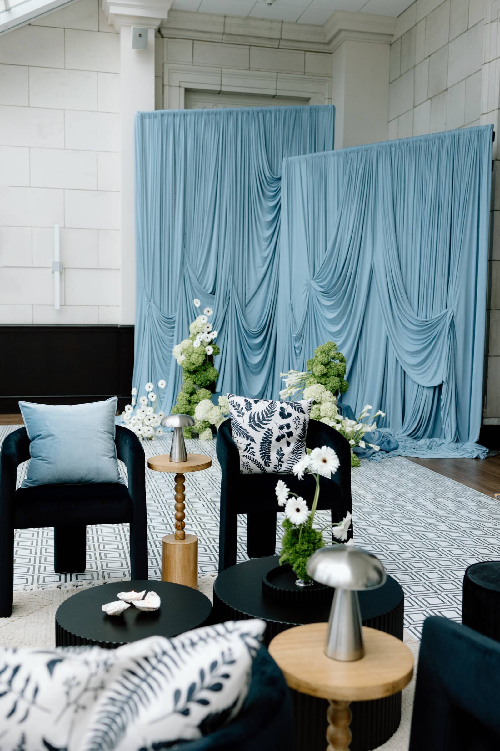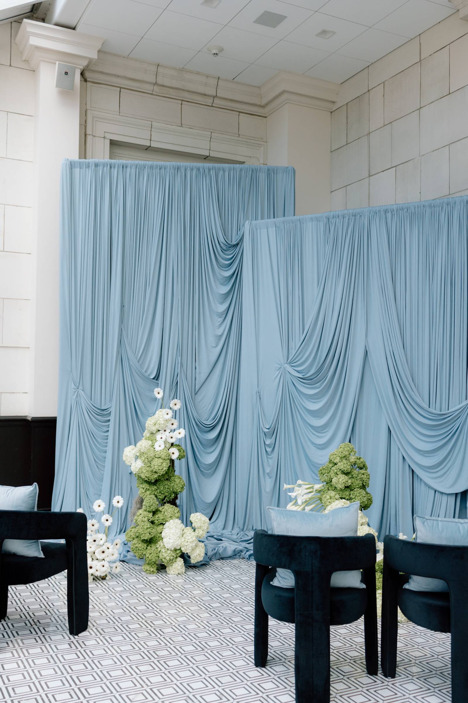 The ceremony space featured elegant blue draping backdrops, cozy seating, and an asymmetrical ground floral arch. Yer Flora kept the florals lush, but clean, alternating large installments with bud vases and simple arrangements. The main florals included calla lilies, white gerbera daisies, white and green hydrangeas, and mossy greenery.