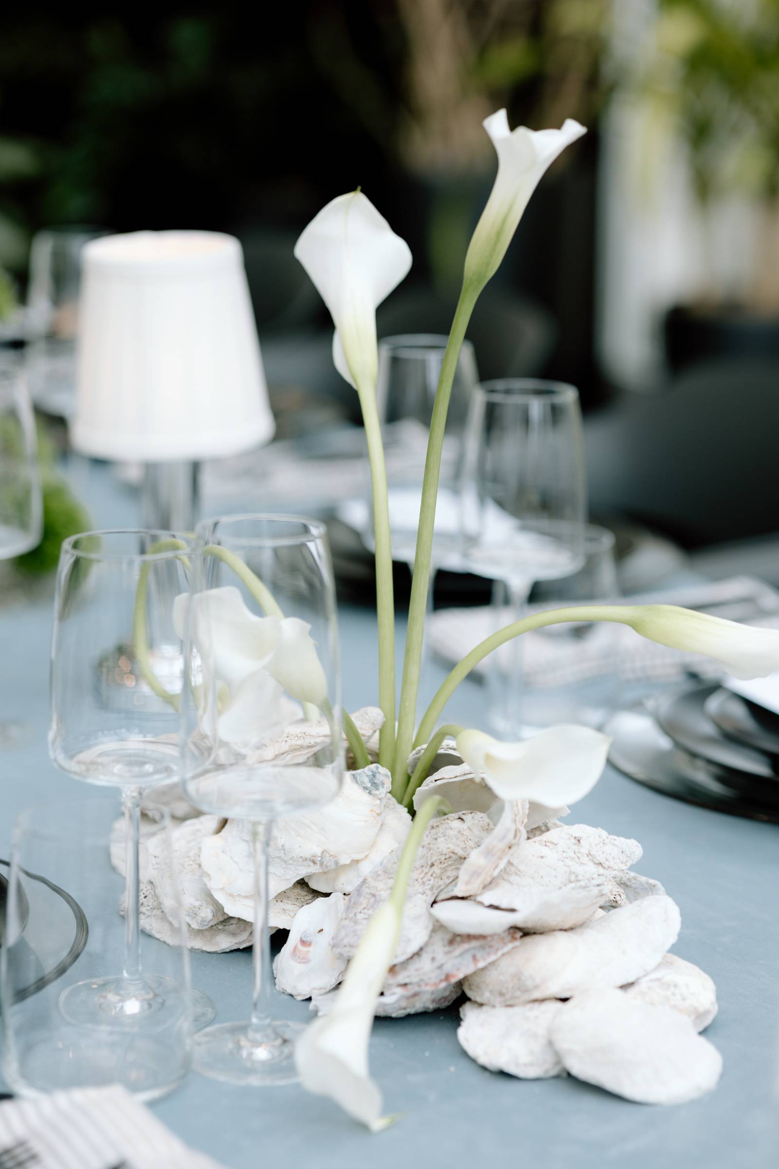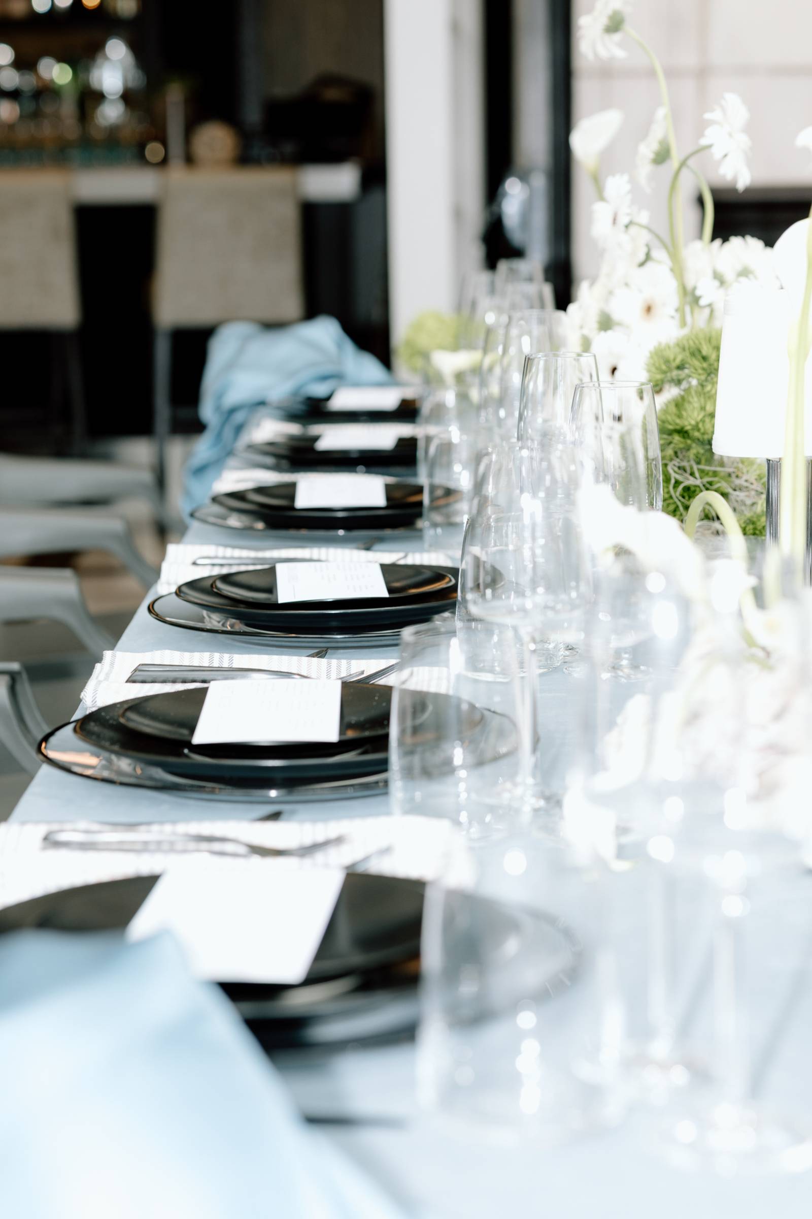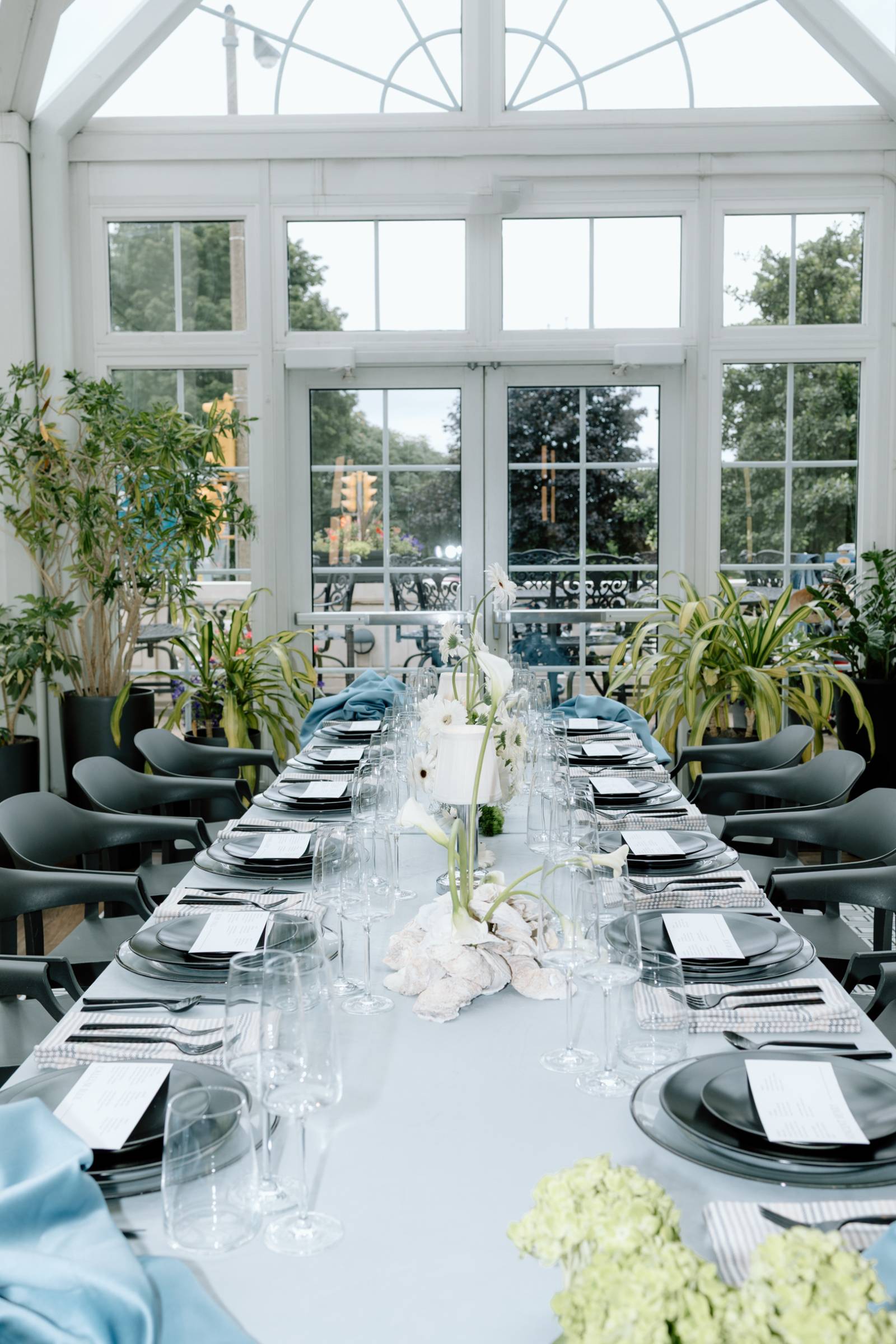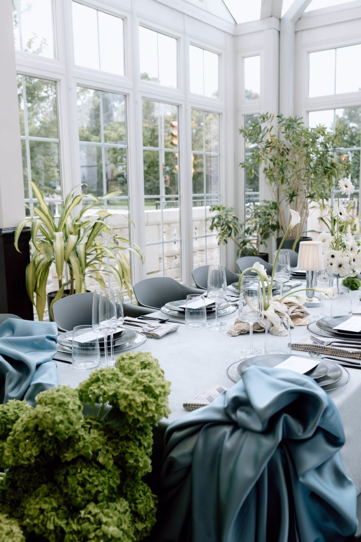 The tablescape, set up in Bacchus’s glass-enclosed Conservatory, was full of abundant light and luxurious details. The table was draped with blue linens from Nuage Designs, with a lighter color as the central linen and darker, artful pieces draping from either side. Event Essentials provided plating and crystal glassware for the design, including chargers, black plates, and silverware. Small lamps, artful shells, custom menus, and florals completed the tabletop décor.