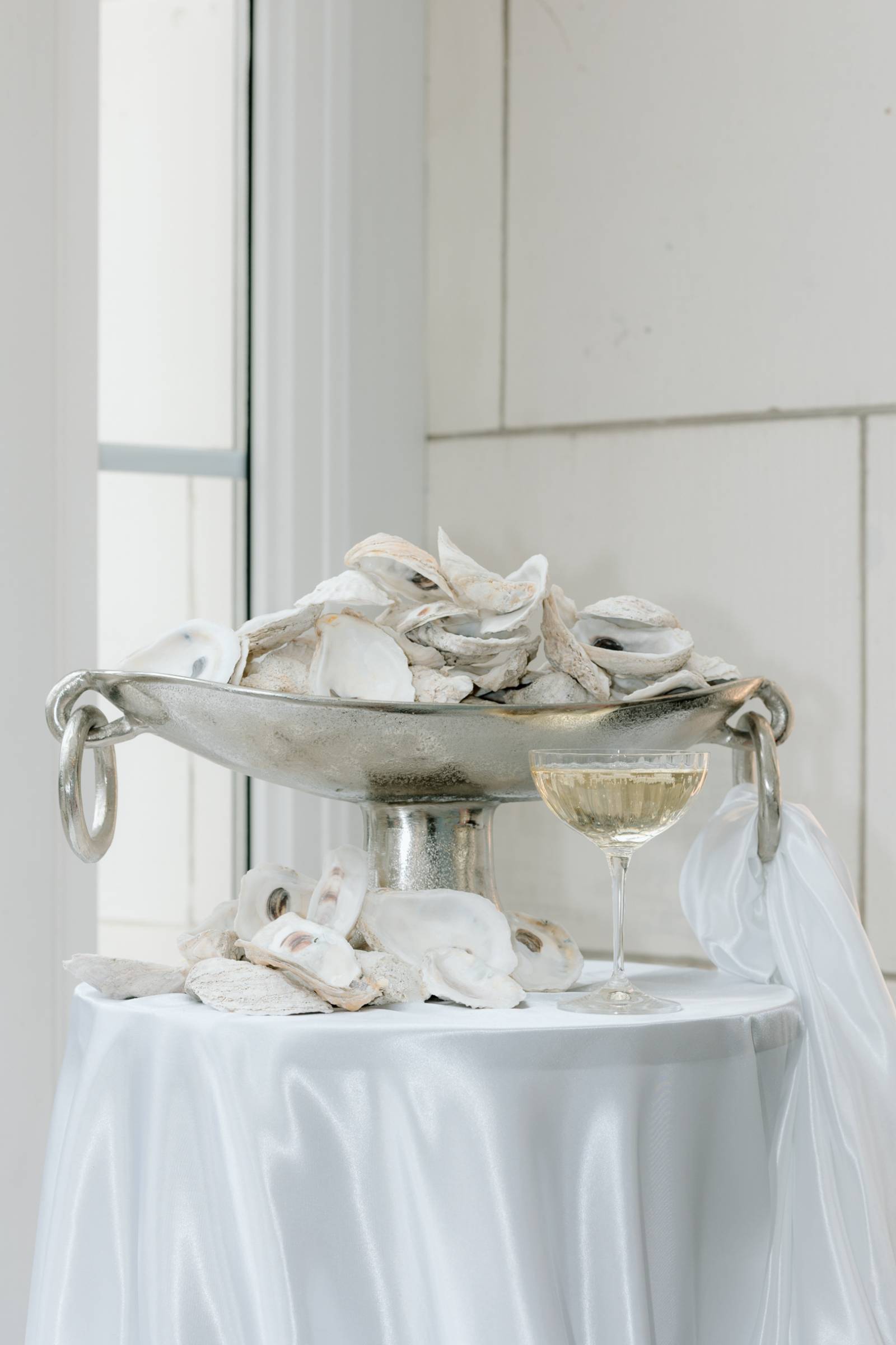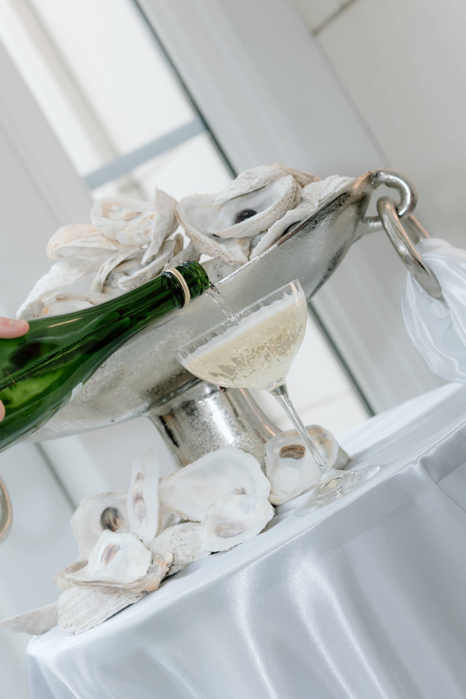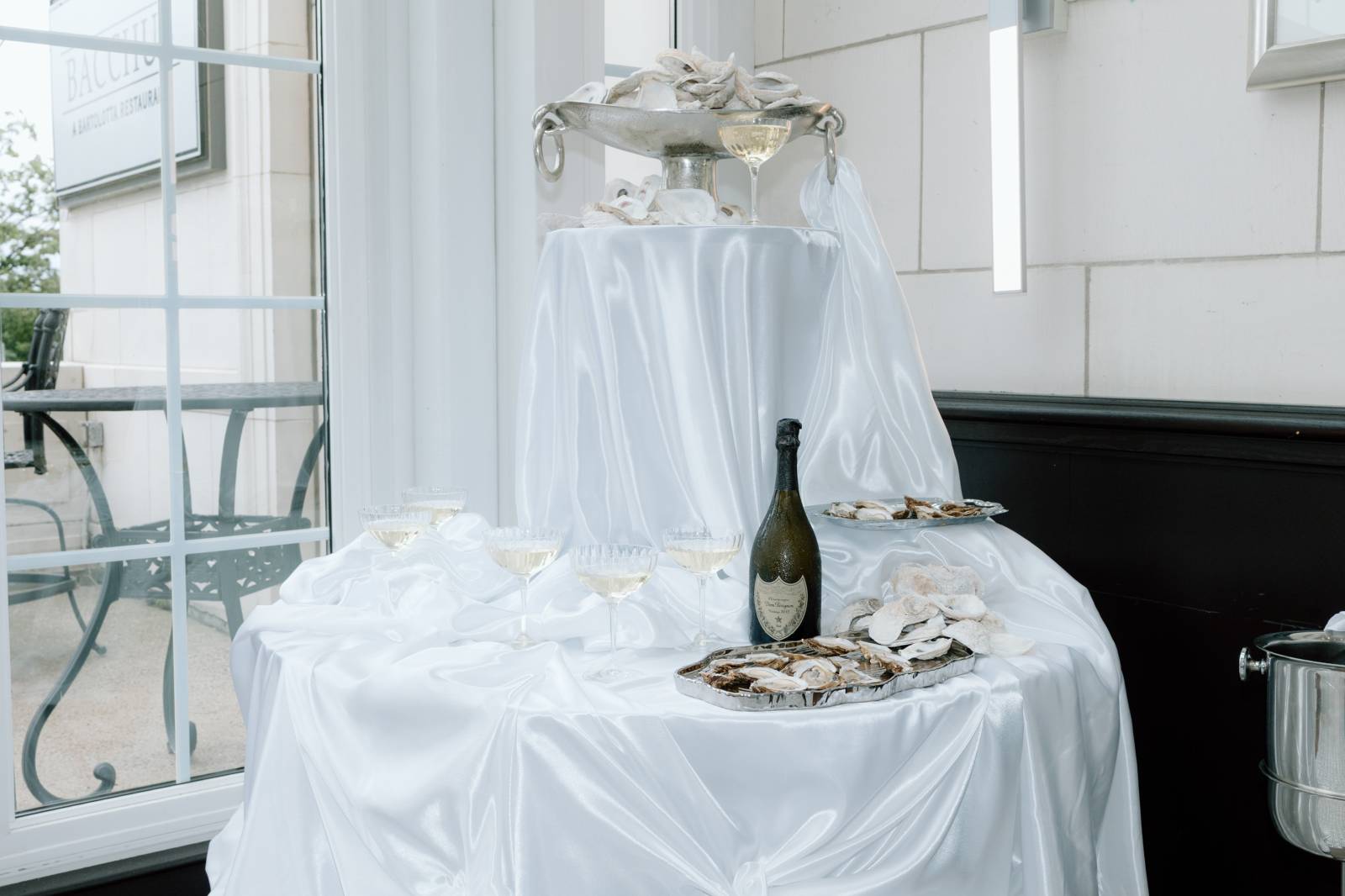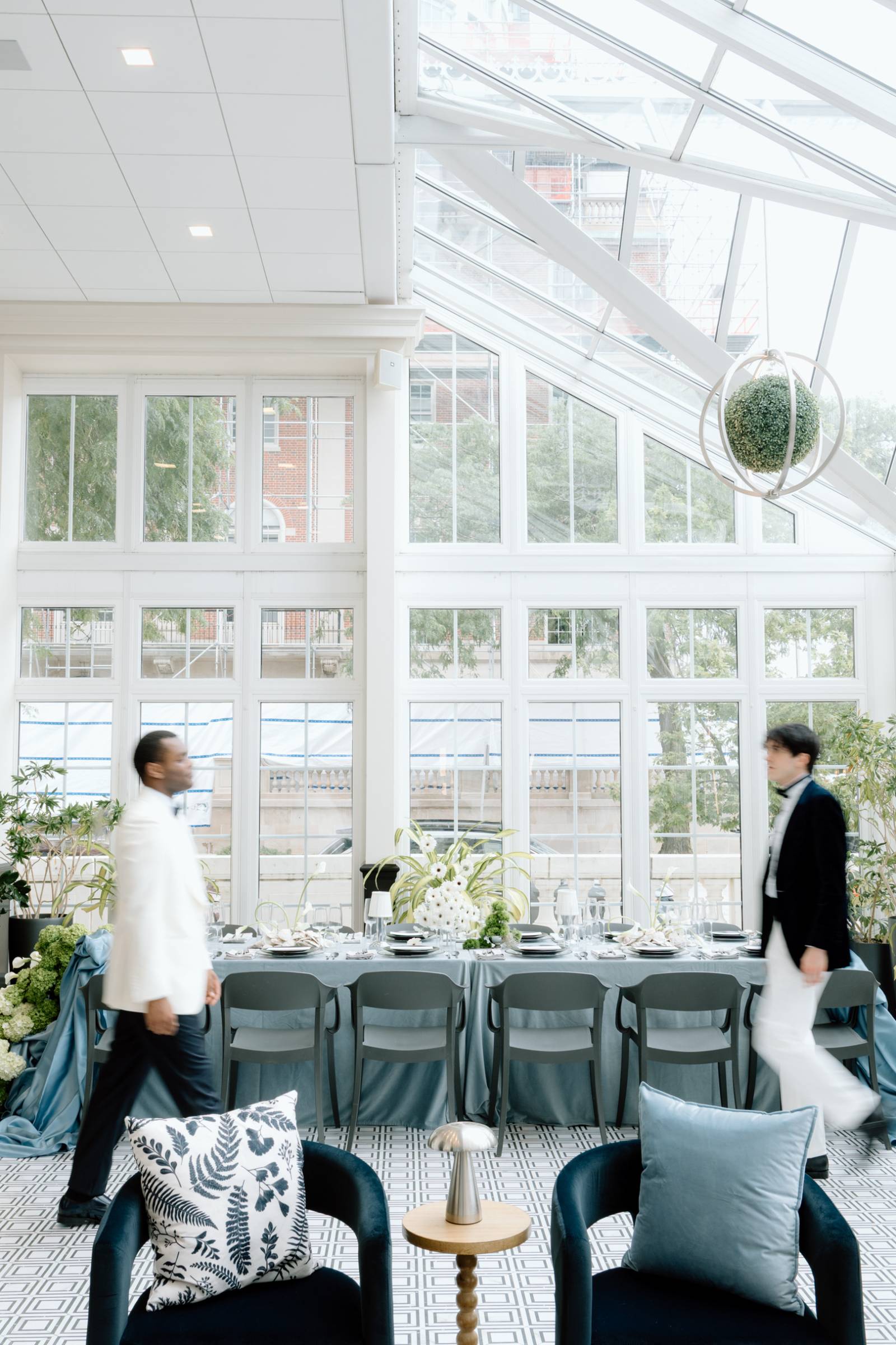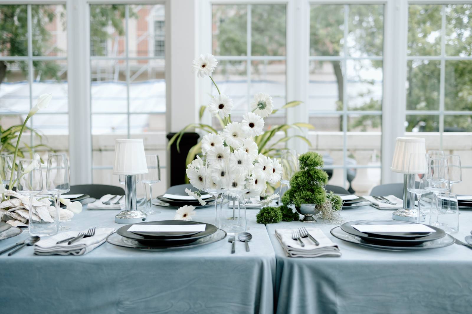 The tablescape, set up in Bacchus’s glass-enclosed Conservatory, was full of abundant light and luxurious details. The table was draped with blue linens from Nuage Designs, with a lighter color as the central linen and darker, artful pieces draping from either side. Event Essentials provided plating and crystal glassware for the design, including chargers, black plates, and silverware. Small lamps, artful shells, custom menus, and florals completed the tabletop décor.