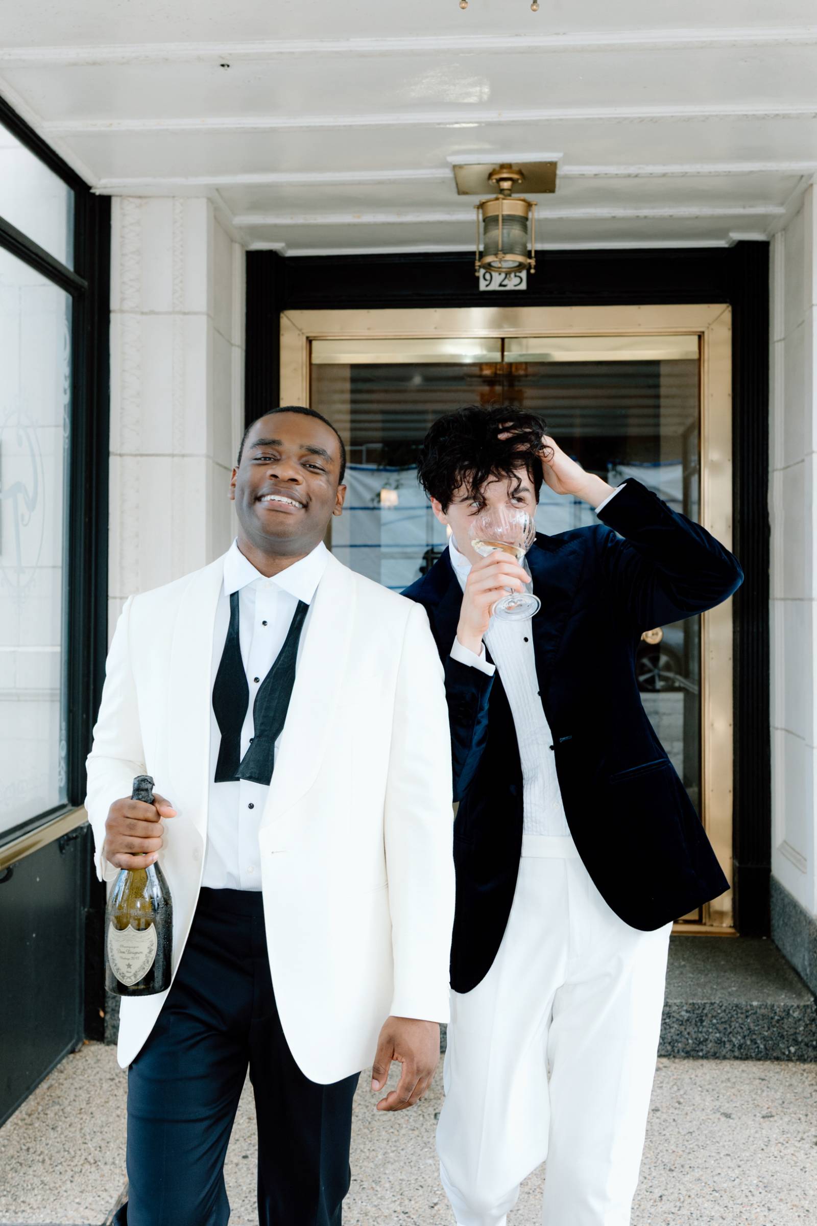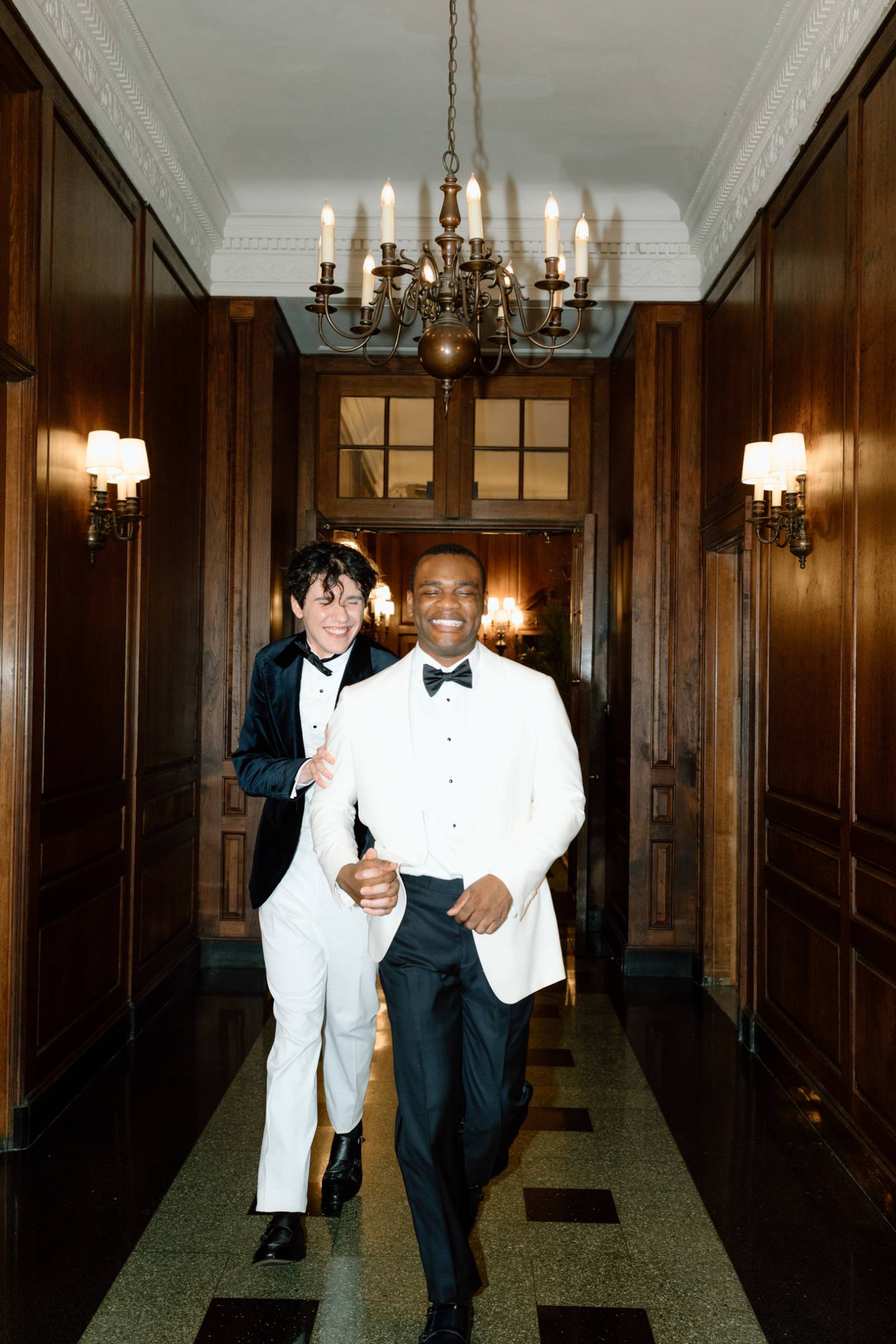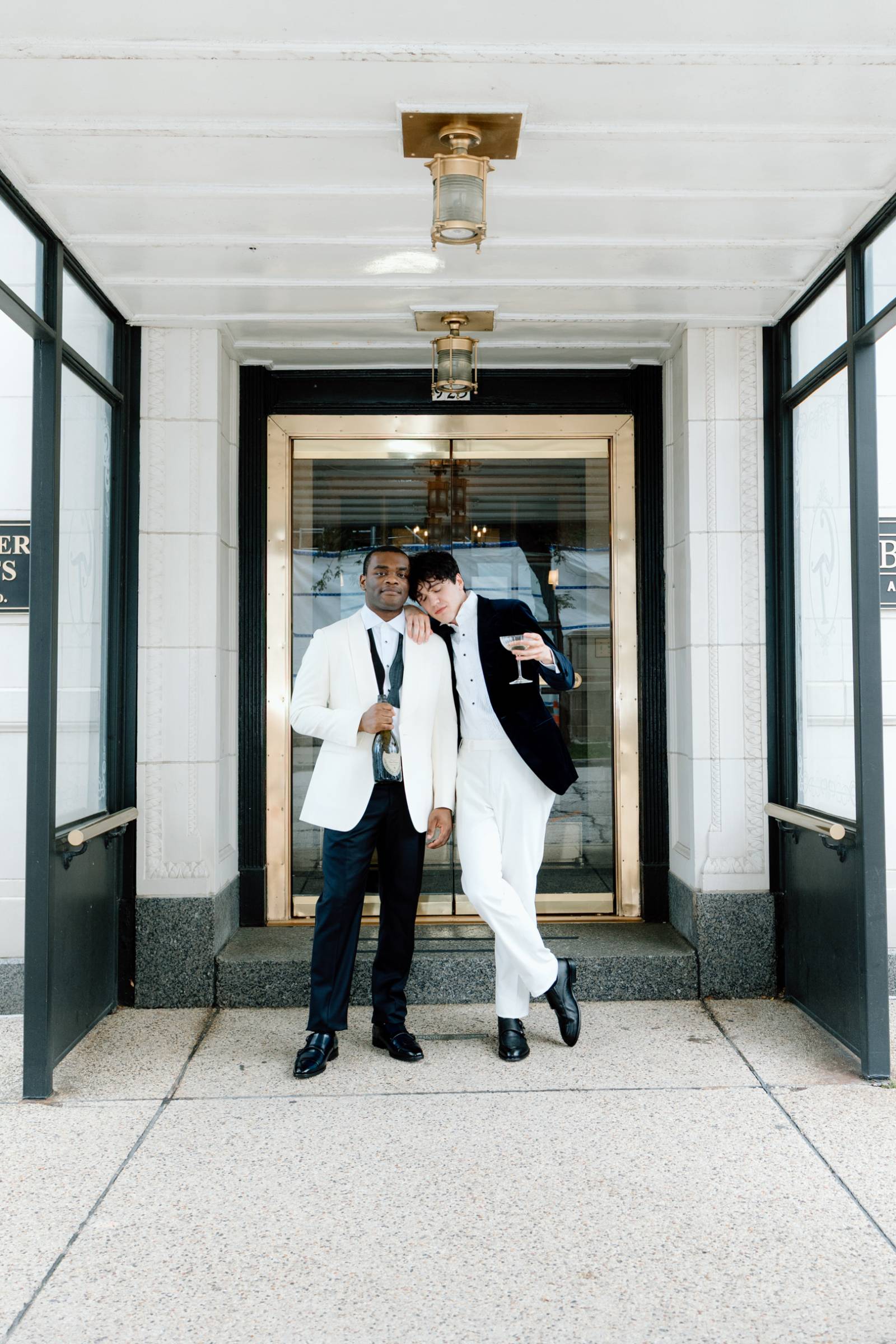 The couple raised a toast in coupe glasses provided by Cordial Co. before exploring additional outdoor and indoor spaces at Bacchus. The exceptional downtown Milwaukee restaurant not only boasts award-winning cuisine, but architectural backdrops suited for any taste. The styled shoot concluded with individual and couple portraits framed by warm chandeliers and wooden paneling, showcasing the building’s rich history.