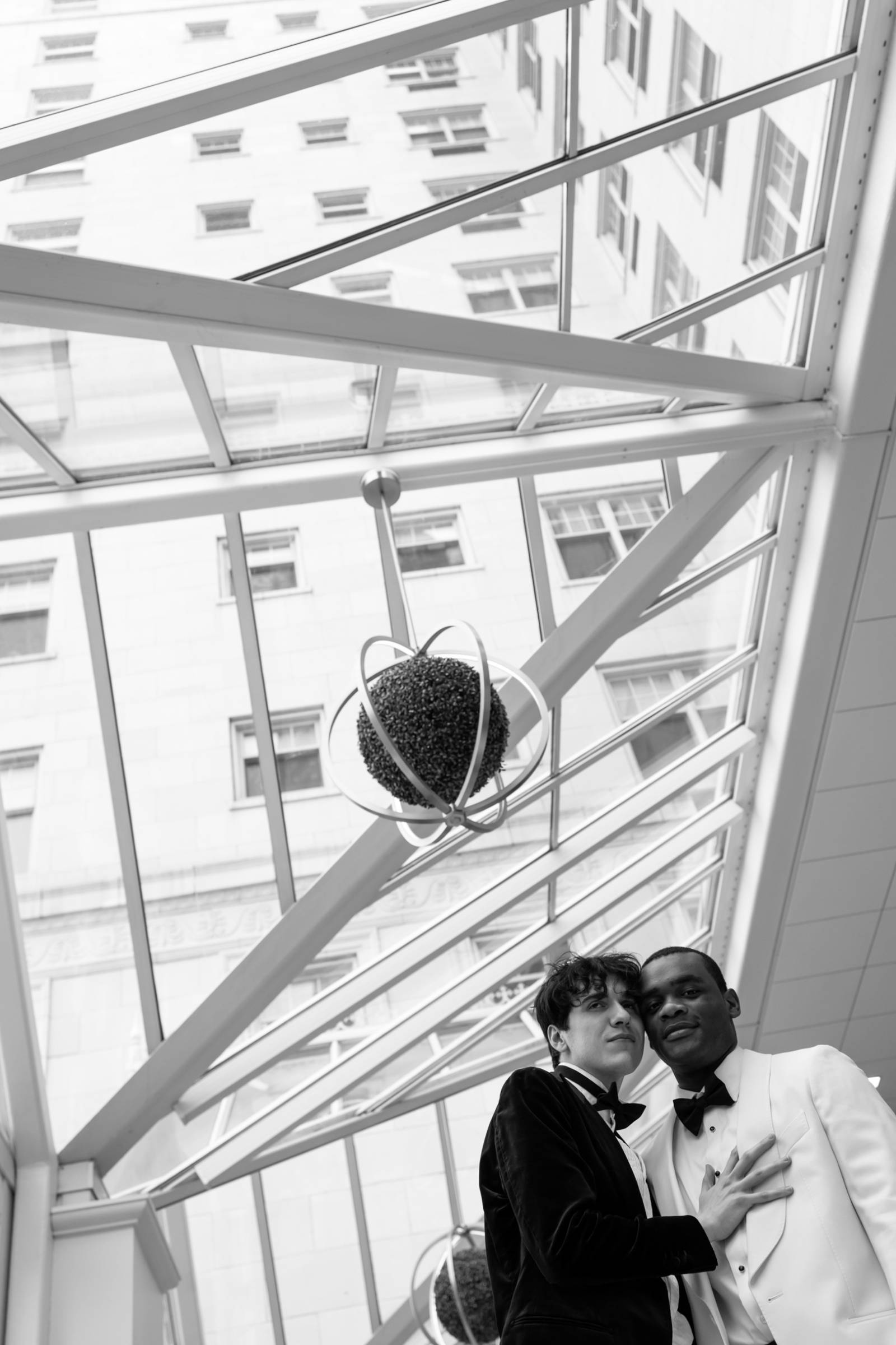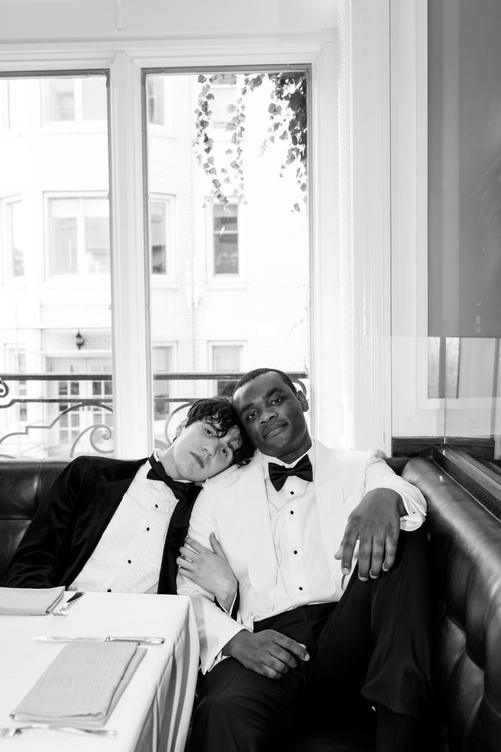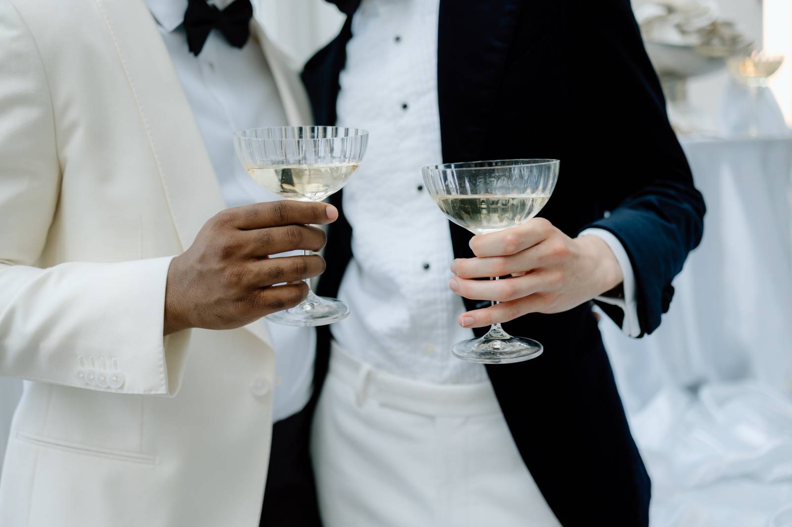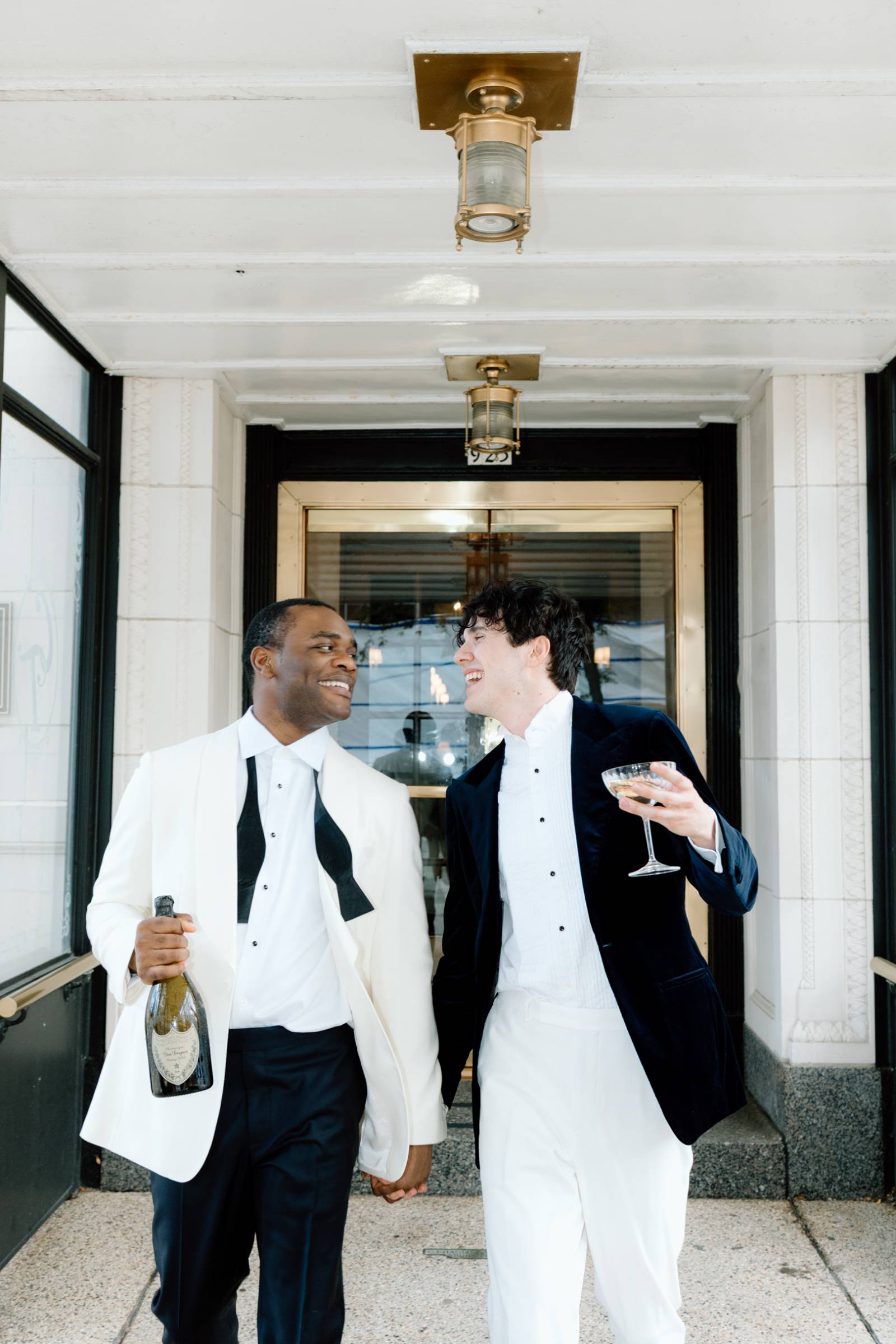 The couple raised a toast in coupe glasses provided by Cordial Co. before exploring additional outdoor and indoor spaces at Bacchus. The exceptional downtown Milwaukee restaurant not only boasts award-winning cuisine, but architectural backdrops suited for any taste. The styled shoot concluded with individual and couple portraits framed by warm chandeliers and wooden paneling, showcasing the building’s rich history.