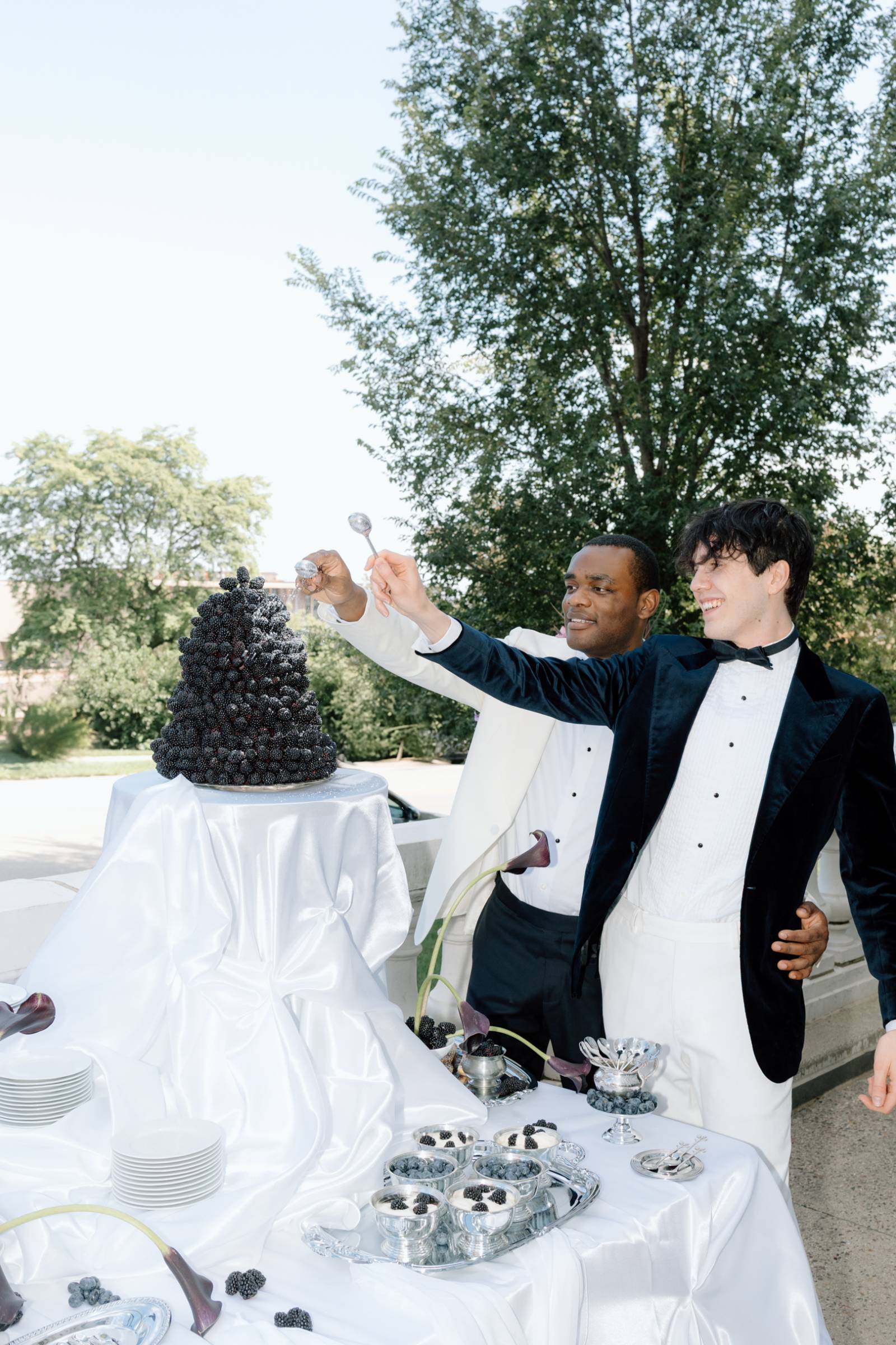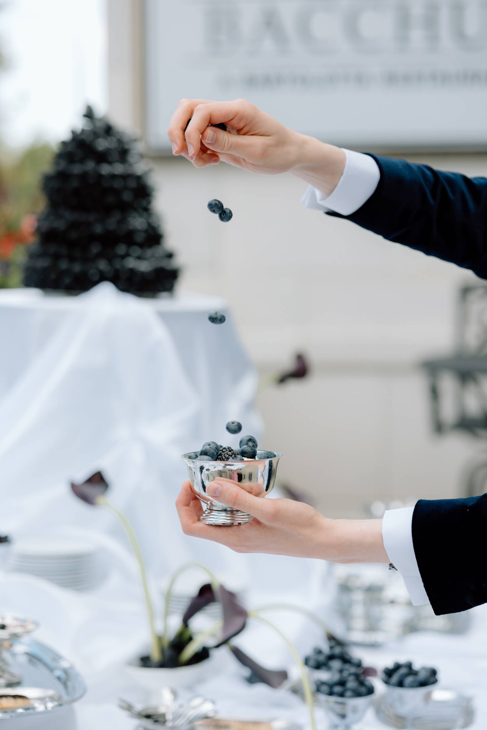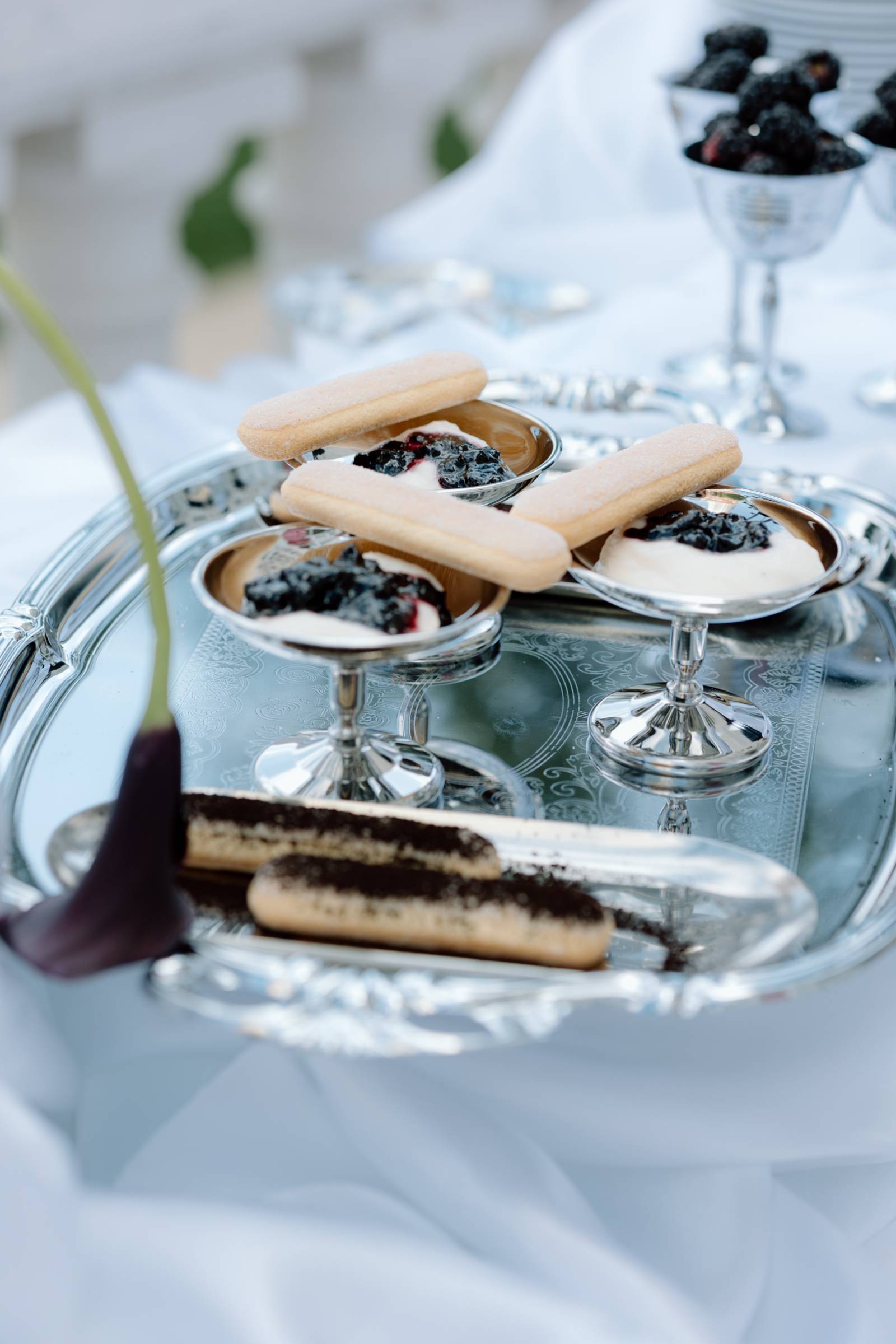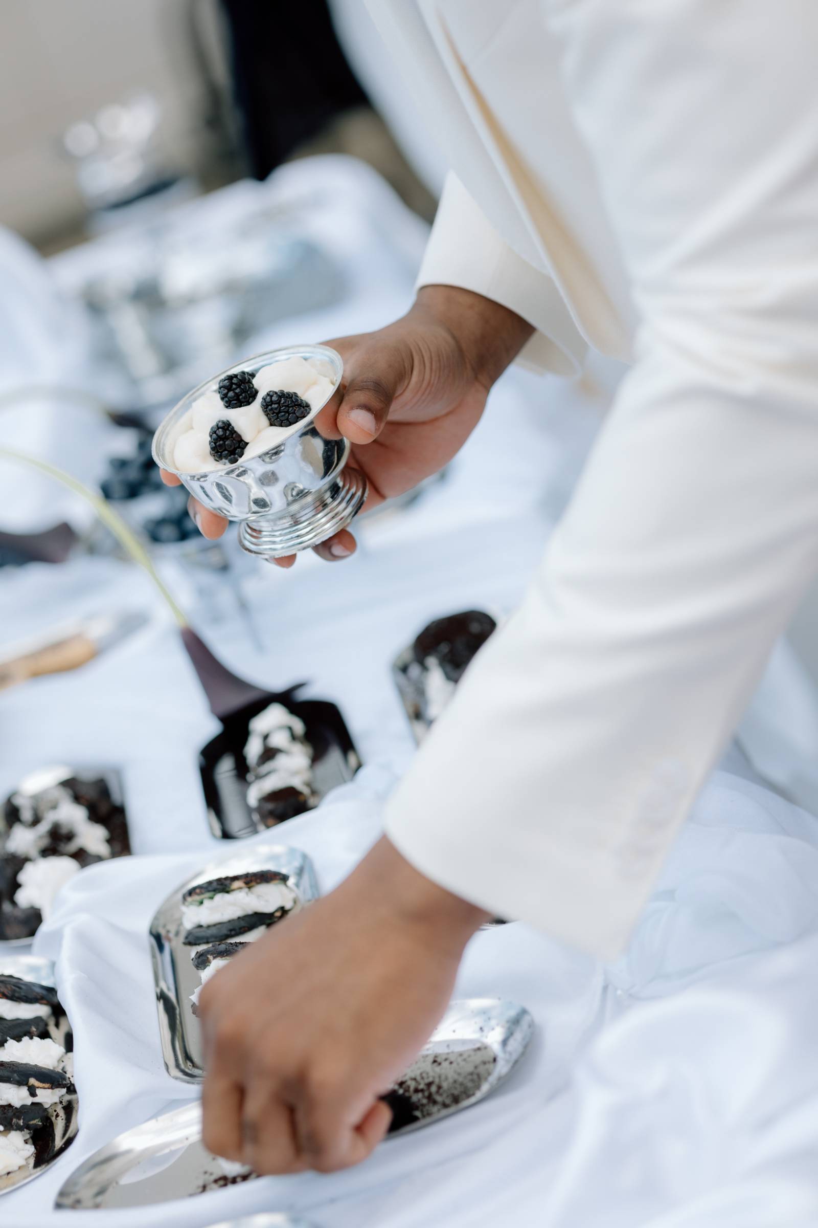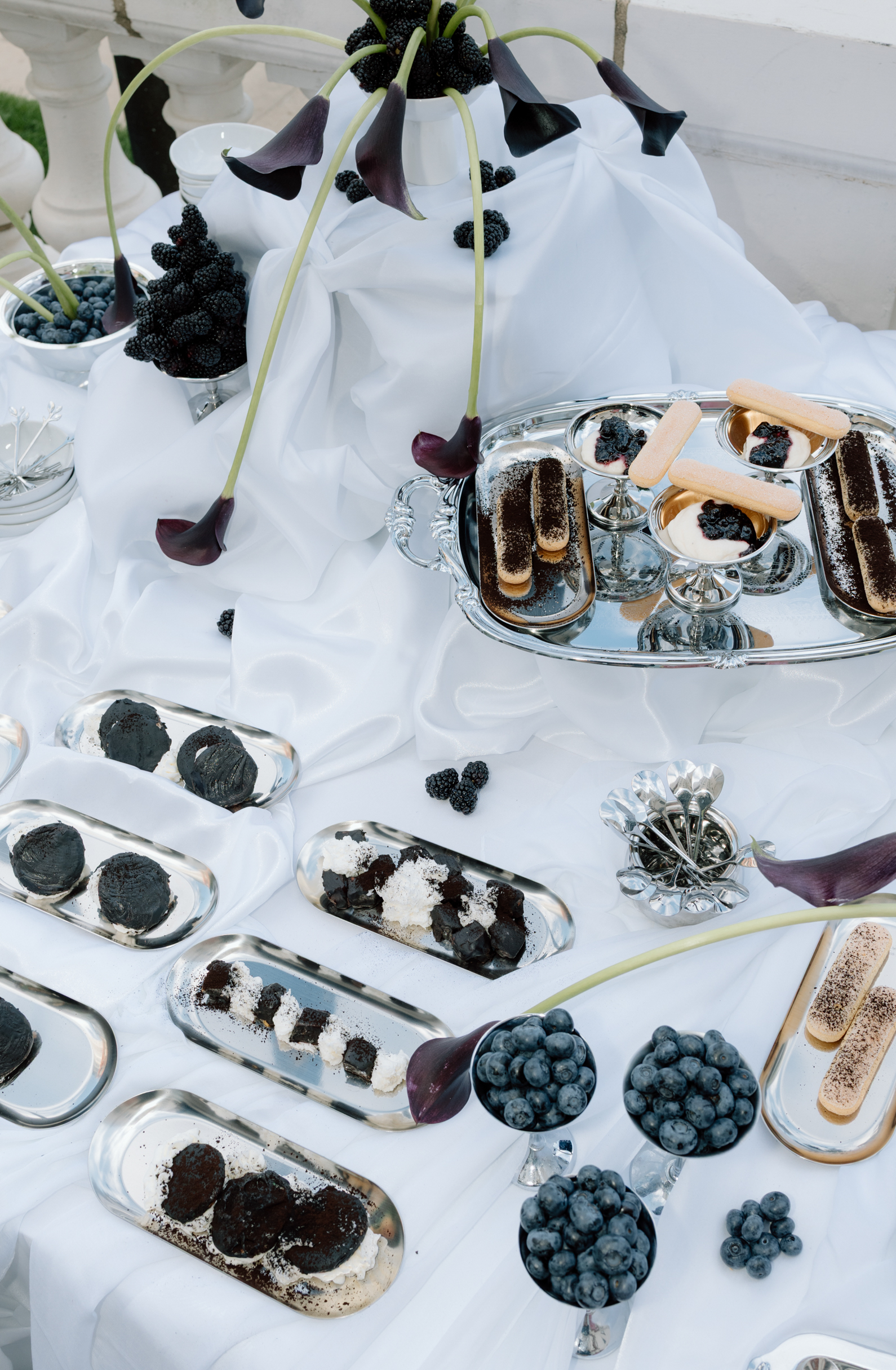 A dessert setup from Events by Manna awaited on the outdoor patio. Here, the palette of light blue, green, white, and navy leaned into darker blues and purples, with a towering blackberry mound cake as the centerpiece. Other desserts included marshmallow cream cups, lady fingers, fresh blackberry and blueberry jams, and dark chocolate dipped sugar cookie and water cookies.