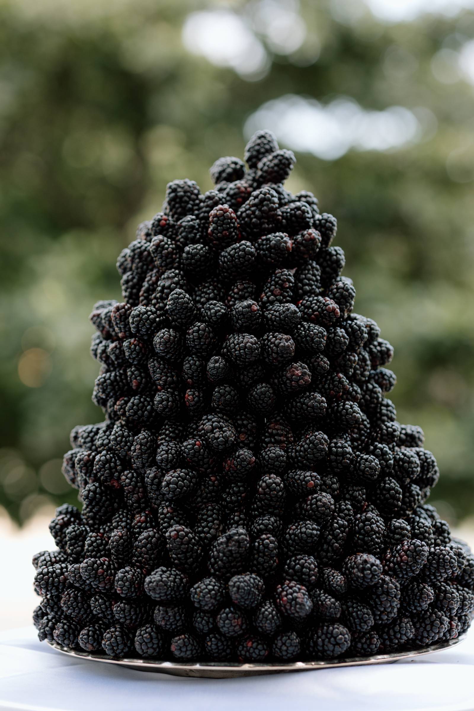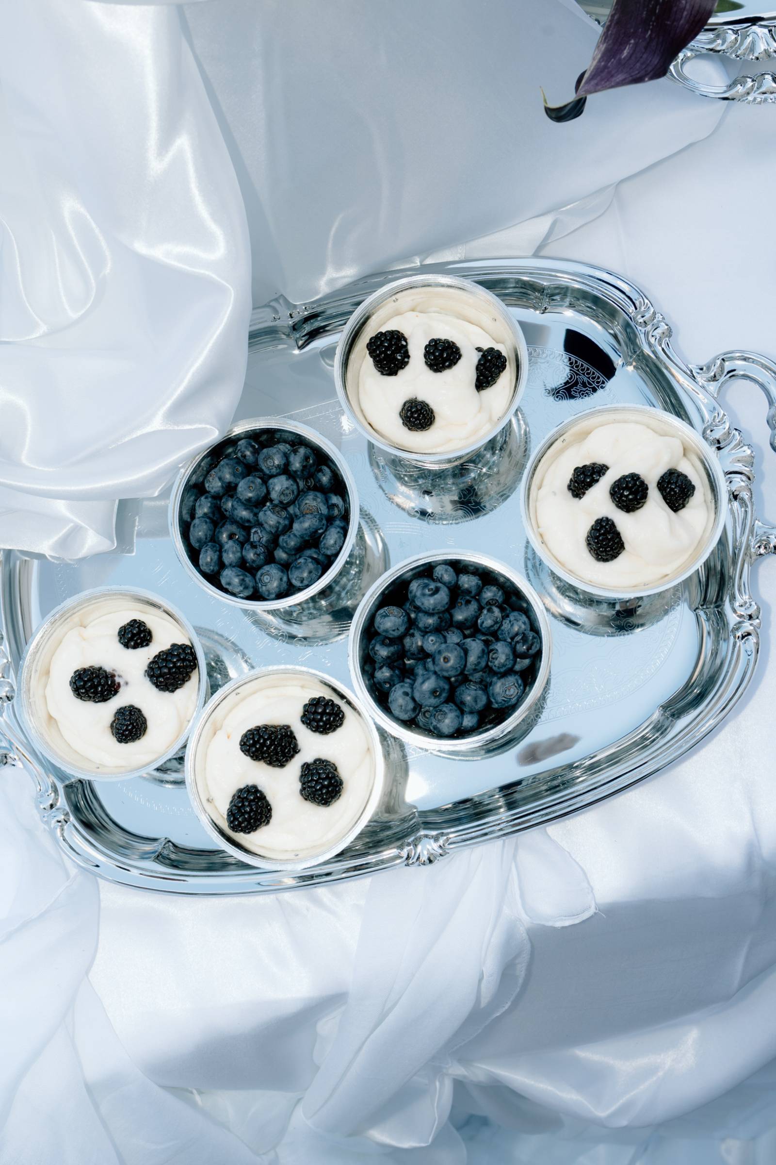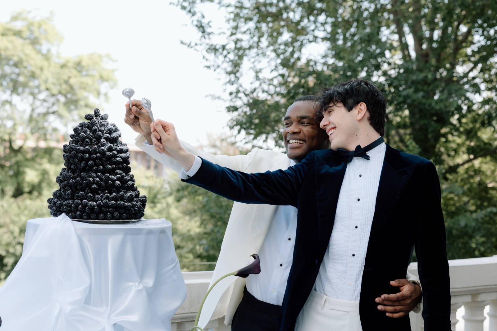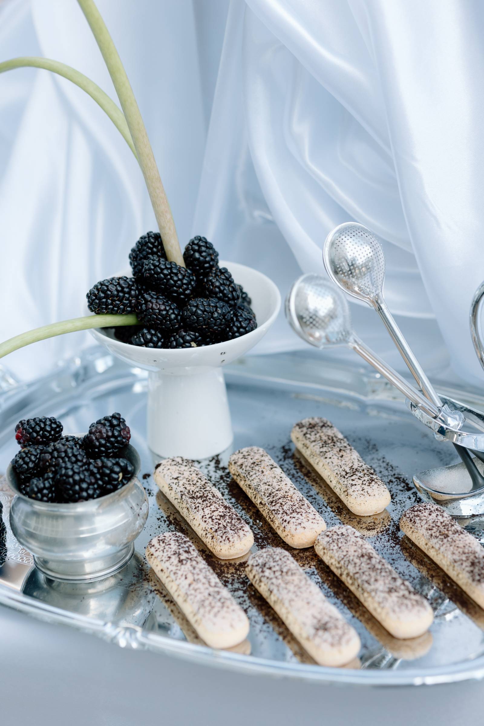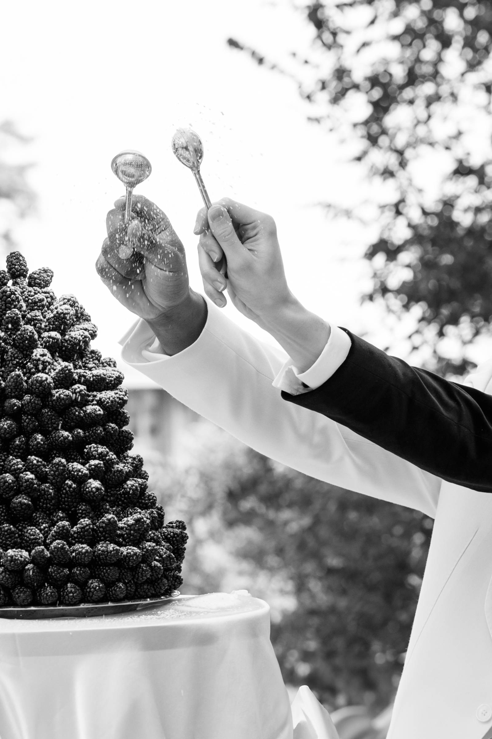 A dessert setup from Events by Manna awaited on the outdoor patio. Here, the palette of light blue, green, white, and navy leaned into darker blues and purples, with a towering blackberry mound cake as the centerpiece. Other desserts included marshmallow cream cups, lady fingers, fresh blackberry and blueberry jams, and dark chocolate dipped sugar cookie and water cookies.