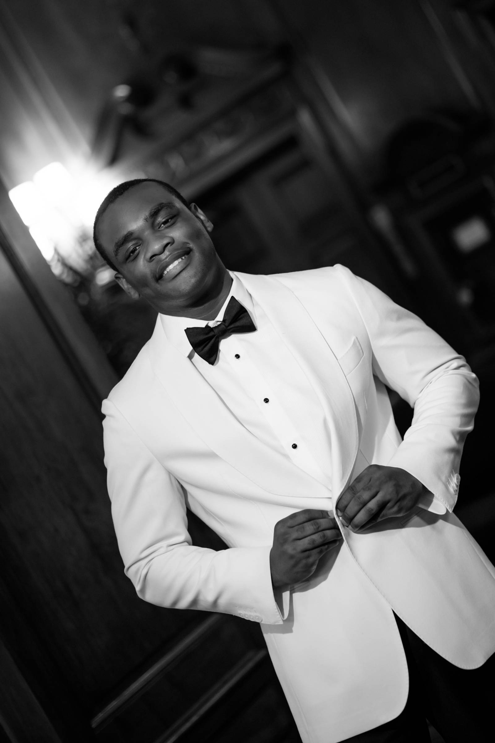 Twonya contrasted with a white suit jacket and navy pants, a white undershirt with black buttons, along with black shoes and a bowtie.