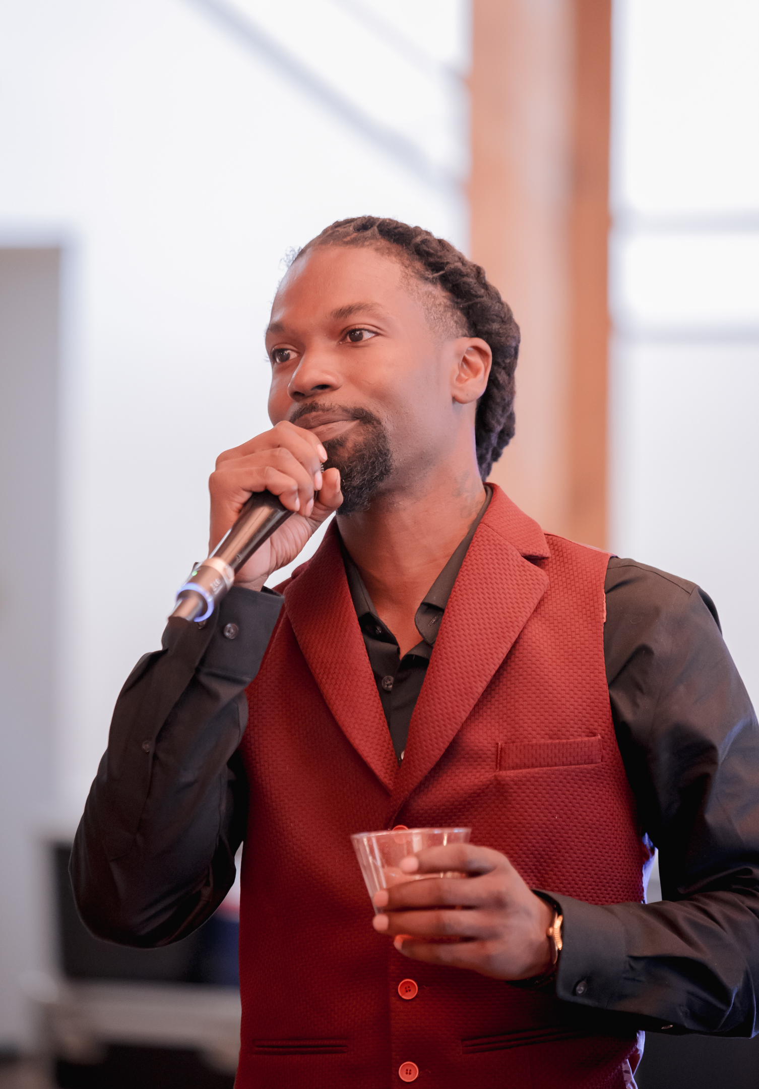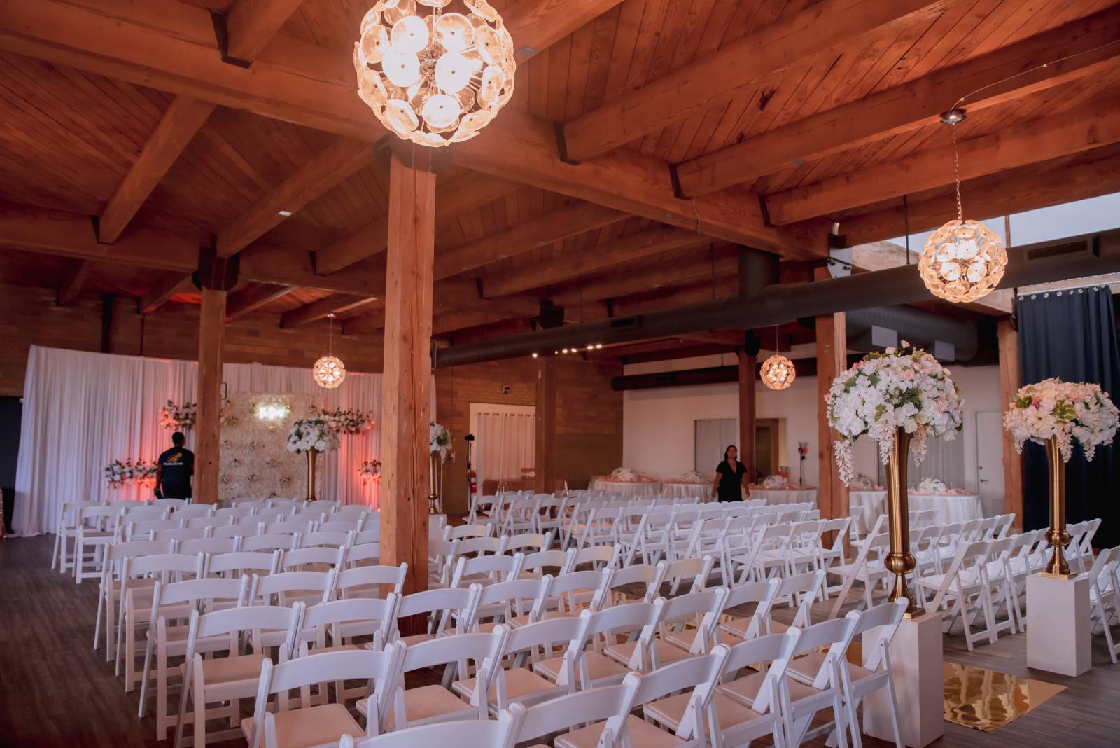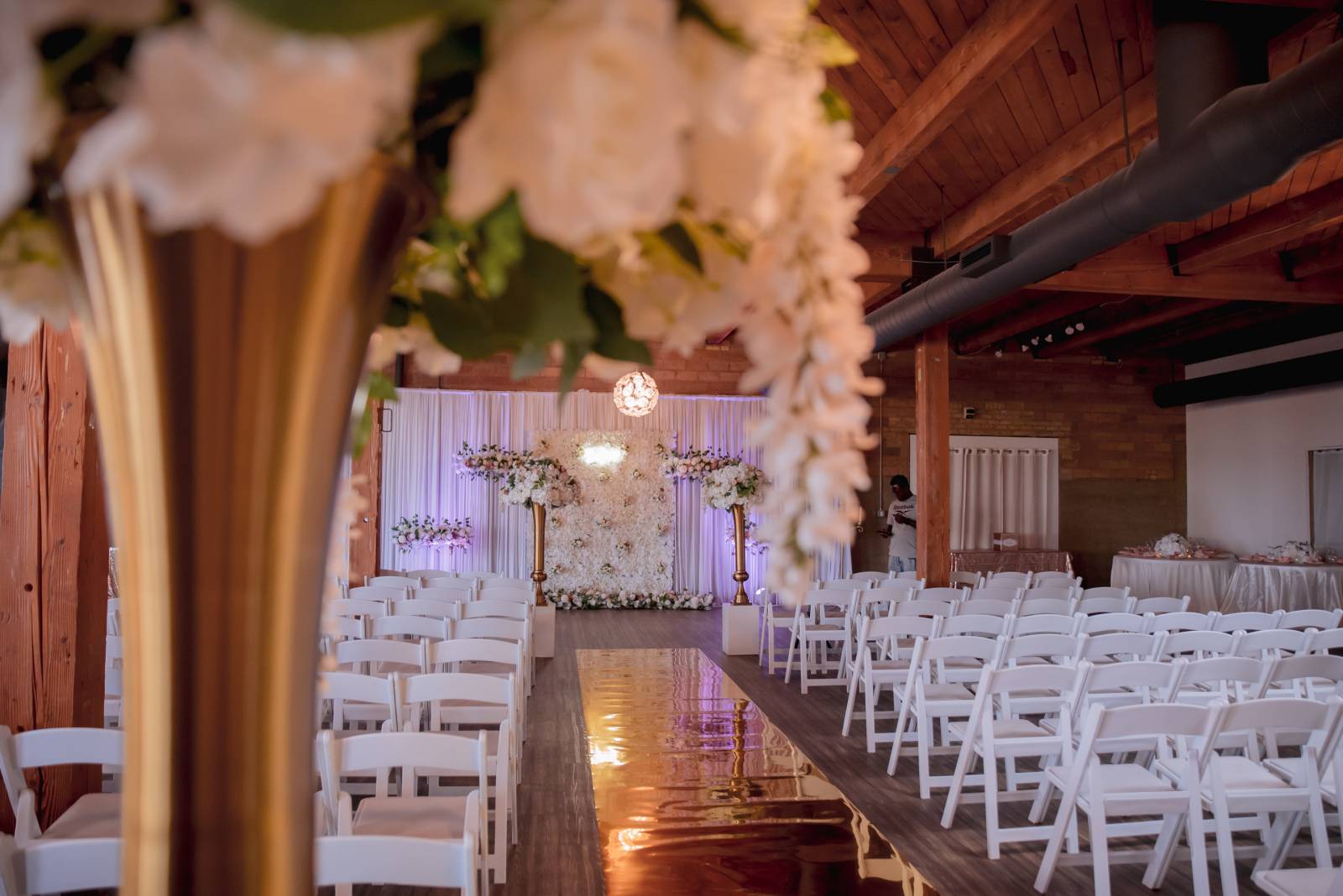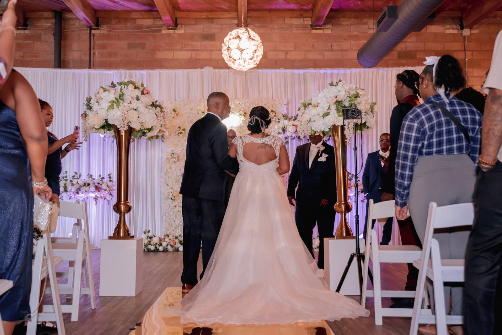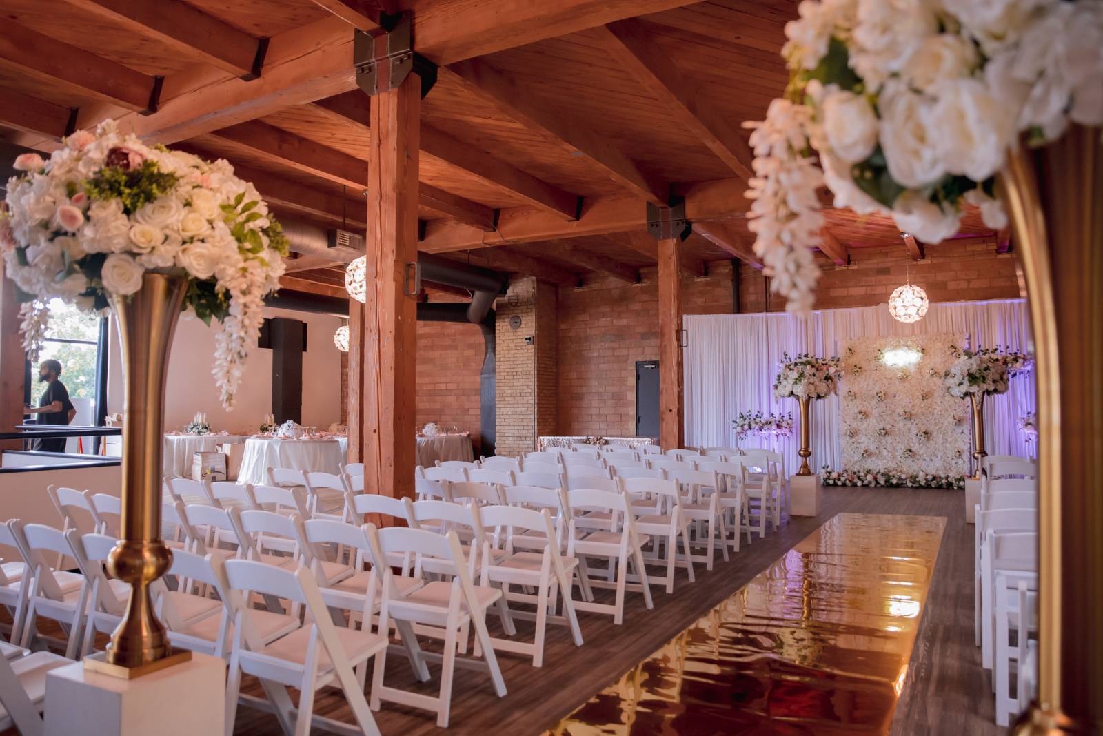 The front lounge at the Clybourn transformed into a stunning indoor ceremony backdrop. The industrial space already boasted high ceilings, round chandeliers, and exposed rafters, which were then decorated with an expansive flower wall, tall vases, a white curtain, and a gold aisle runner. The wedding planner, Bodies Event, helped simplify the planning process by providing the floral and decor in addition to coordination and setup.