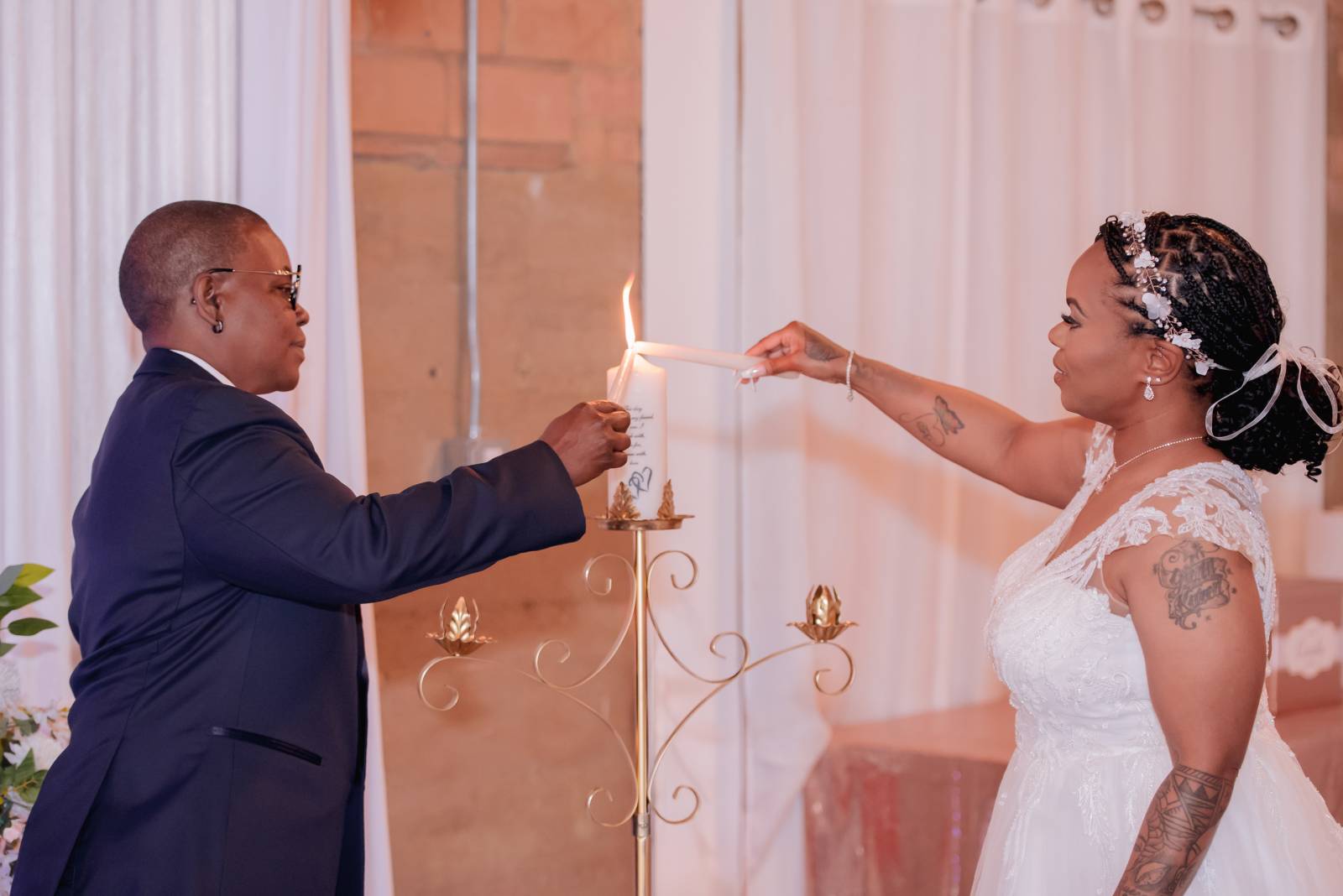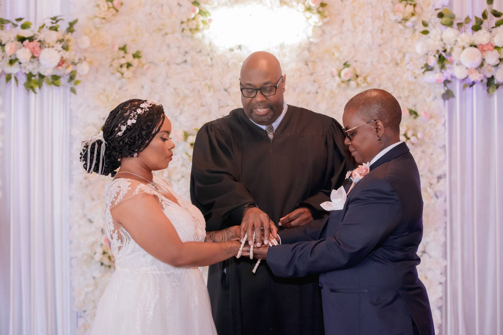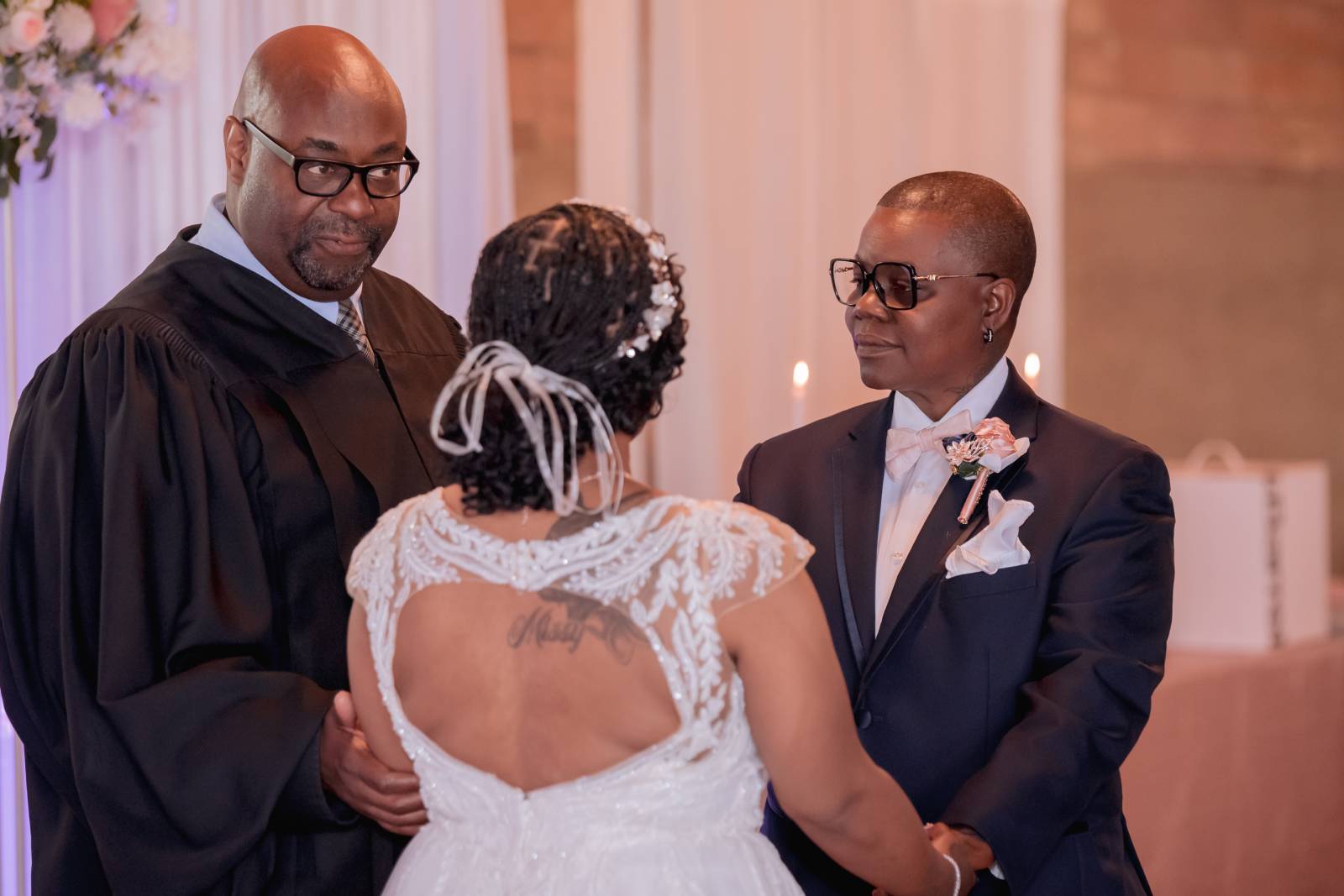 Judge Mosley officiated their ceremony. In addition to vows, Hadassah and Pam chose to include thoughtful details and traditions, including a ‘handfasting’ ritual. Originating in ancient Celtic times, this involved tying their hands together to symbolize binding their lives.