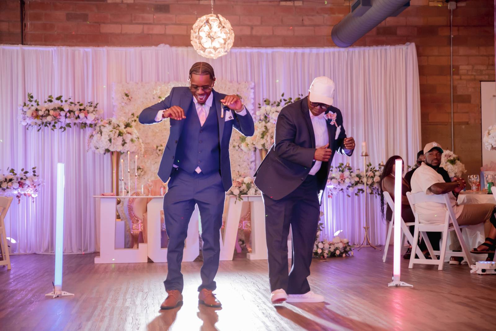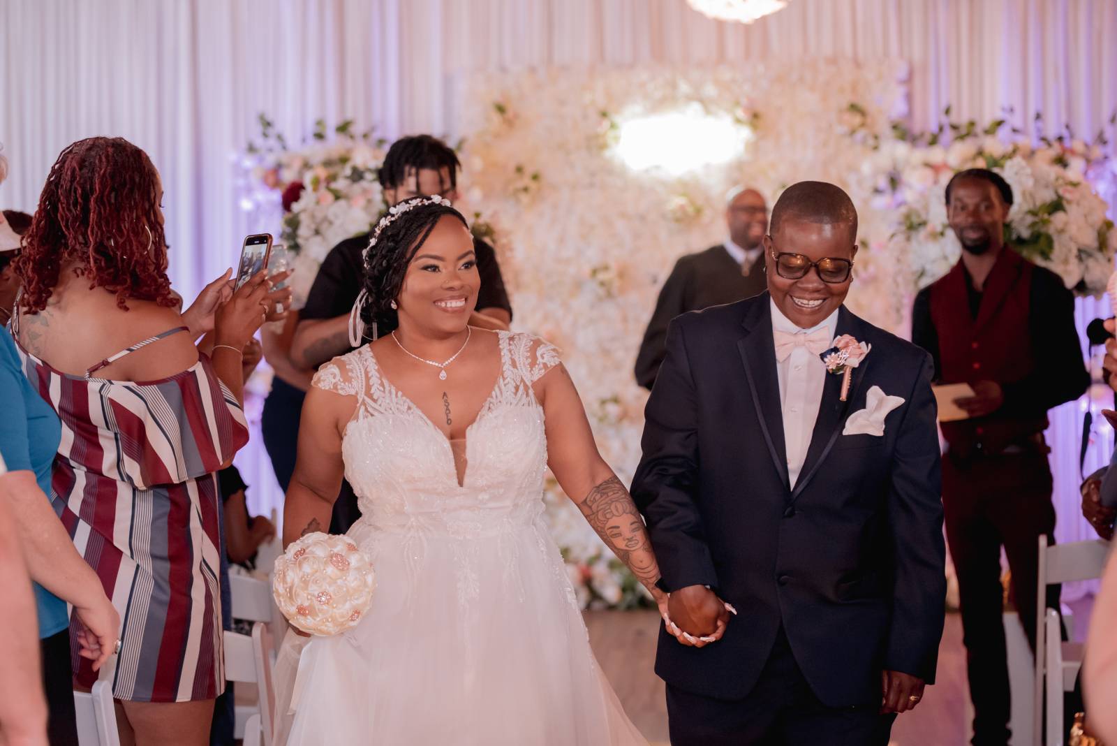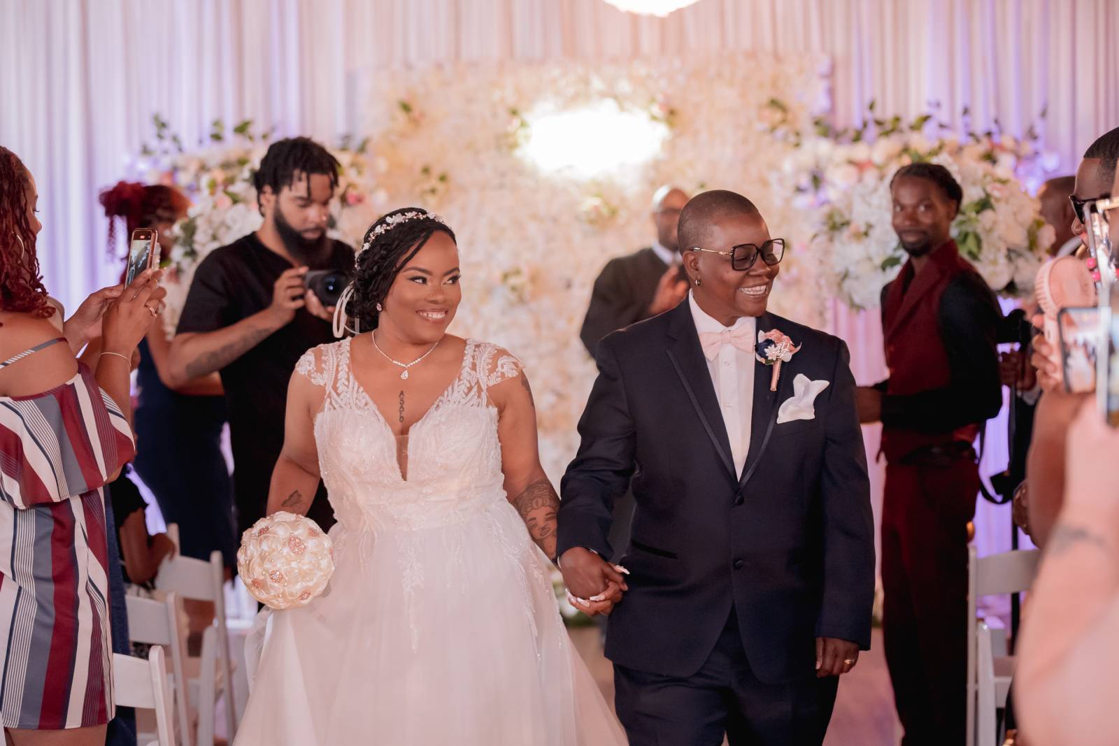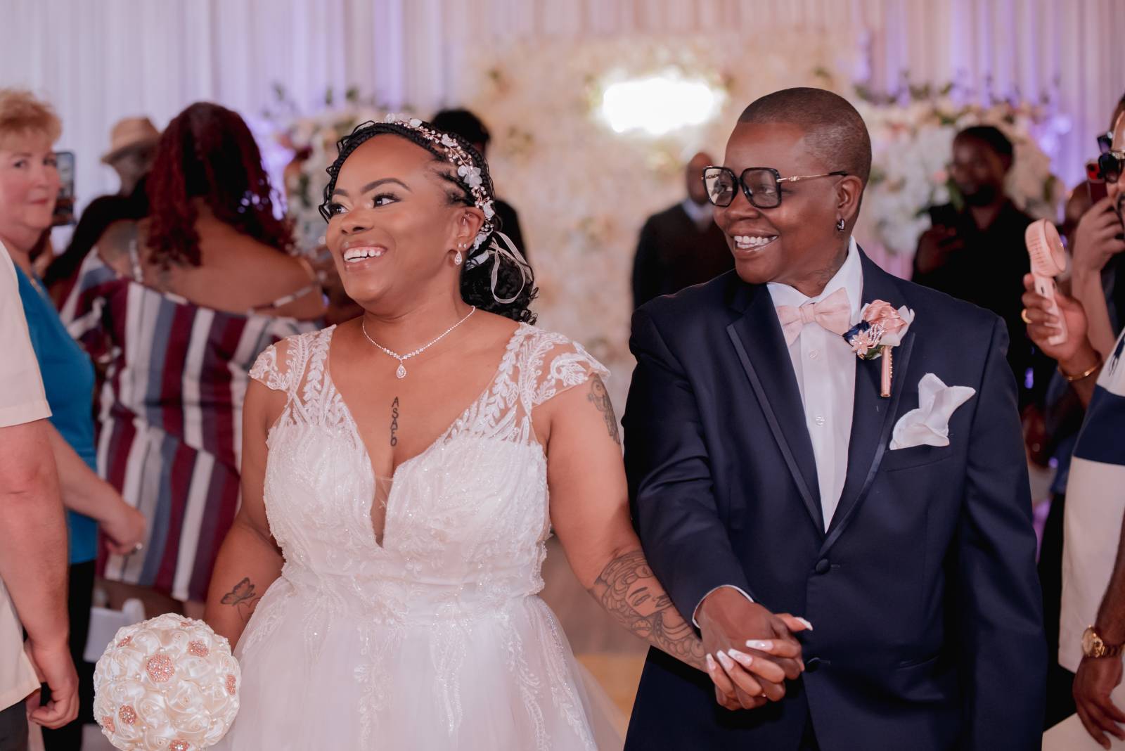 Meanwhile, Pam’s son Christopher, “Best Son,” helped Pam get ready for the day. She wore a sharp navy suit from Men’s Wearhouse with a white undershirt, blush bowtie, silk flower boutineer, and white pocket square. Other unique details included custom initial cufflinks, white sneakers, and her signature baseball cap worn at the reception.