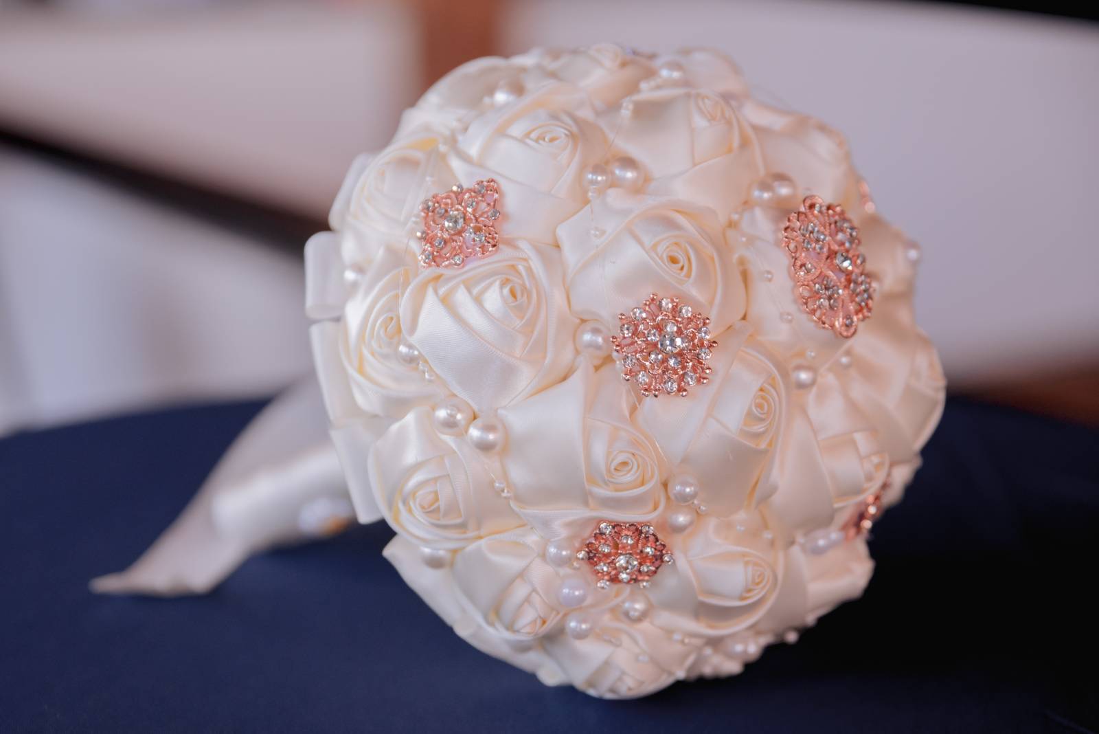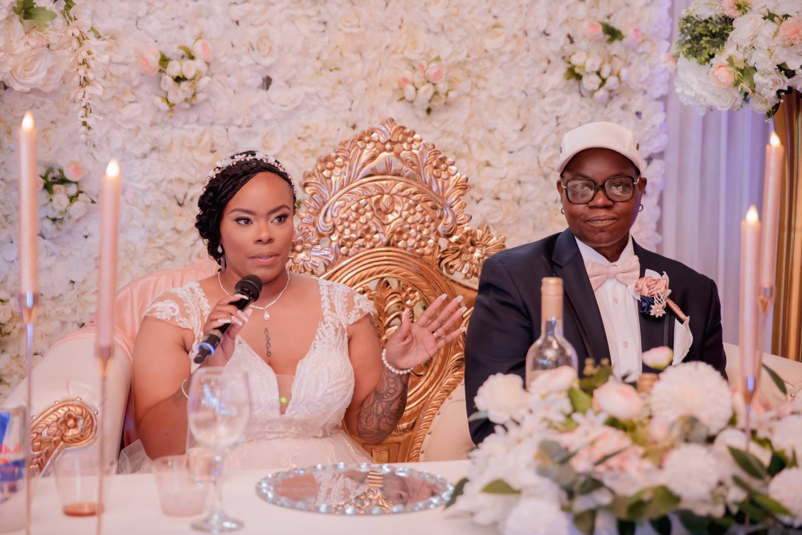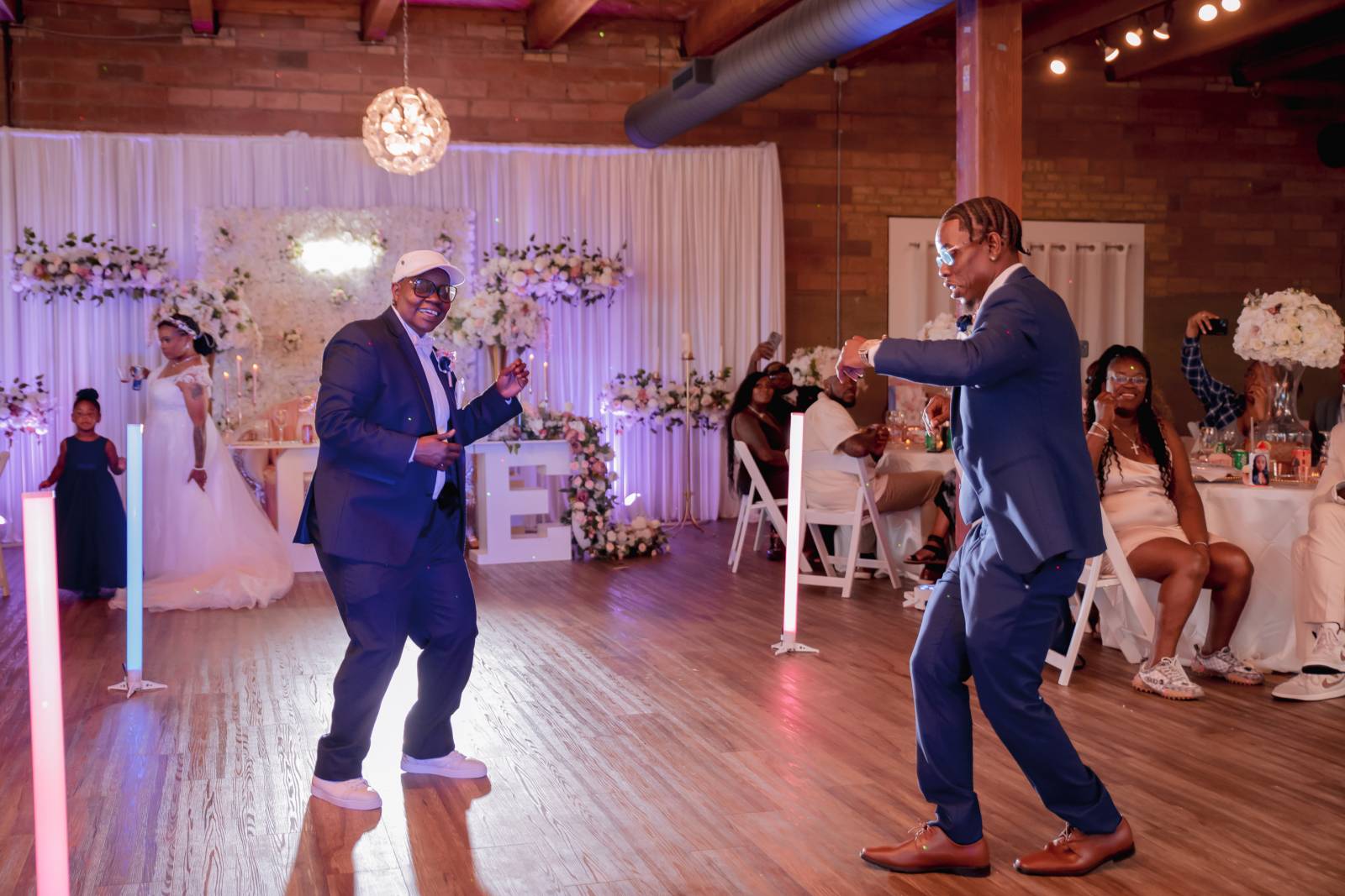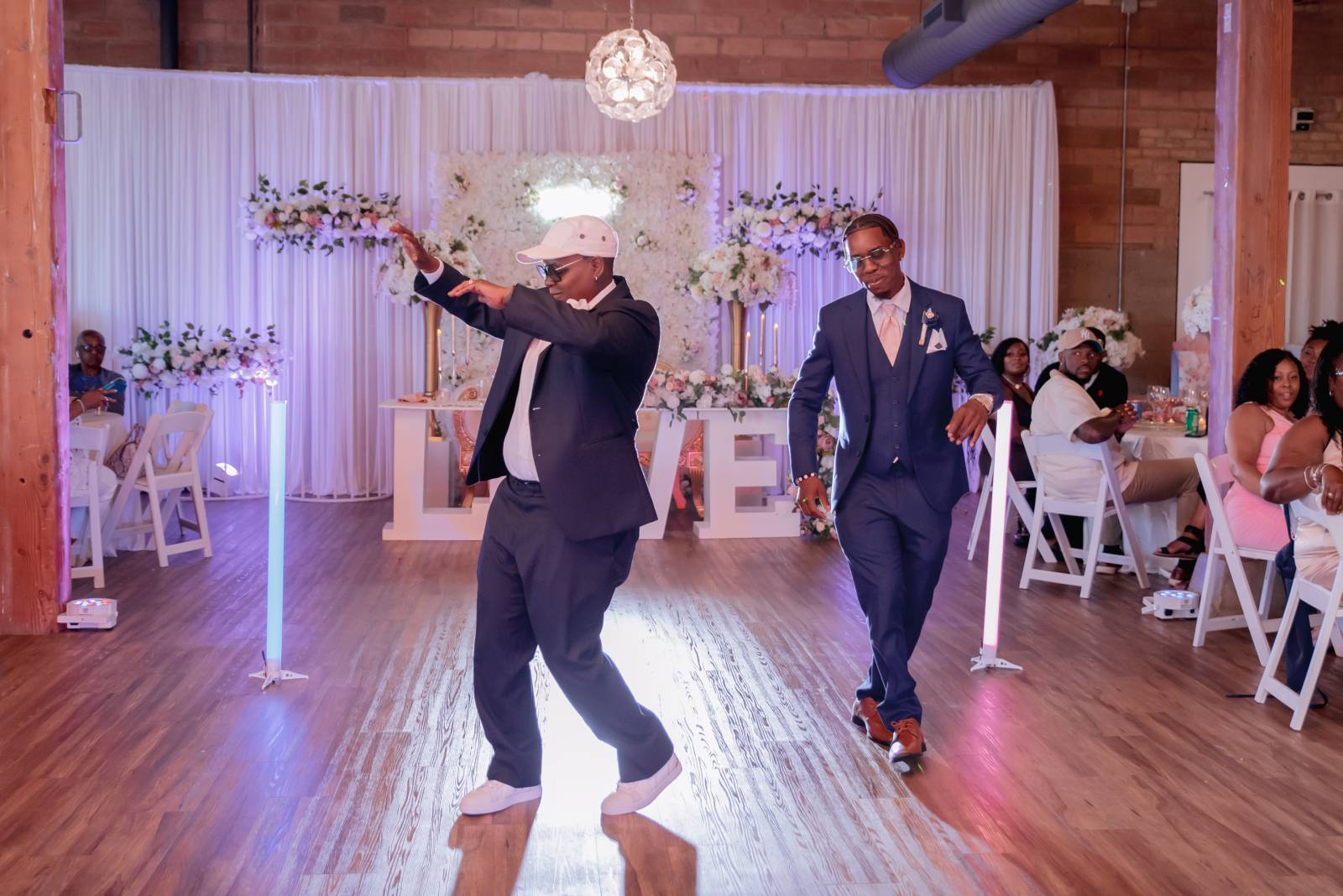 Meanwhile, Pam’s son Christopher, “Best Son,” helped Pam get ready for the day. She wore a sharp navy suit from Men’s Wearhouse with a white undershirt, blush bowtie, silk flower boutineer, and white pocket square. Other unique details included custom initial cufflinks, white sneakers, and her signature baseball cap worn at the reception.