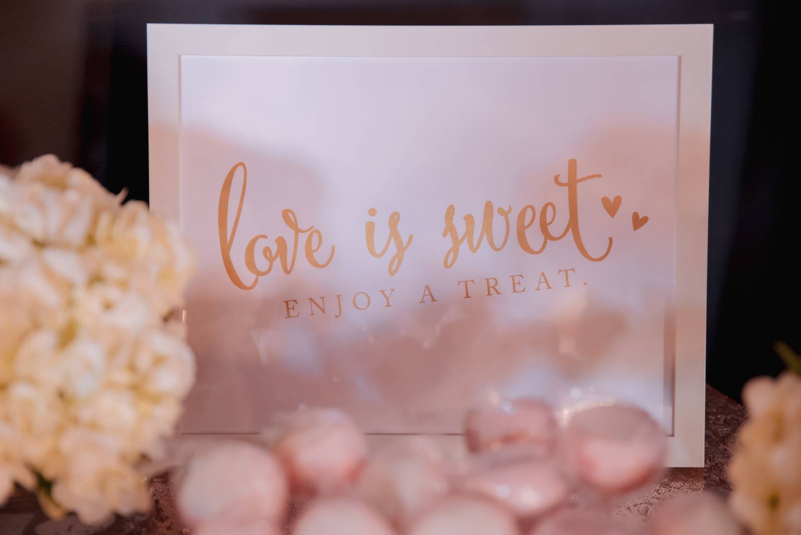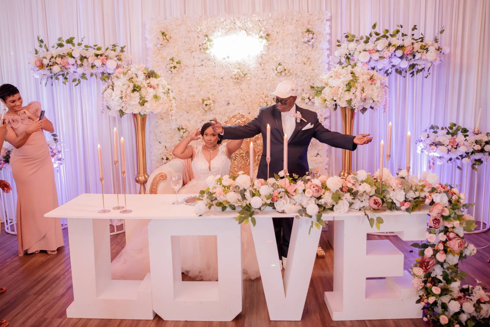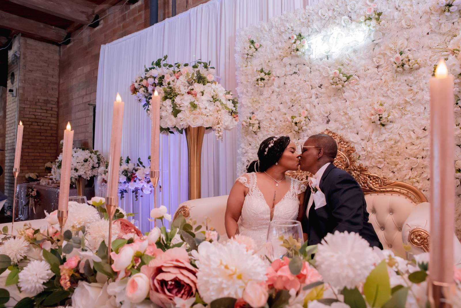 The ceremony space was quickly set for dinner and dancing. Additional rentals, like a grand gold and white loveseat, were brought in for Hadassah & Pam’s candlelit sweetheart table. The table itself, formed from large marquee letters spelling “LOVE” was a standout piece, as was the flower runner centerpiece that cascaded to the floor.