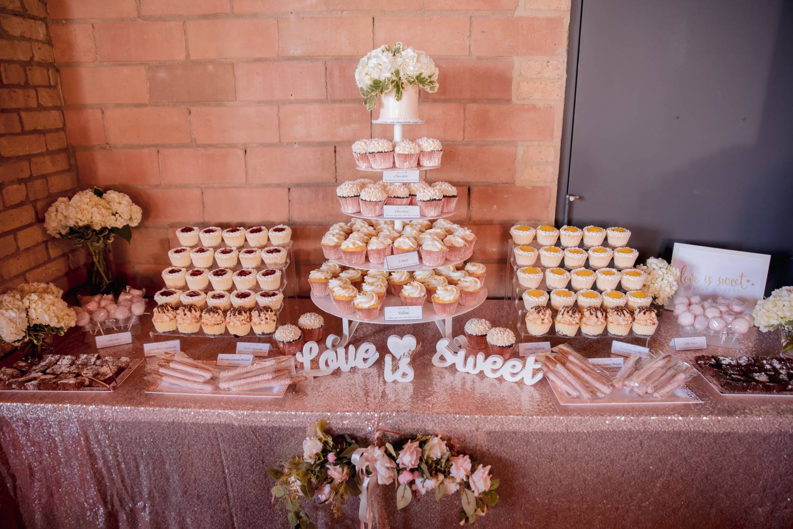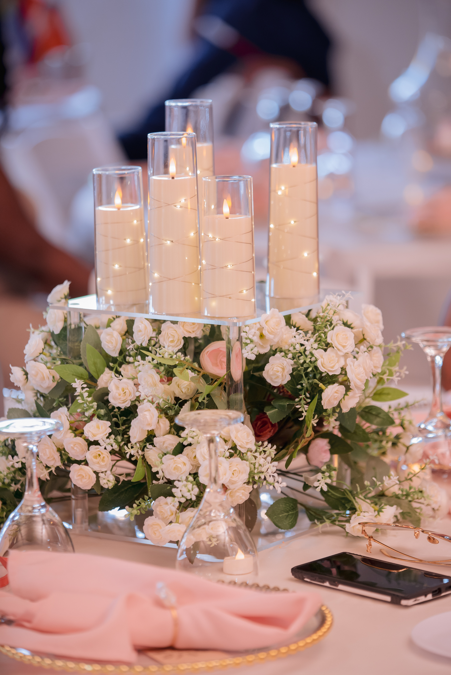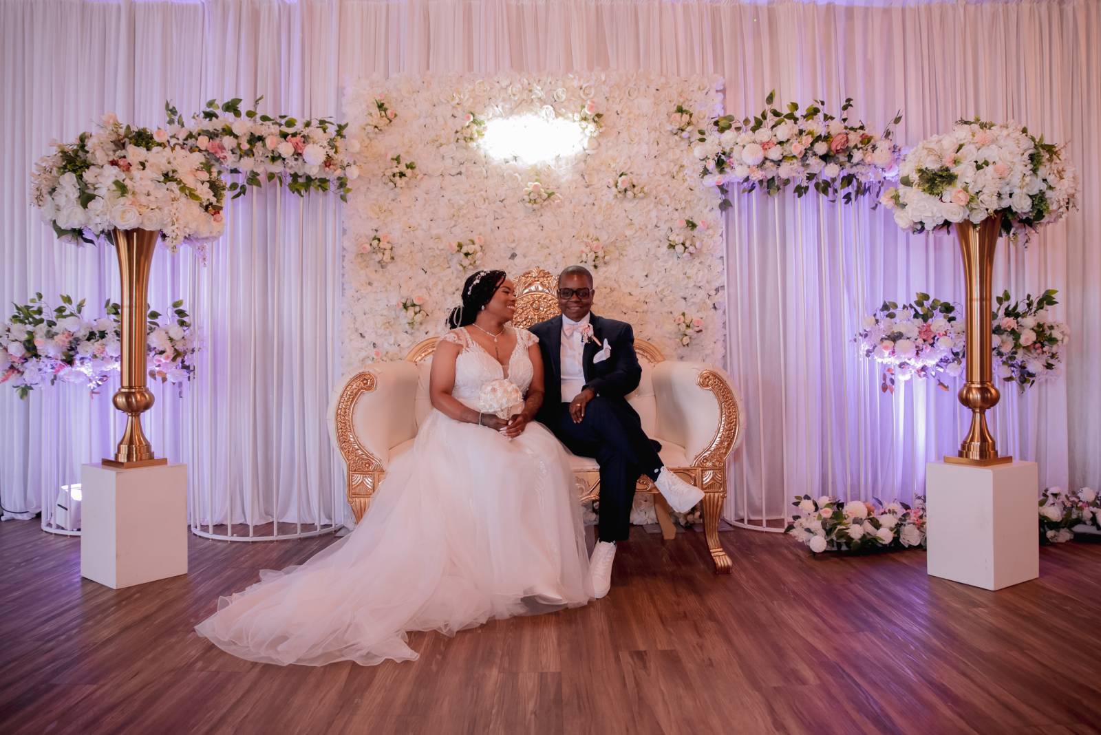 The ceremony space was quickly set for dinner and dancing. Additional rentals, like a grand gold and white loveseat, were brought in for Hadassah & Pam’s candlelit sweetheart table. The table itself, formed from large marquee letters spelling “LOVE” was a standout piece, as was the flower runner centerpiece that cascaded to the floor.