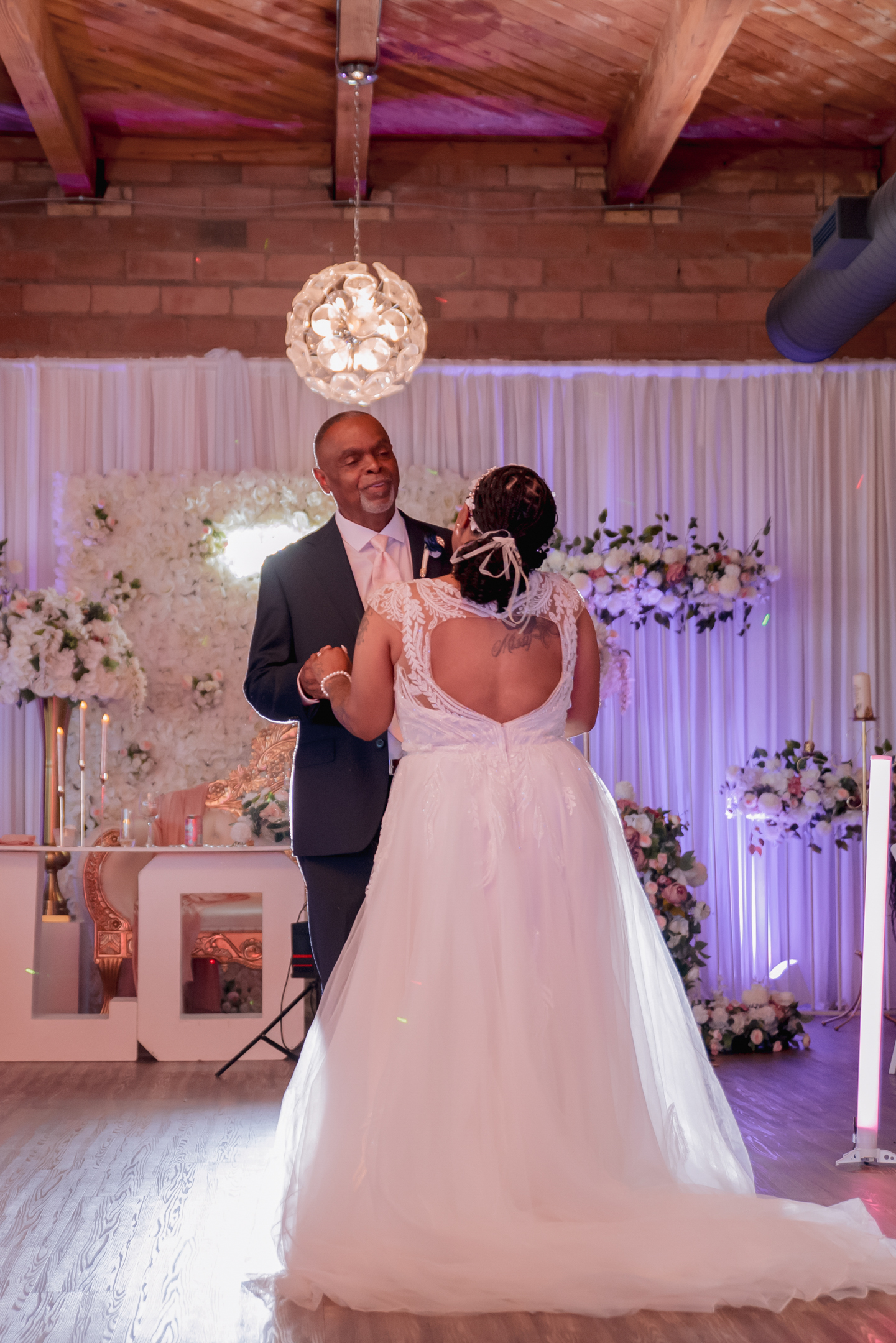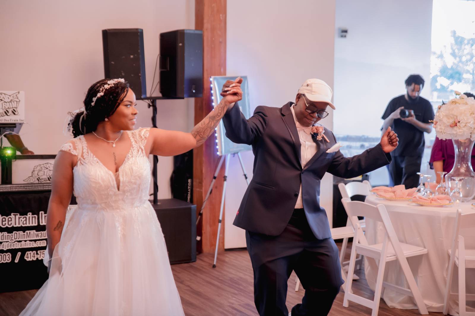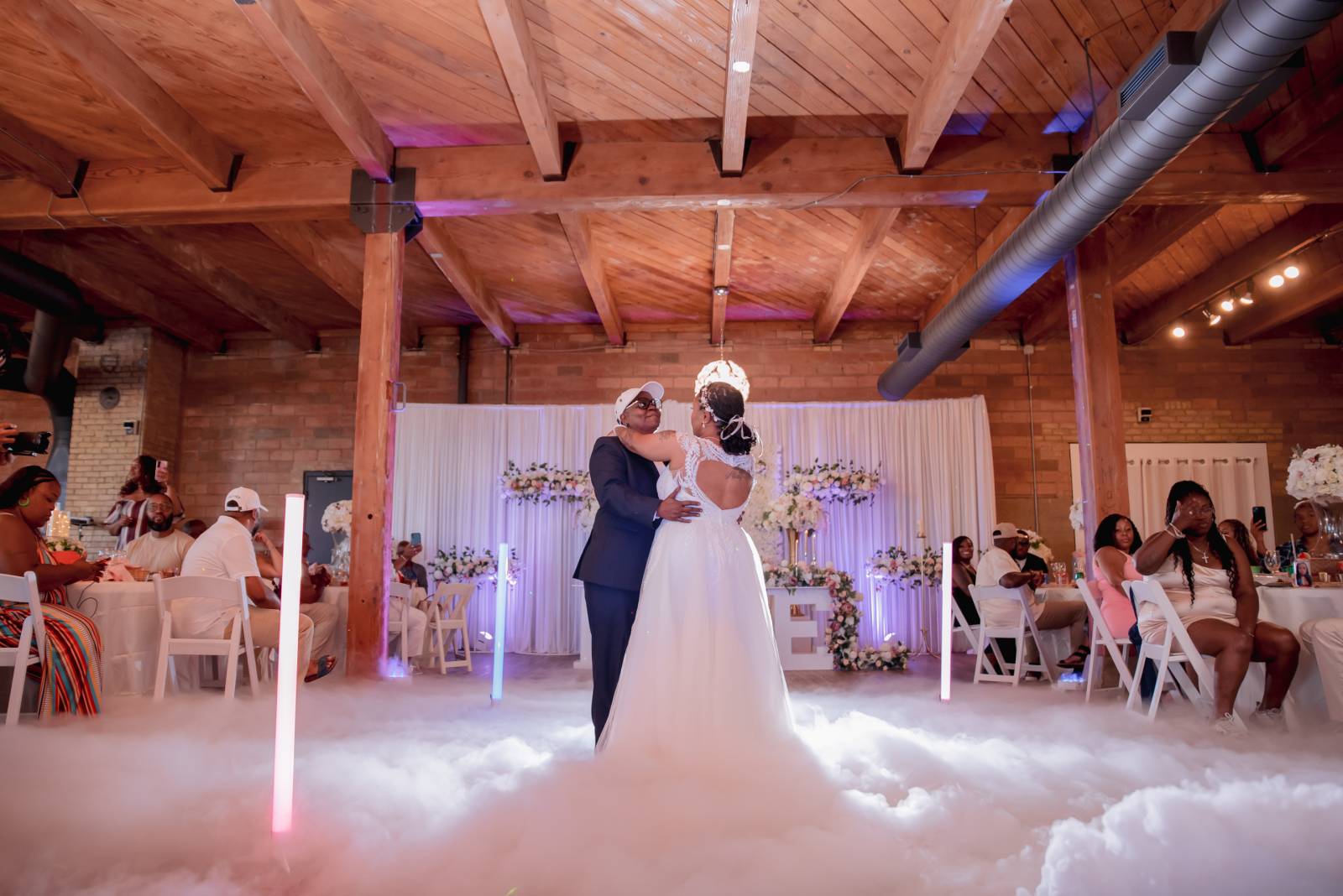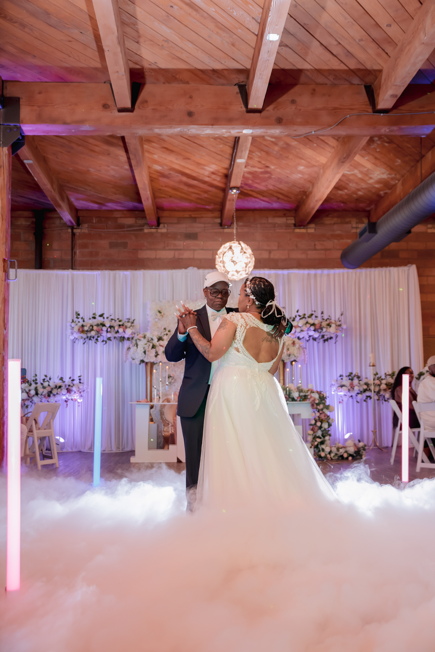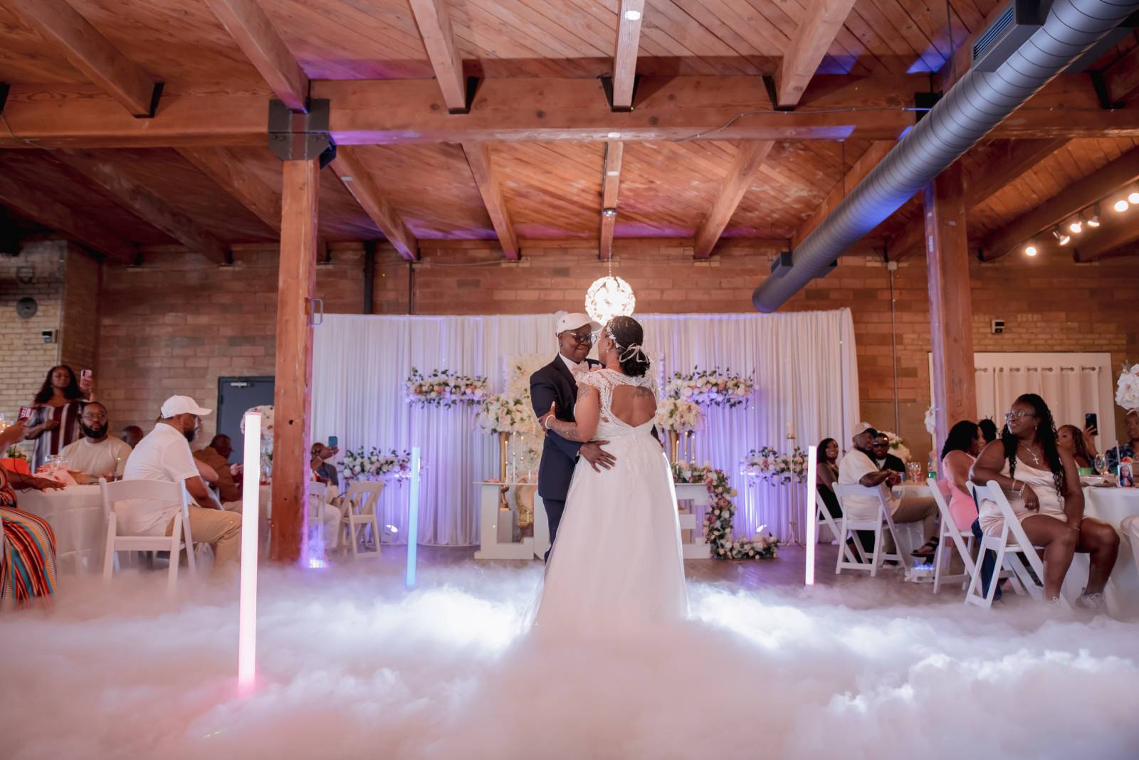 Pam and Hadassah share a love for travel, spending nights out in the city, and bringing the party and good vibes into any room. The Clybourn, a rustic venue in downtown Milwaukee, was the perfect location for their beautiful summer wedding. The couple chose a palette of navy, blush, white, gold, and rose gold for the fashion and decor for the day, with large floral arrangements setting the stage for their ceremony and reception.