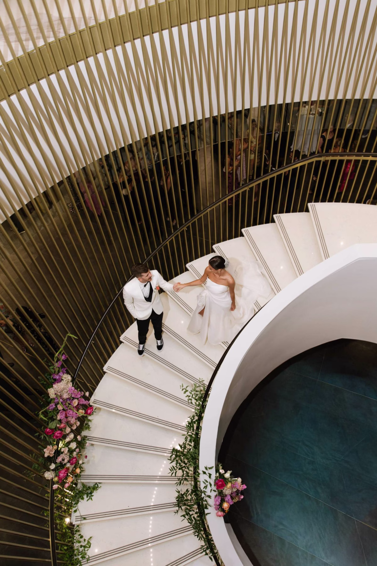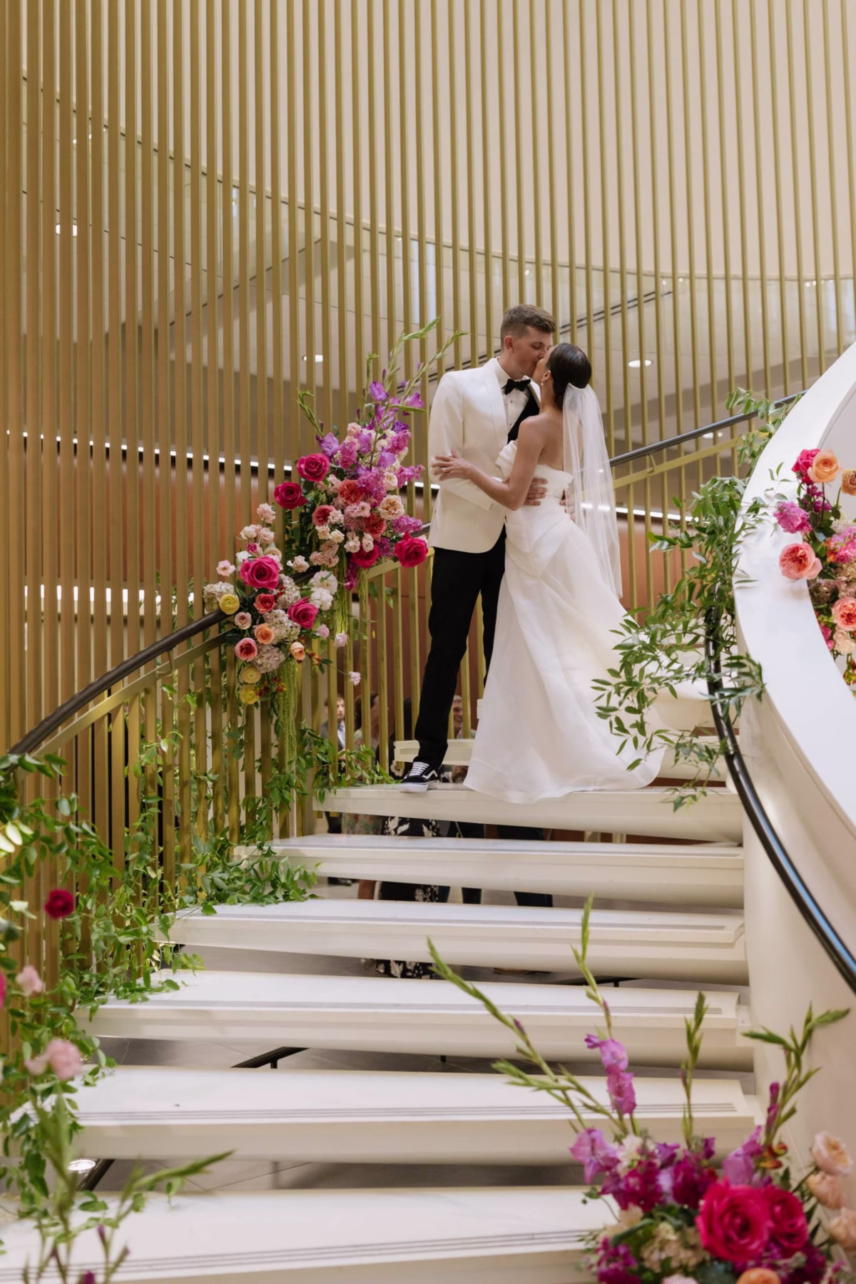 At the reception venue, Feisty Flowers designed a grand floral stair entrance, with greenery and blooms wrapped around the railing. Other installations included centerpieces at the tables, a floral arrangement at the dessert table, and décor for the ceremony.