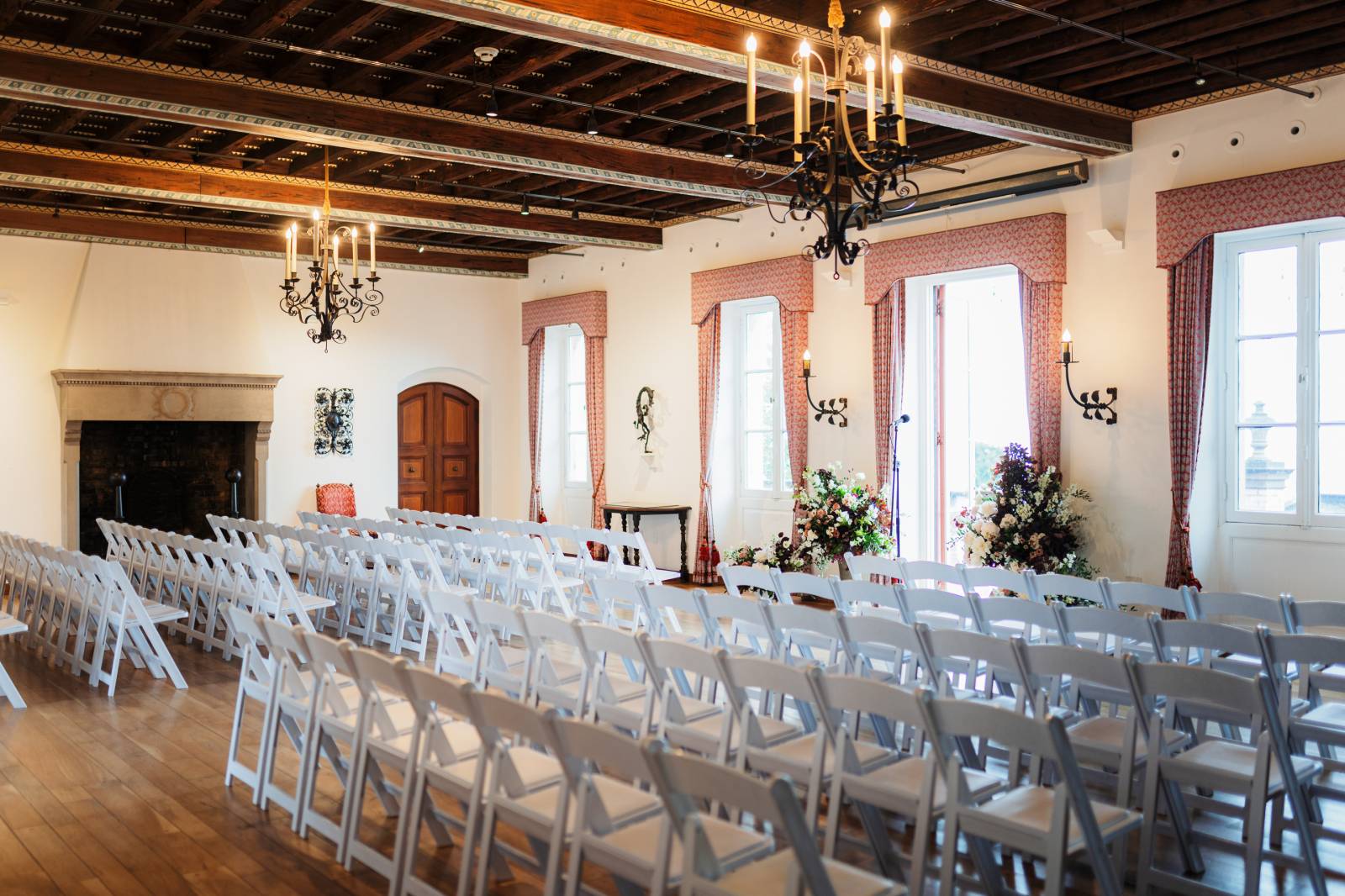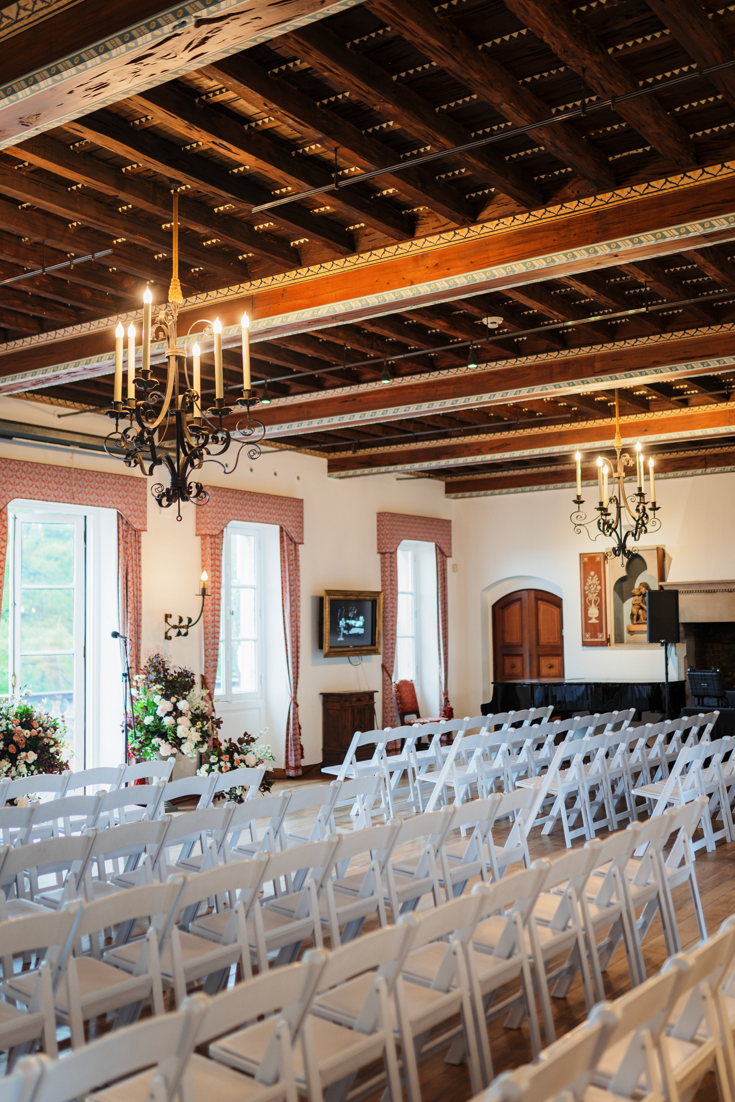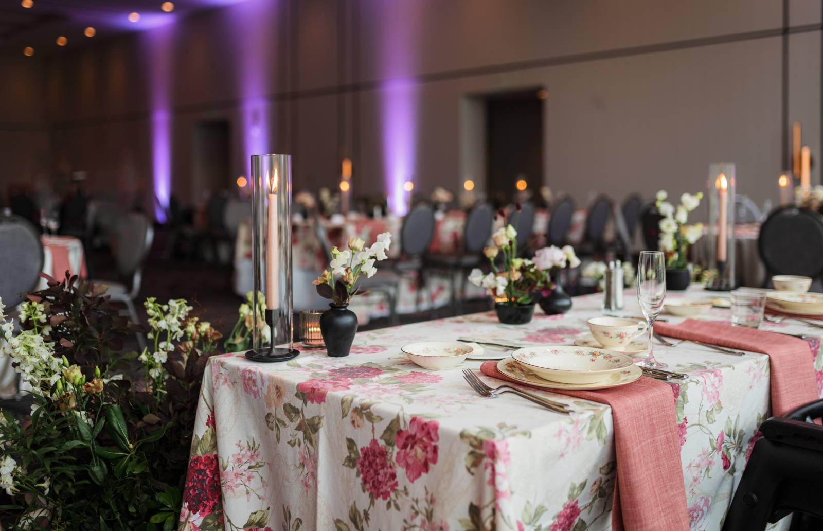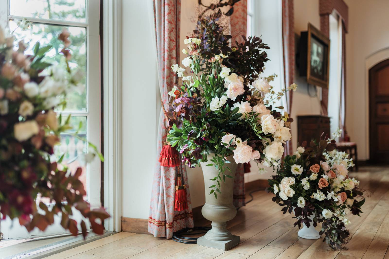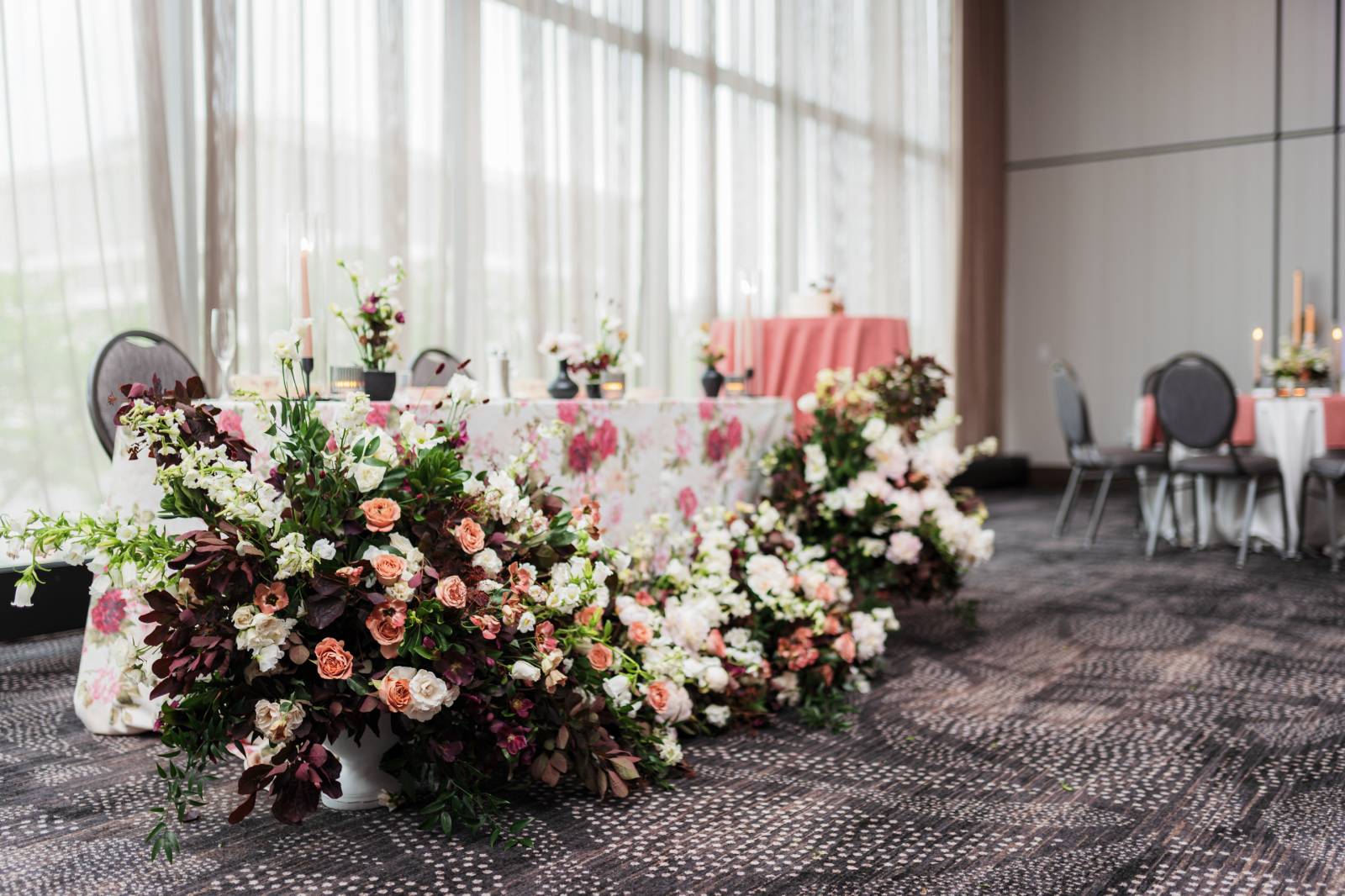 Feisty Flowers designed stunning floral arrangements for the couple's big day. For the bride, they created an oversized, garden-style bouquet featuring white, coral pink, and burgundy blooms. They also designed lush vases to create a stunning backdrop for the ceremony and crafted smaller table arrangements and bud vases to decorate the reception.