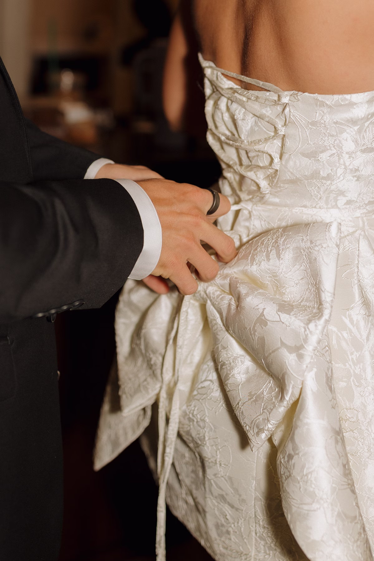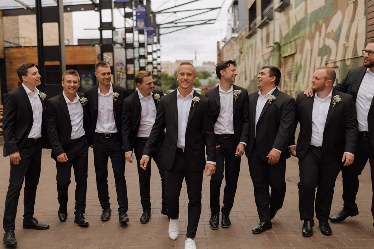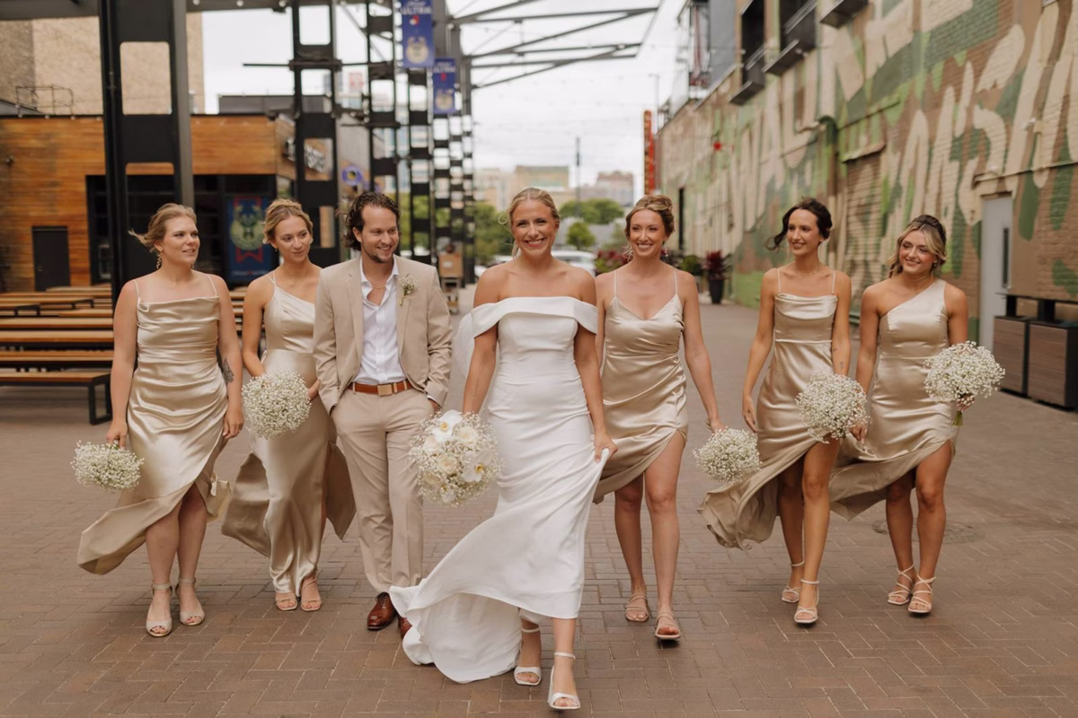Her bridesmaids wore satin, champagne colored gowns in unique silhouettes and glowing makeup. Colton and his groomsmen kept their fashion sharp, classic, and a little casual, all wearing black suits, white undershirts, and floral boutonnieres. They skipped ties or bow ties entirely and added unexpected accessories, such as patterned socks. Colton also incorporated his personal style into his wedding attire by choosing sneakers over dress shoes.