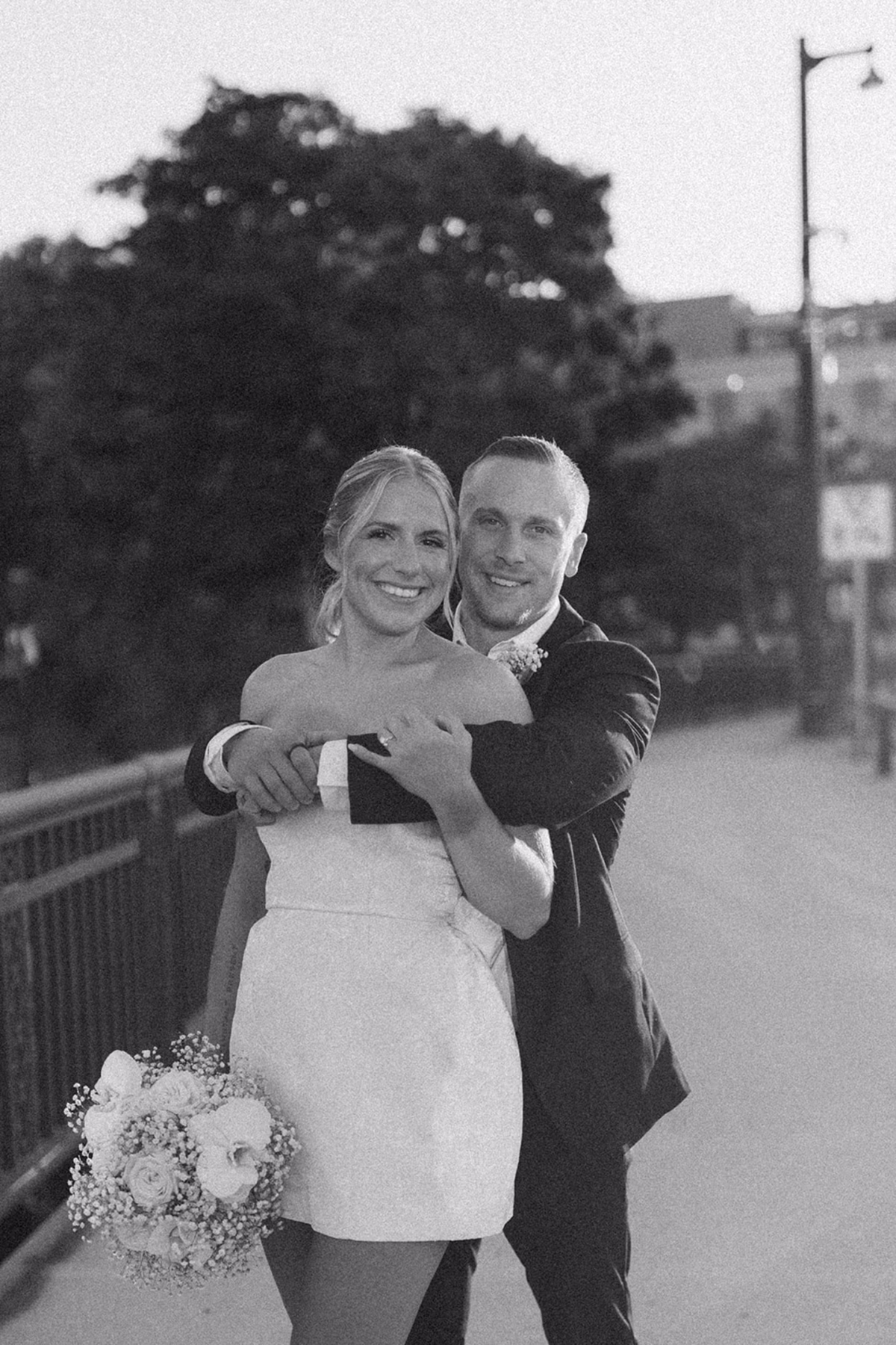 Their venue, Vista MKE, was located right in the heart of Milwaukee, with the couple’s outdoor ceremony overlooking the cityscape. Abbie wore her great-grandmother’s ring, a family heirloom, for the day, and her aunt officiated the wedding. The couple’s two dogs were also included in photos, as well as a special walk down the aisle.