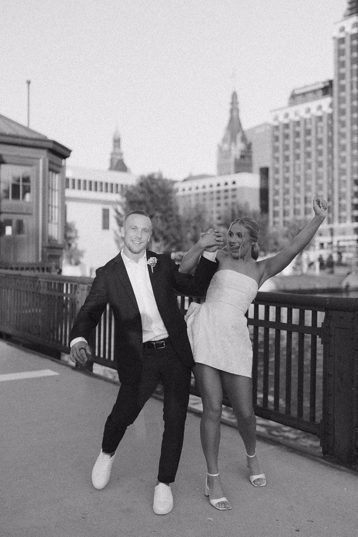 Abbie and Colton’s stylish Milwaukee rooftop wedding featured heartfelt details, champagne tones, their two dogs, and a surprise tequila unity toast. With cityscape views, a pearl-detailed gown, and a joyful celebration at Vista MKE, their big day was modern, personal, and full of love.
