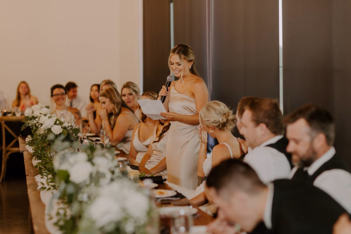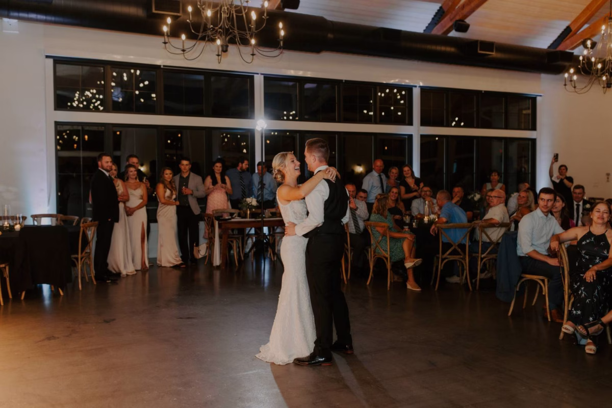 Inside the venue, The Carriage House shone with minimal added decor. Round tables were decorated with black tablecloths, glassware, and reflective table numbers. The couple and their wedding party sat at a wooden head table beside soaring windows, featuring a neutral table runner accented with greenery. Other venue highlights included vaulted ceilings, abundant natural light, exposed wooden rafters, modern windows, and twinkling chandeliers.