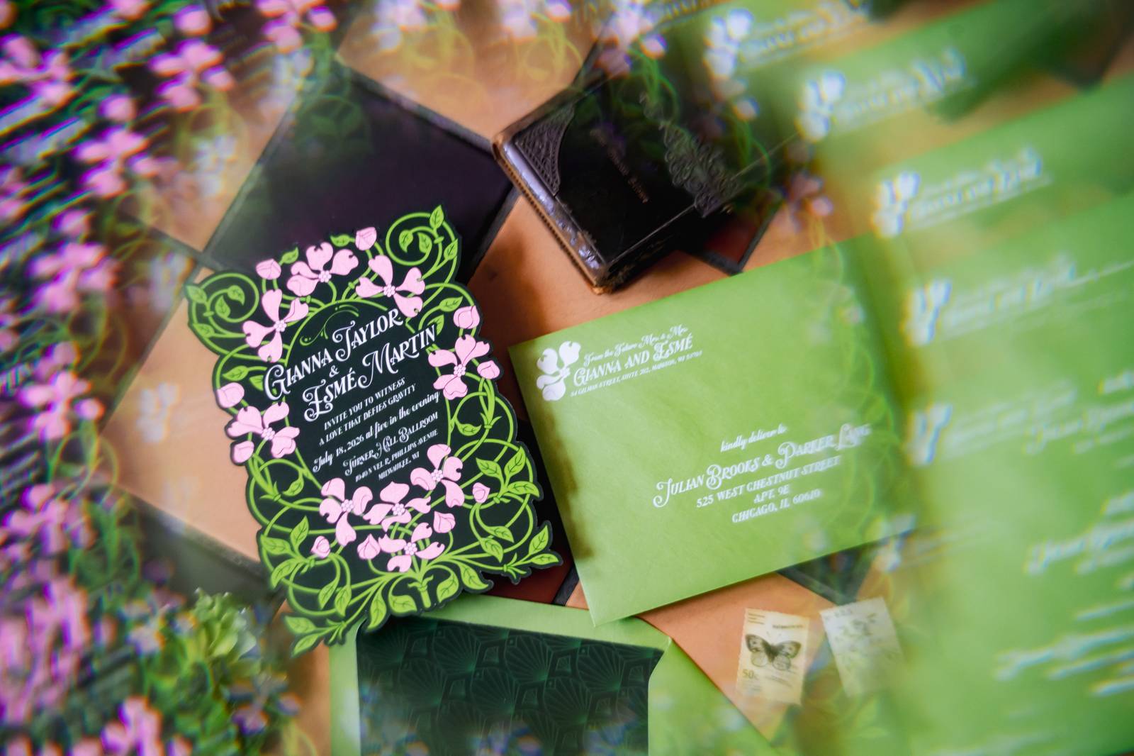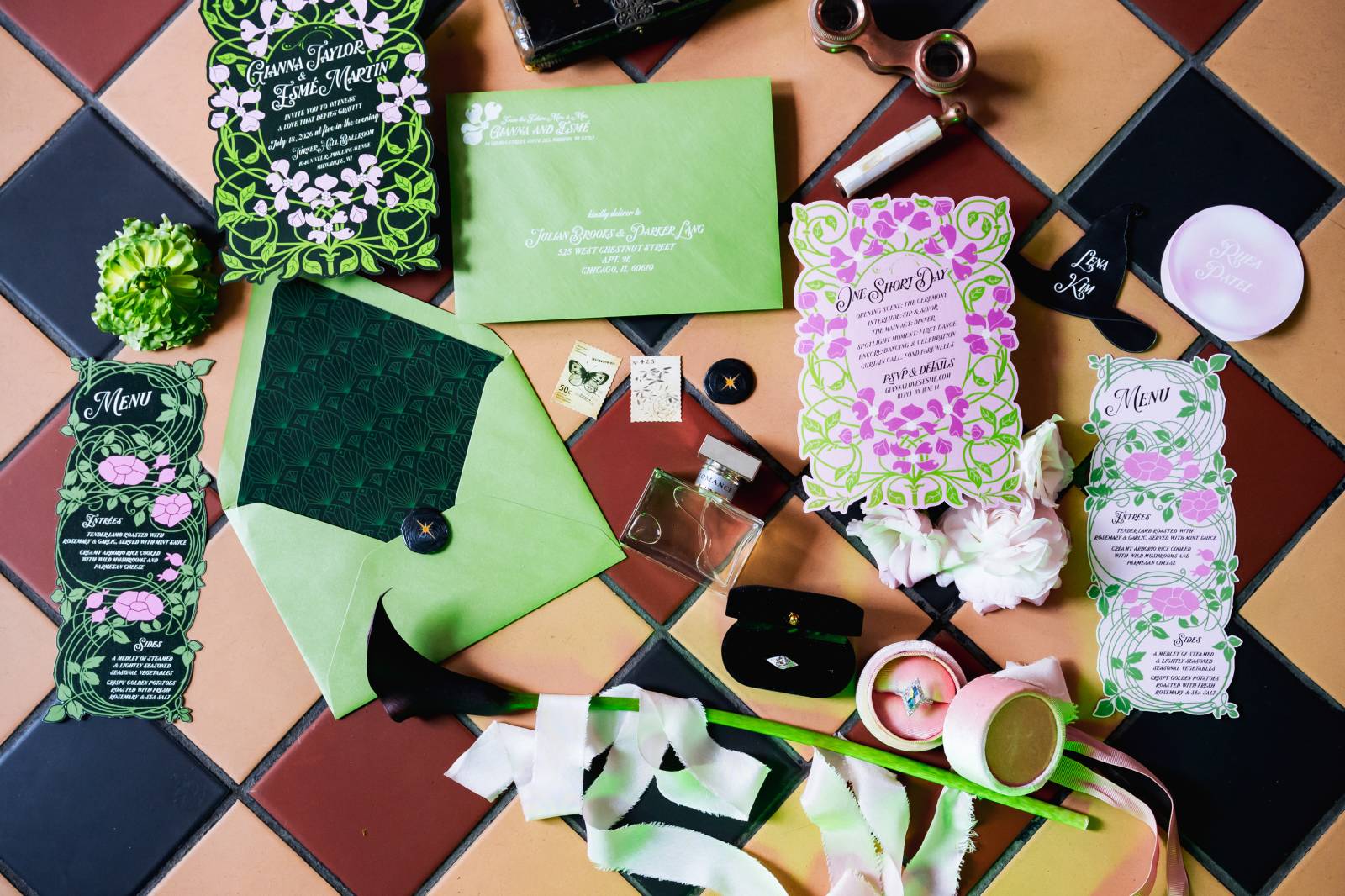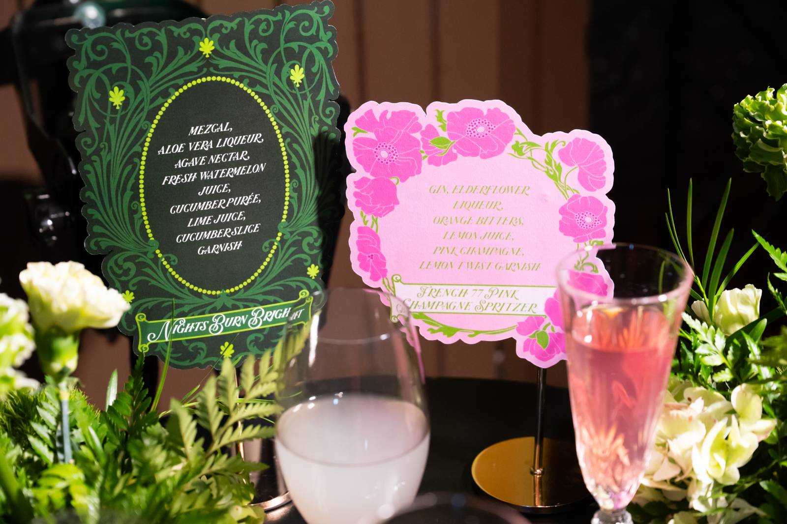 For the stationery & signage pieces, LK Bridal Studio played with balancing whimsical, organic elements with structured Art Deco accents inspired by the architecture of the Emerald City. Their contour-cut invitation suite, menus, table numbers, name cards, drink menus, and welcome sign featured a refined palette of solid greens, pinks, and white. Intricate floral motifs were carried throughout the design, keeping the pieces cohesive throughout every space.