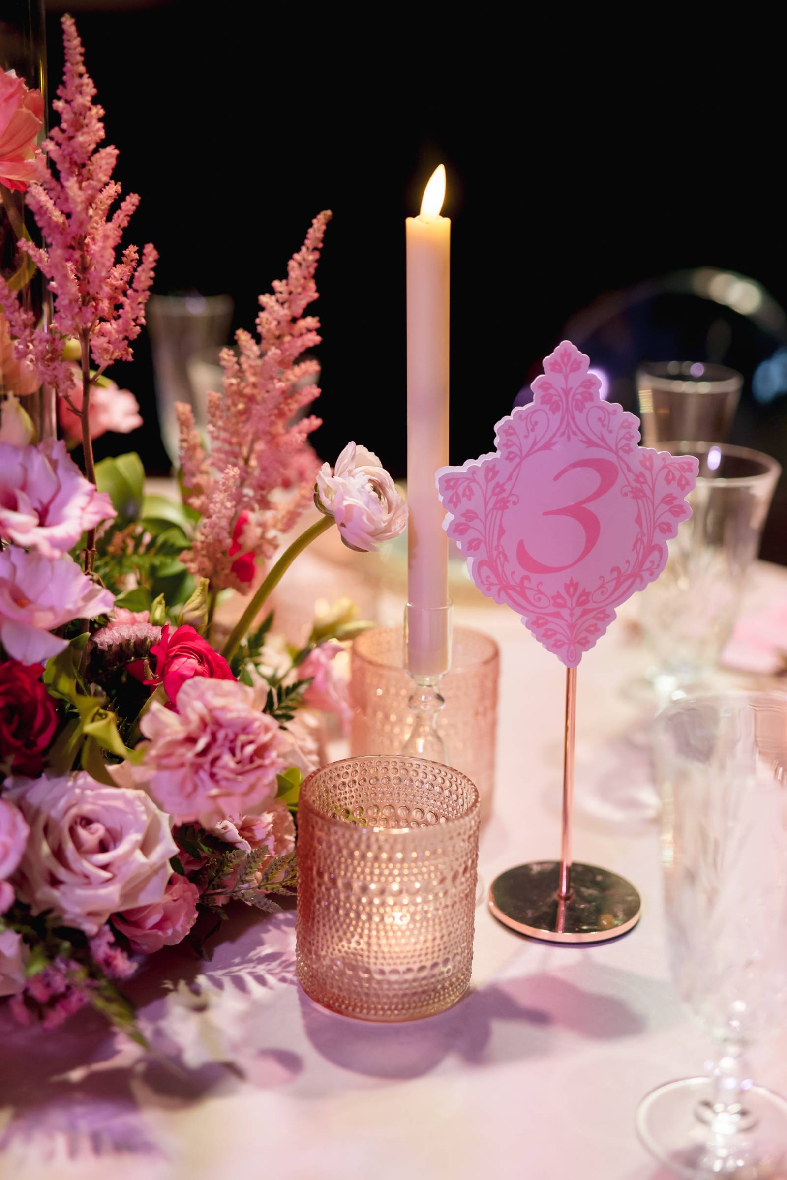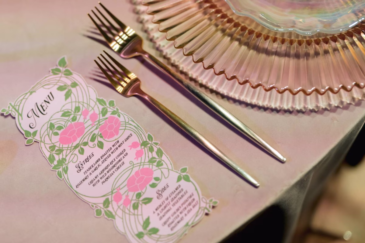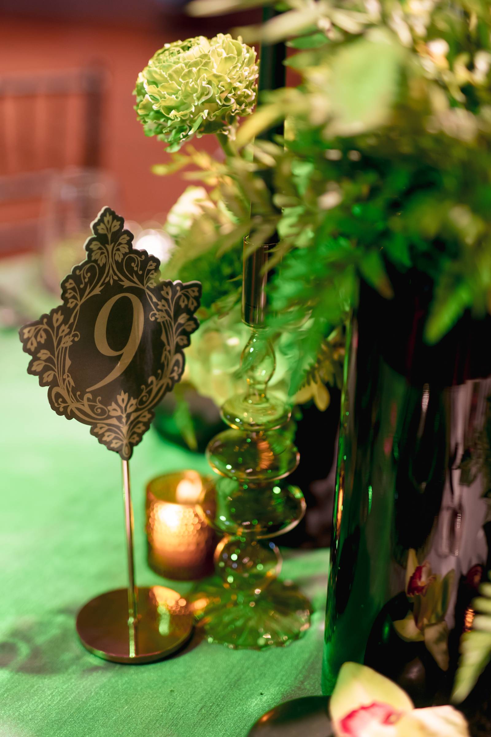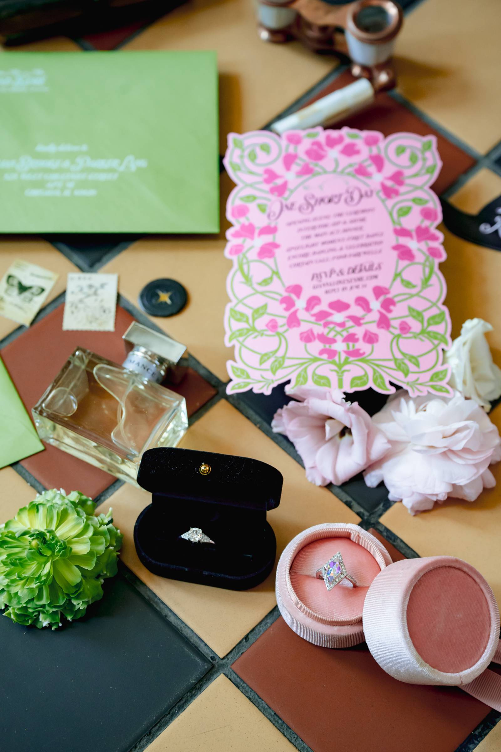 For the stationery & signage pieces, LK Bridal Studio played with balancing whimsical, organic elements with structured Art Deco accents inspired by the architecture of the Emerald City. Their contour-cut invitation suite, menus, table numbers, name cards, drink menus, and welcome sign featured a refined palette of solid greens, pinks, and white. Intricate floral motifs were carried throughout the design, keeping the pieces cohesive throughout every space.