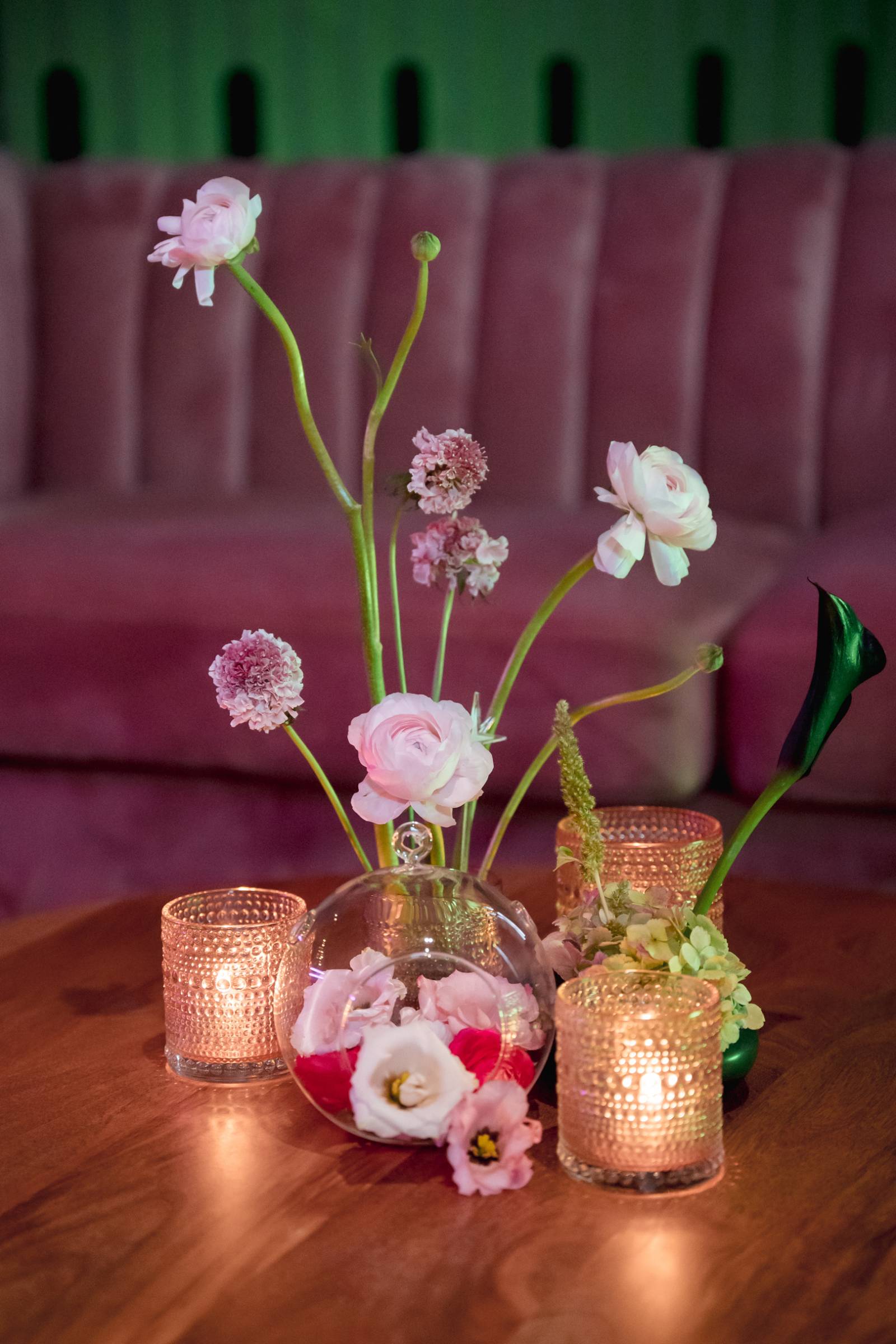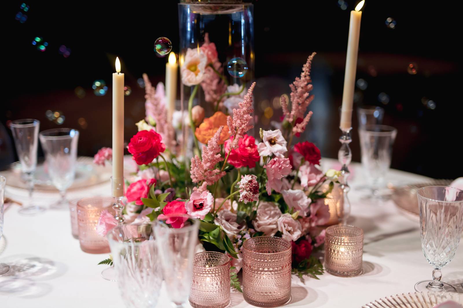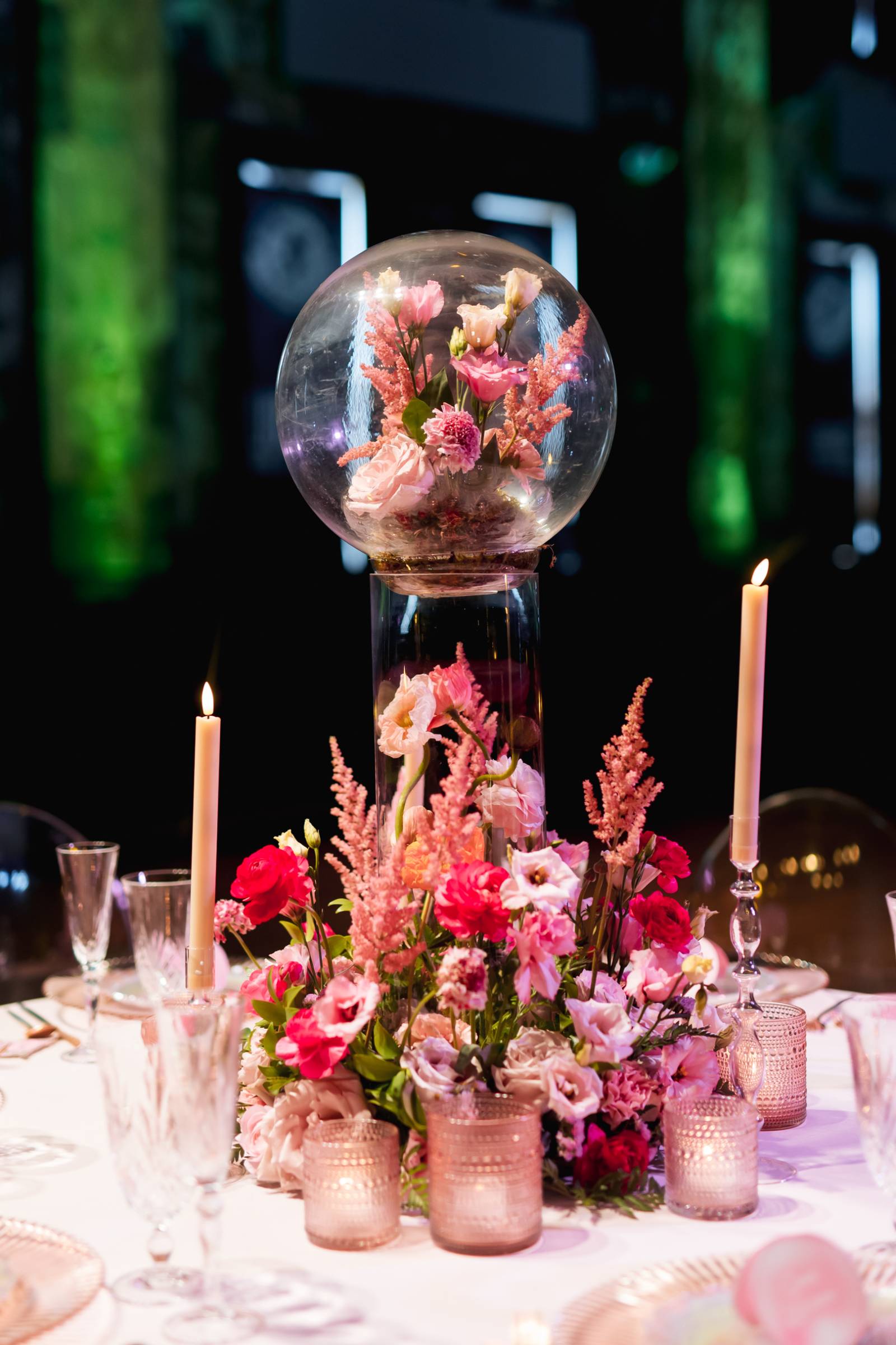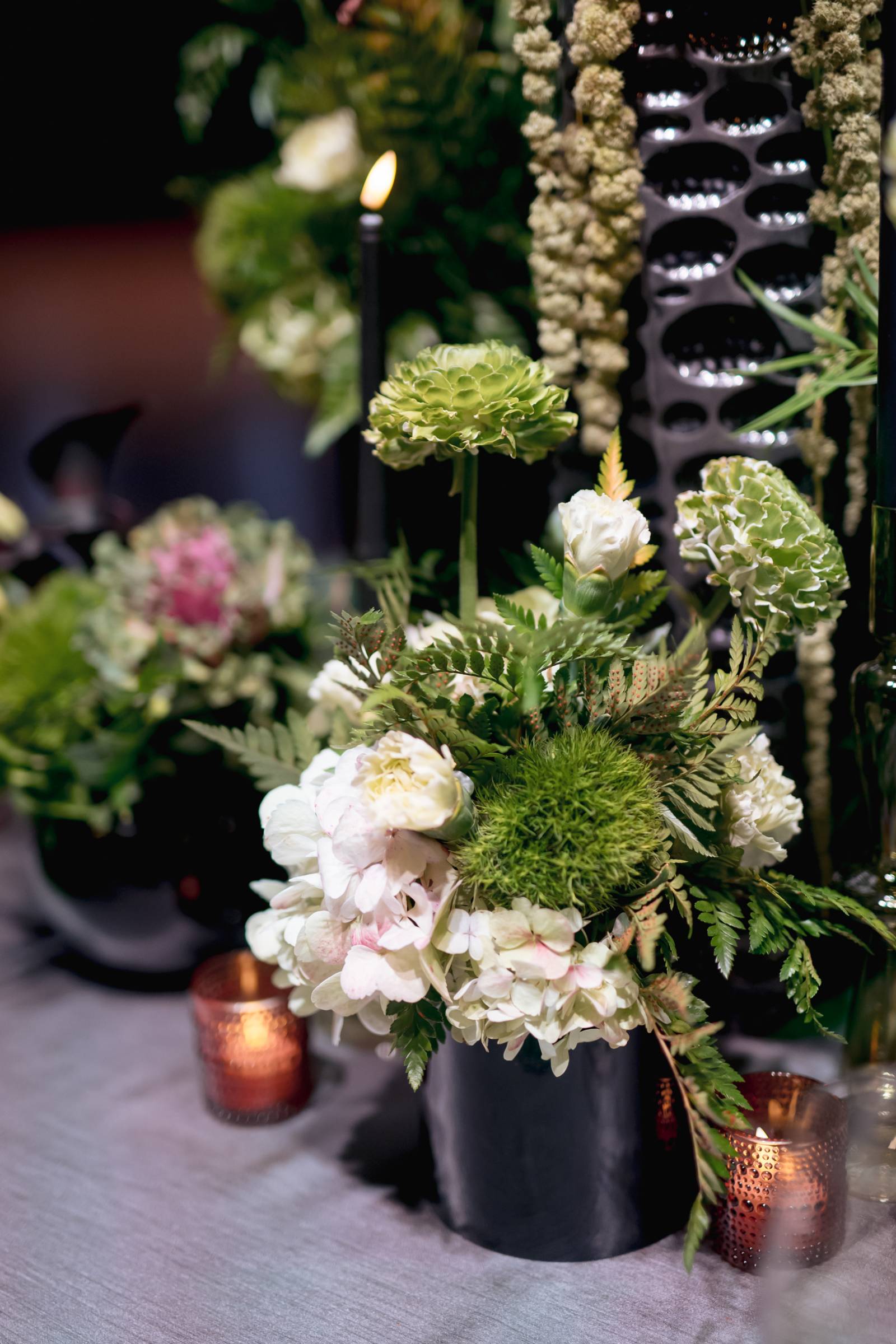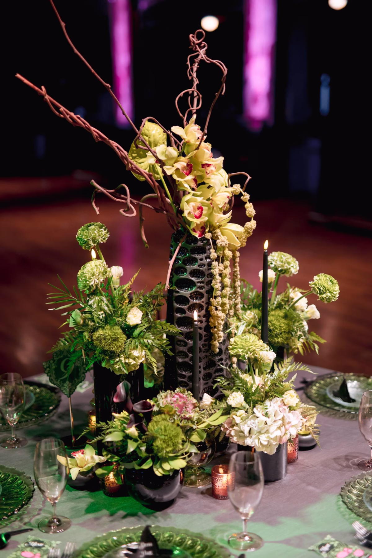 Flowers for Dreams further brought their creative, environmentally friendly approach to the reception tables. Their unique centerpieces, inspired by the lead characters, reimagined everyday items into artistic, modern sculptures. Each towered in the center of their respective round table, set with glassware, linens, printed pieces, and even chairs to match their character’s color scheme.