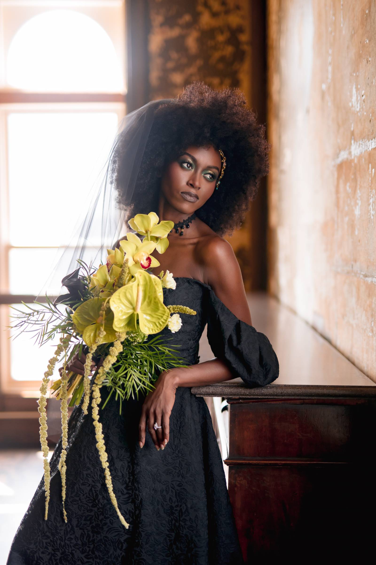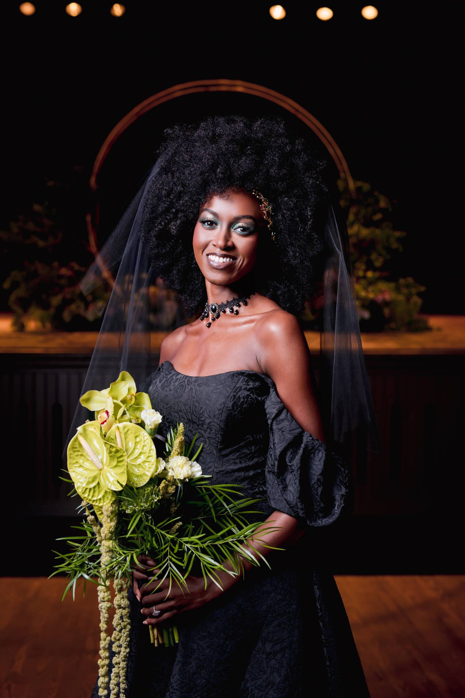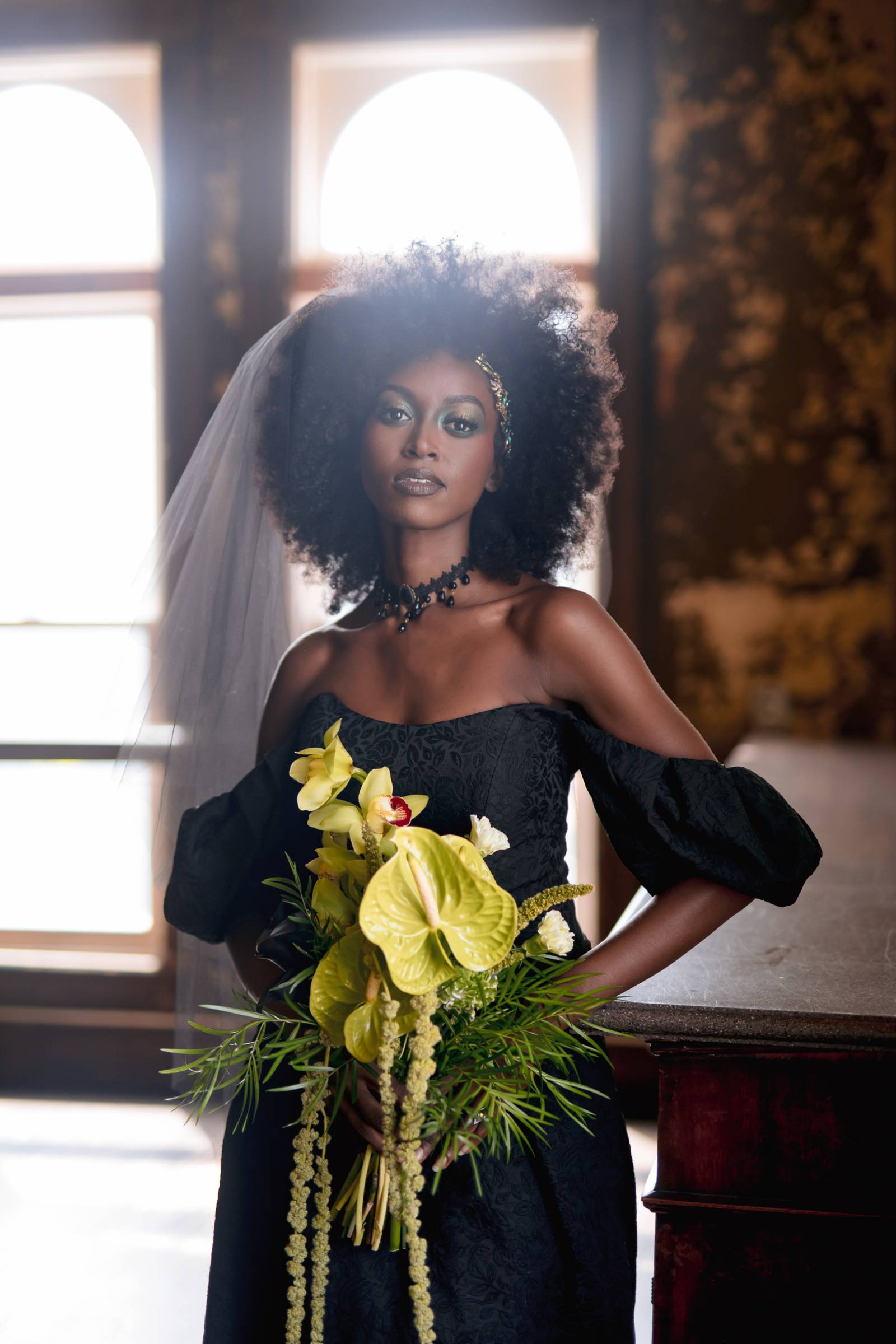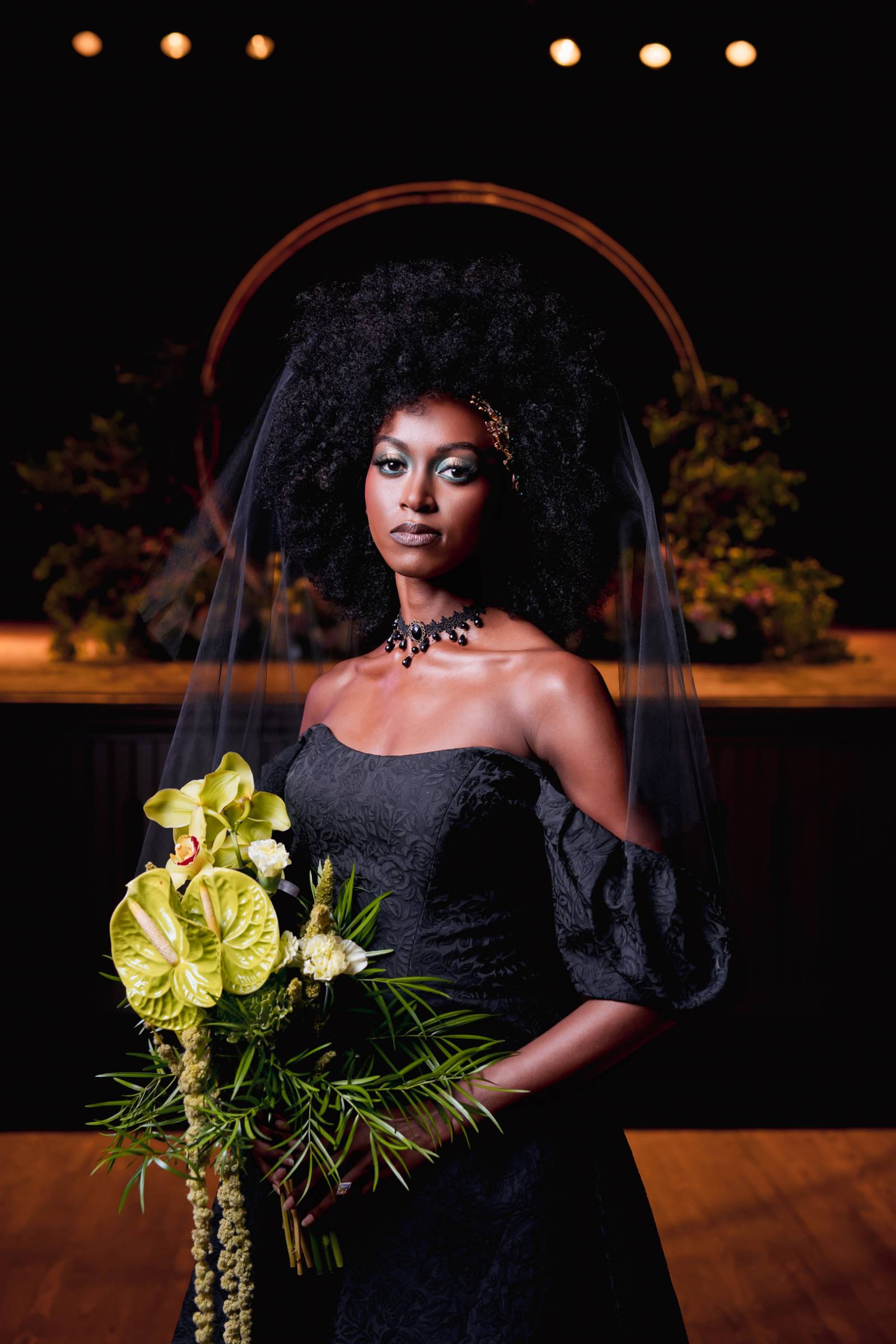 In true Elphaba fashion, Miss Ruby Bridal styled Julia in a black statement gown with a scoop neckline and puffy, off-the-shoulder sleeves. The luxurious a-line dress also featured a brocade fabric and a flowing train. Julia was accessorized with an elbow-length black tulle veil, a beaded choker necklace, and an ornate gold hairpin.