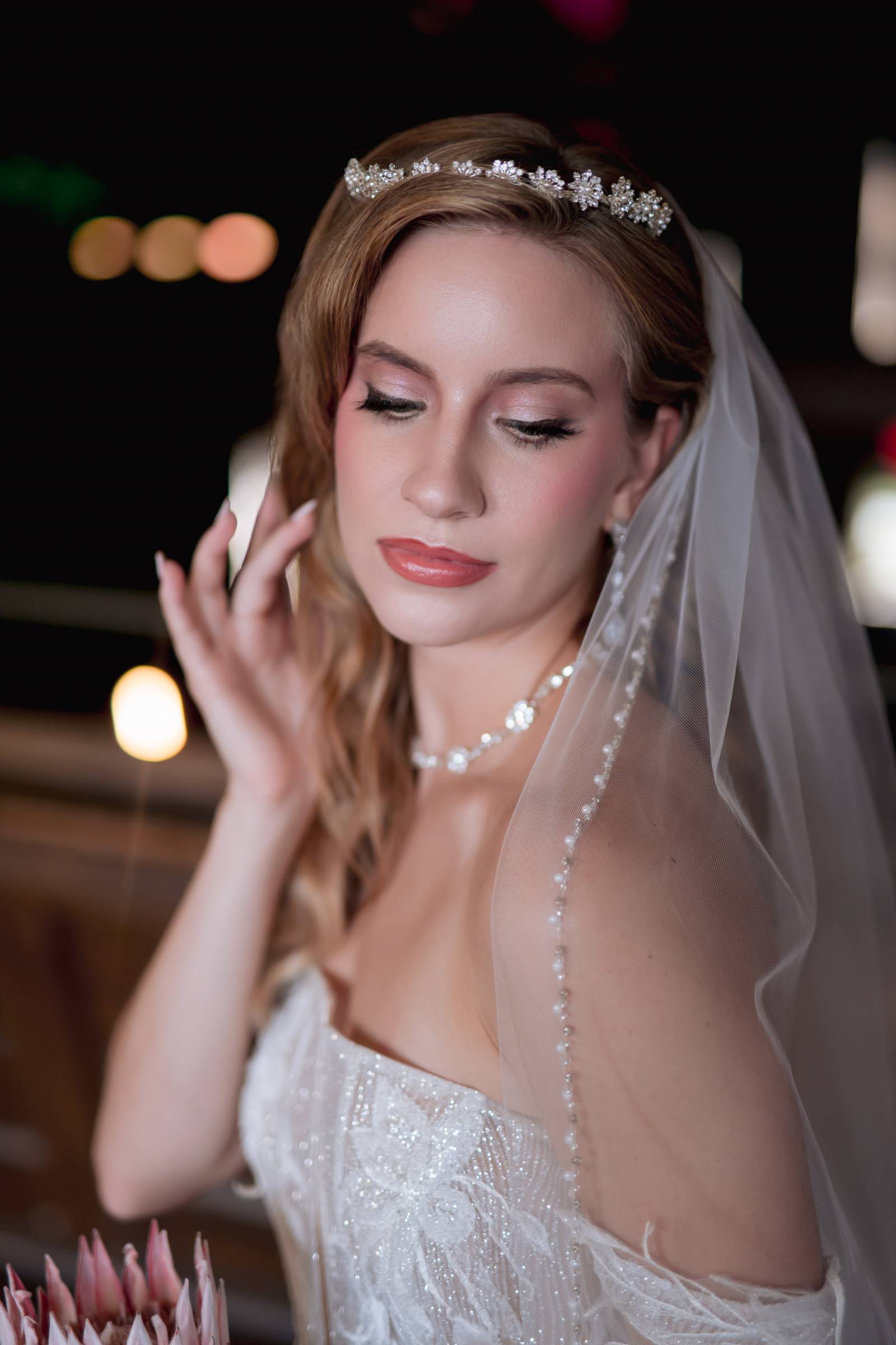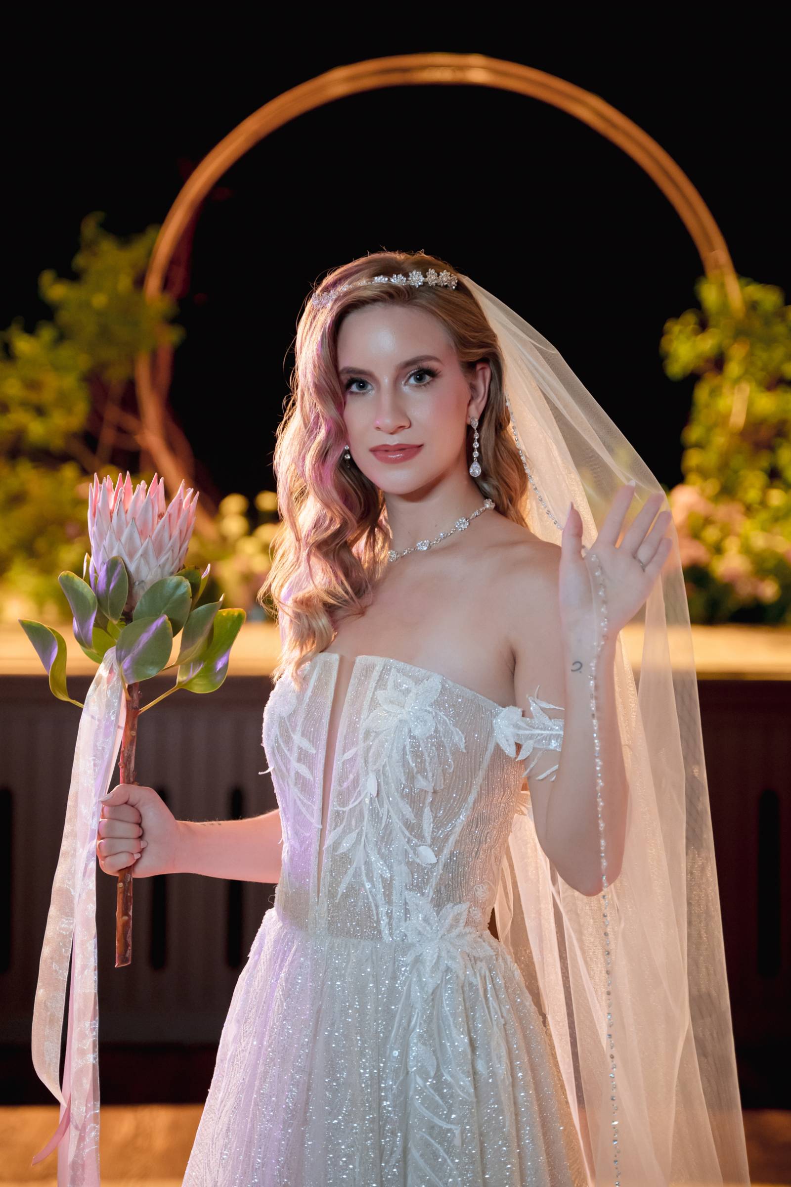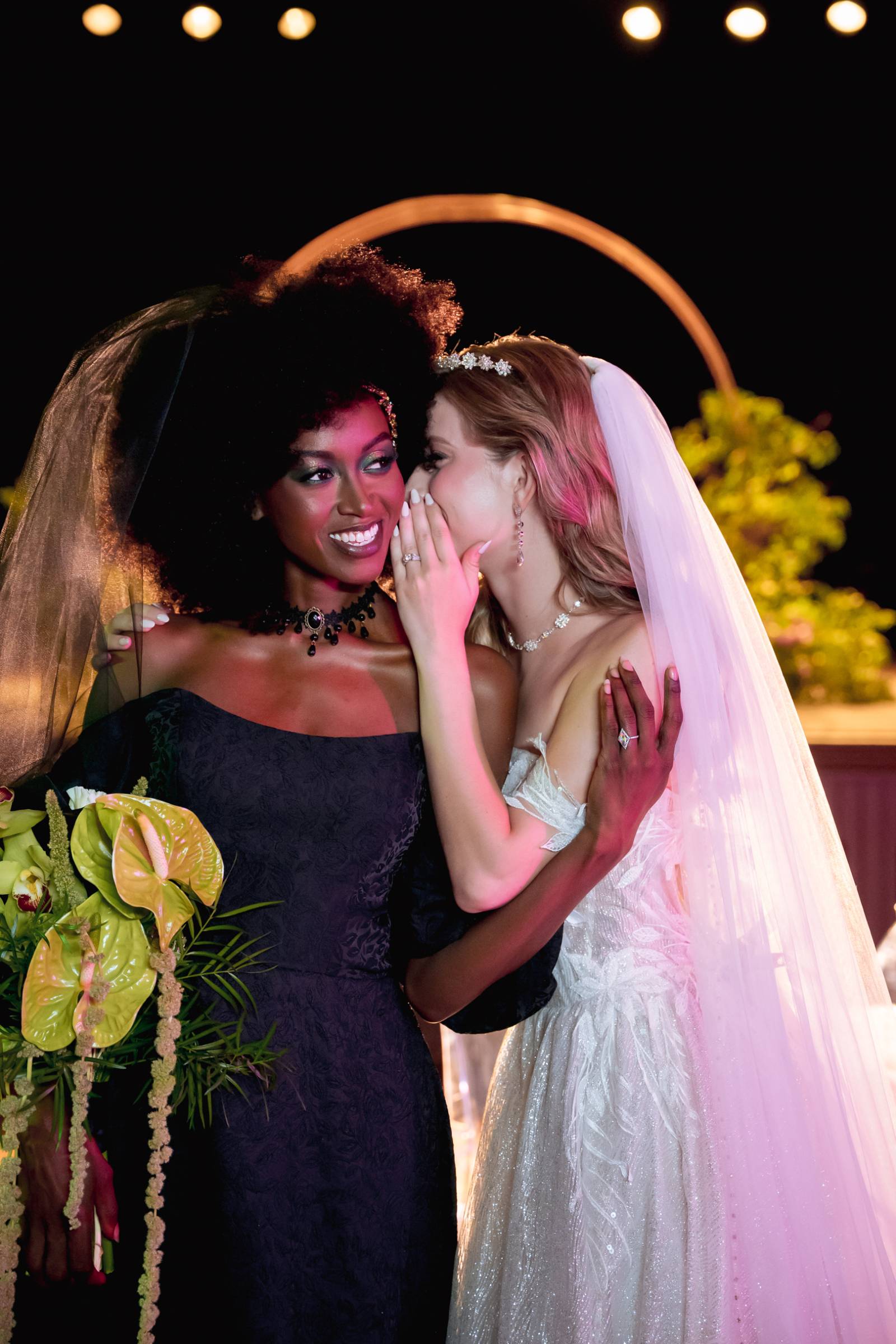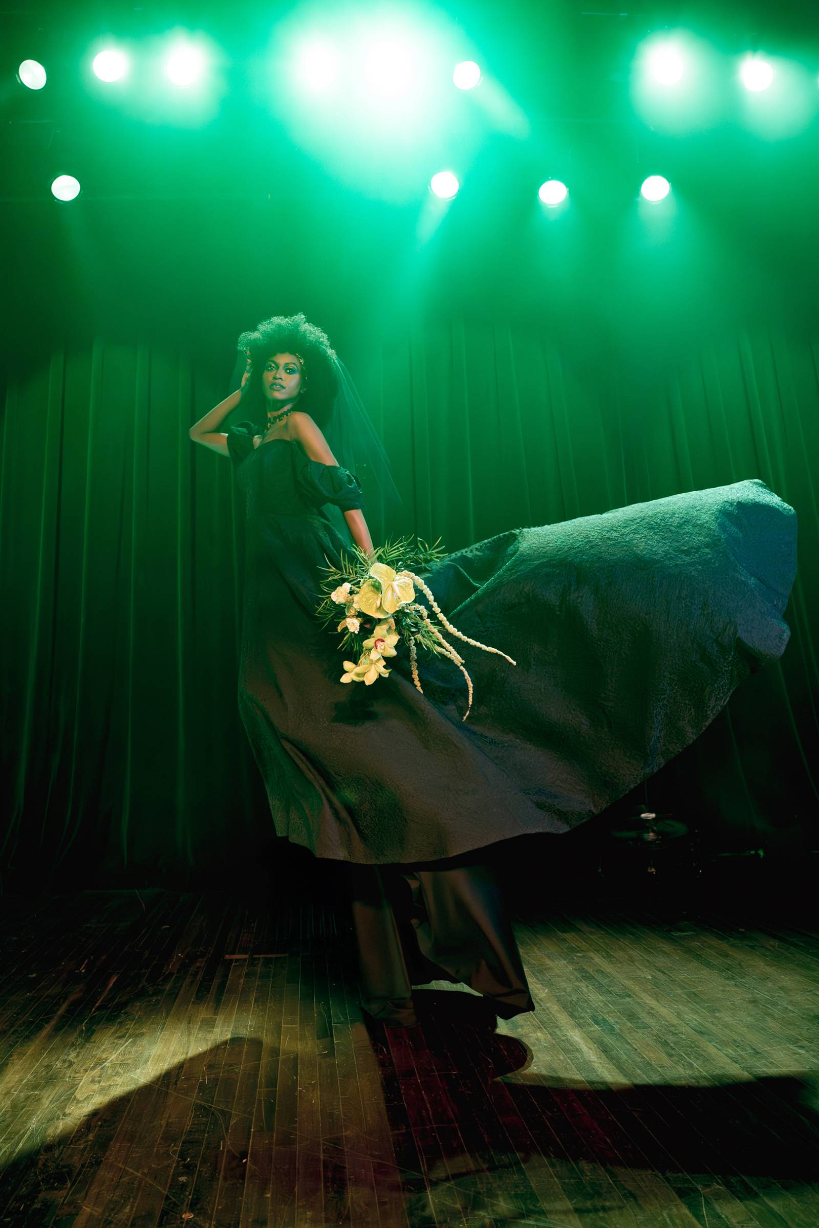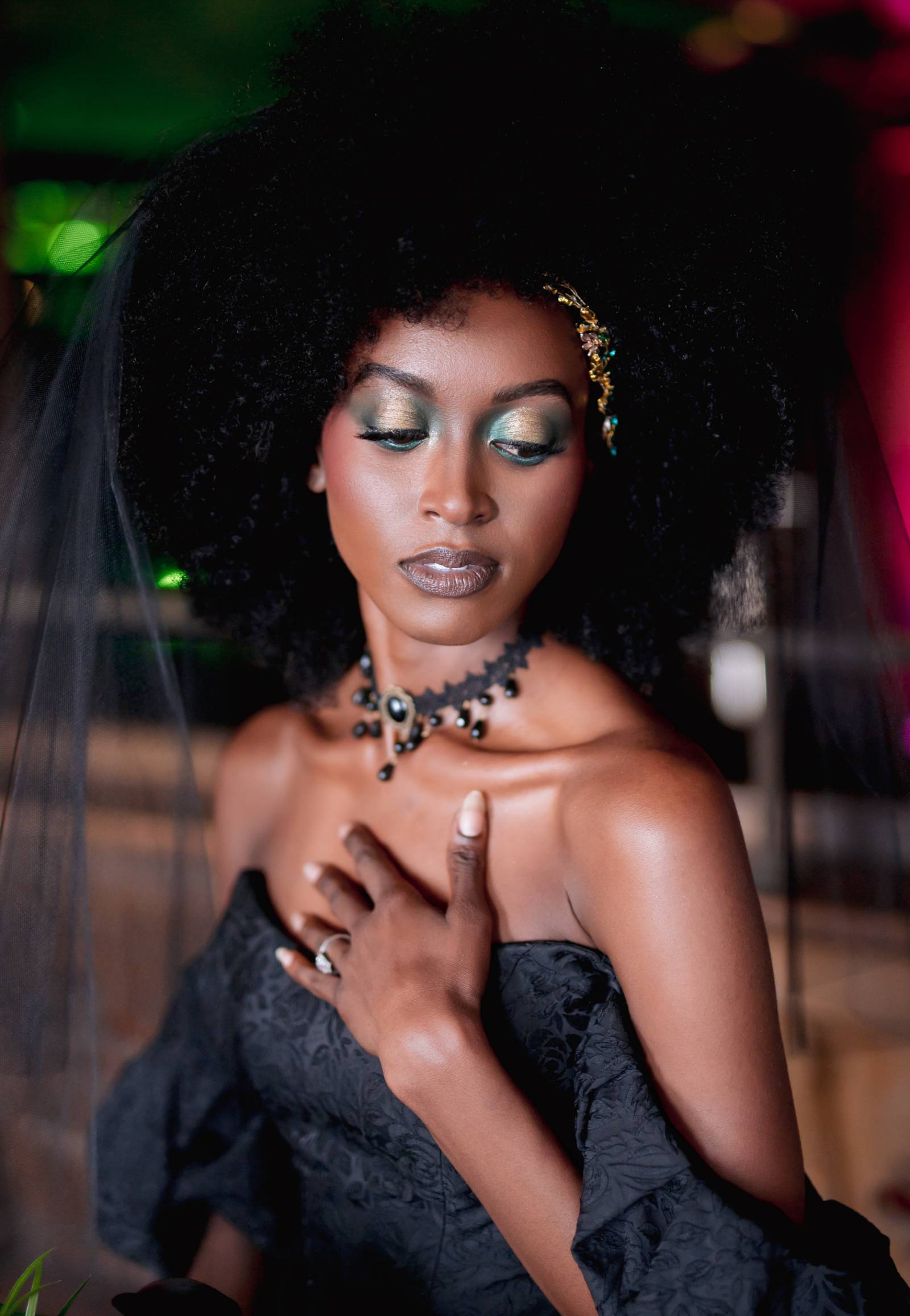 In true Elphaba fashion, Miss Ruby Bridal styled Julia in a black statement gown with a scoop neckline and puffy, off-the-shoulder sleeves. The luxurious a-line dress also featured a brocade fabric and a flowing train. Julia was accessorized with an elbow-length black tulle veil, a beaded choker necklace, and an ornate gold hairpin.