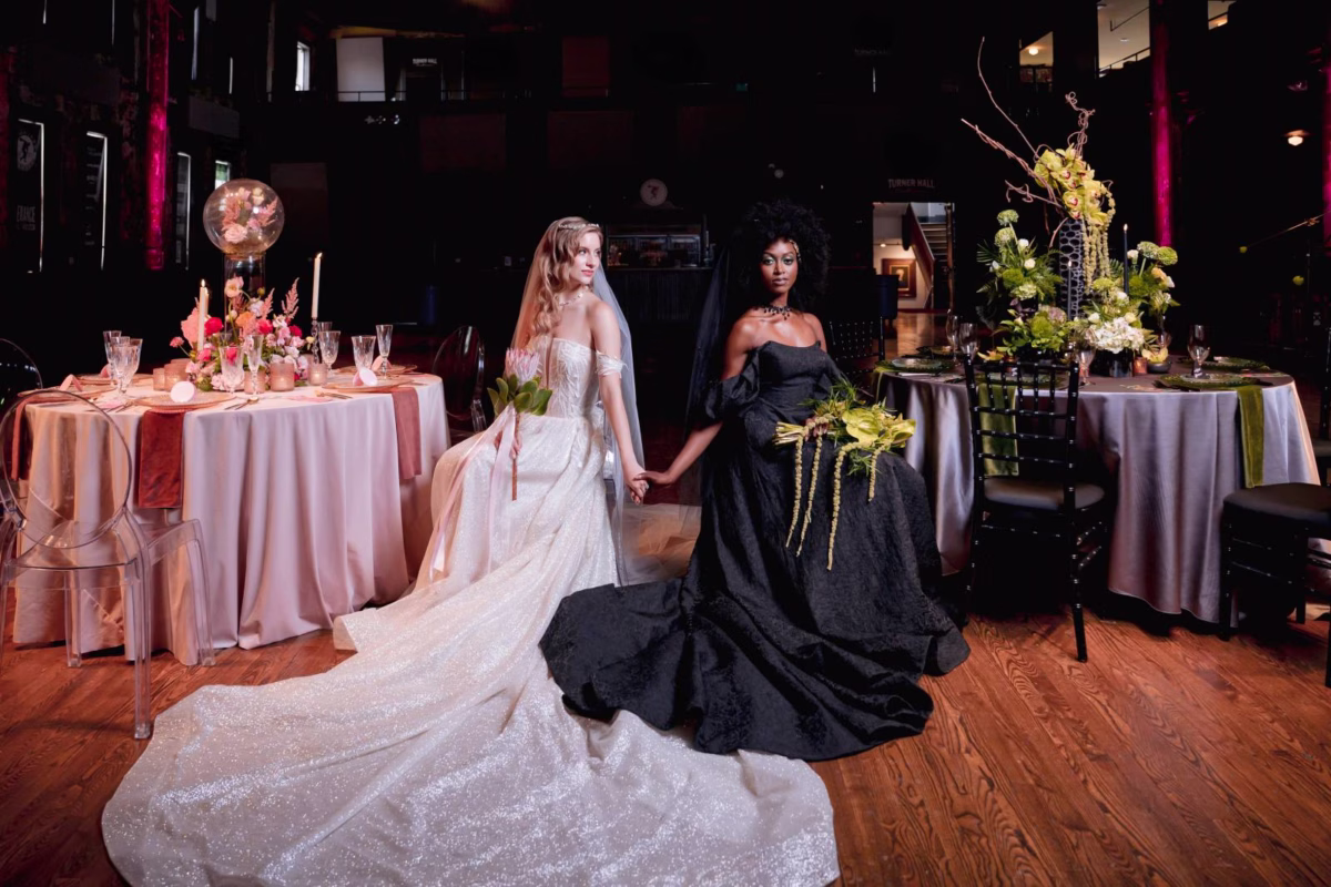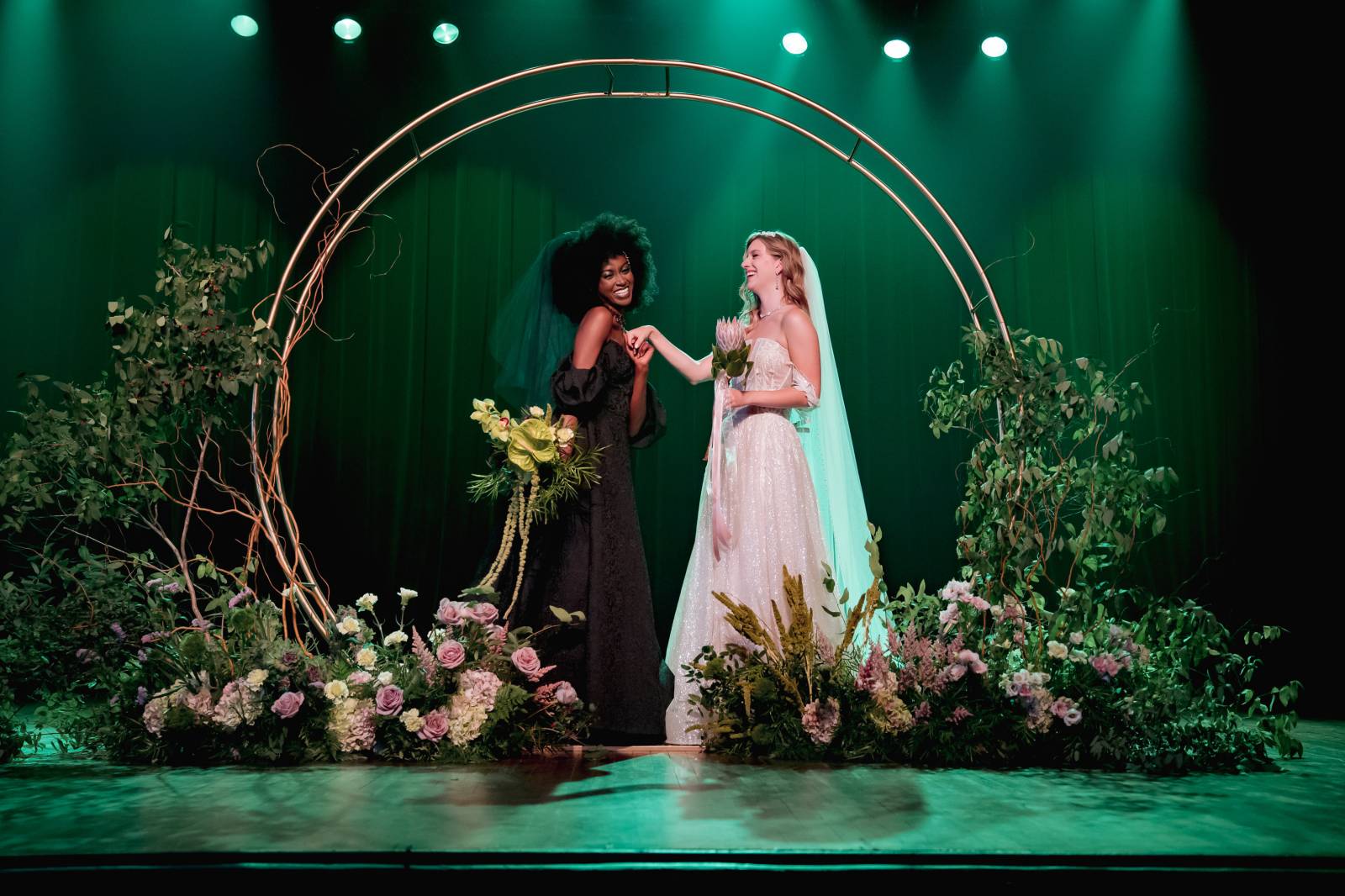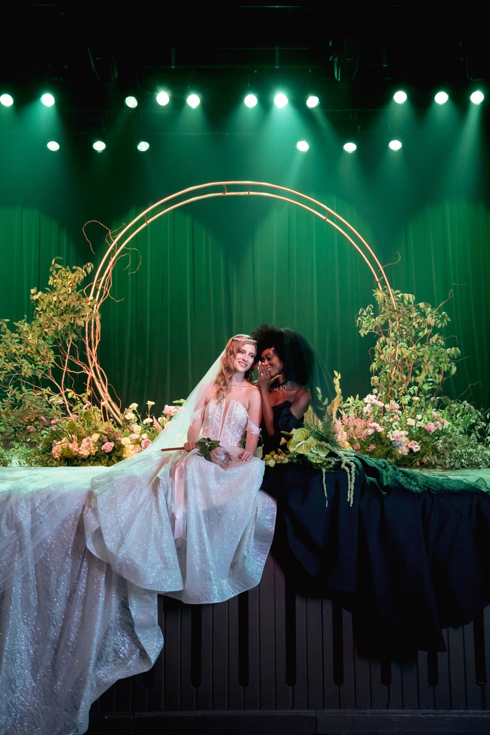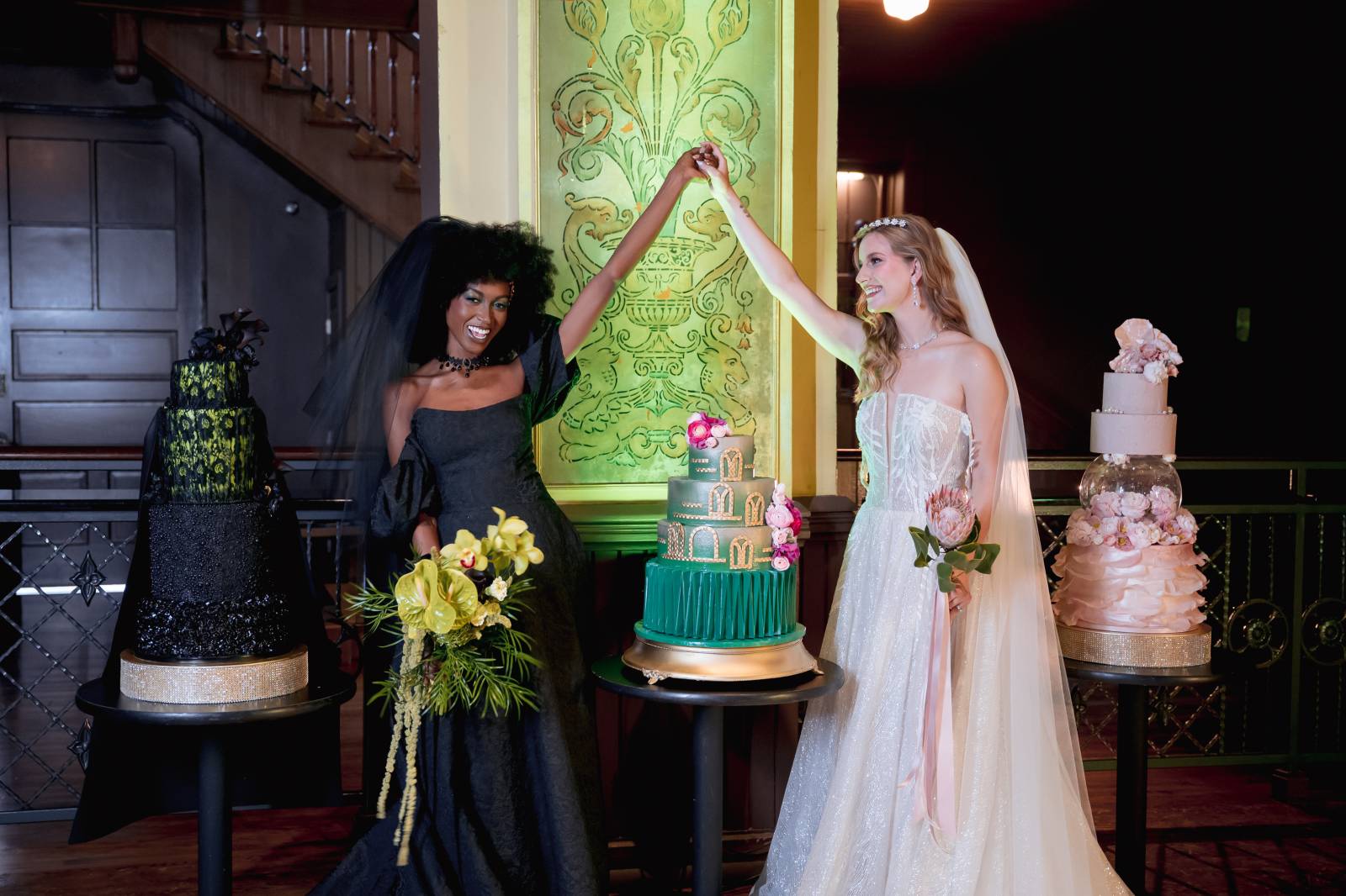 Lights, fog, and a little bit of Broadway magic set the stage for this Wicked-inspired wedding editorial. Set in the historic Turner Hall Ballroom, this creative collaboration, led by OSO IN LOVE Wedding & Event Curators, pulled together bold fashion, layered lighting, scene-stealing décor, and soaring heights to reimagine a love story based on the beloved book, film, and musical. From glittering gowns and glowing florals to cakes worthy of Oz, this shoot is your backstage pass to a theatrical, modern celebration.
