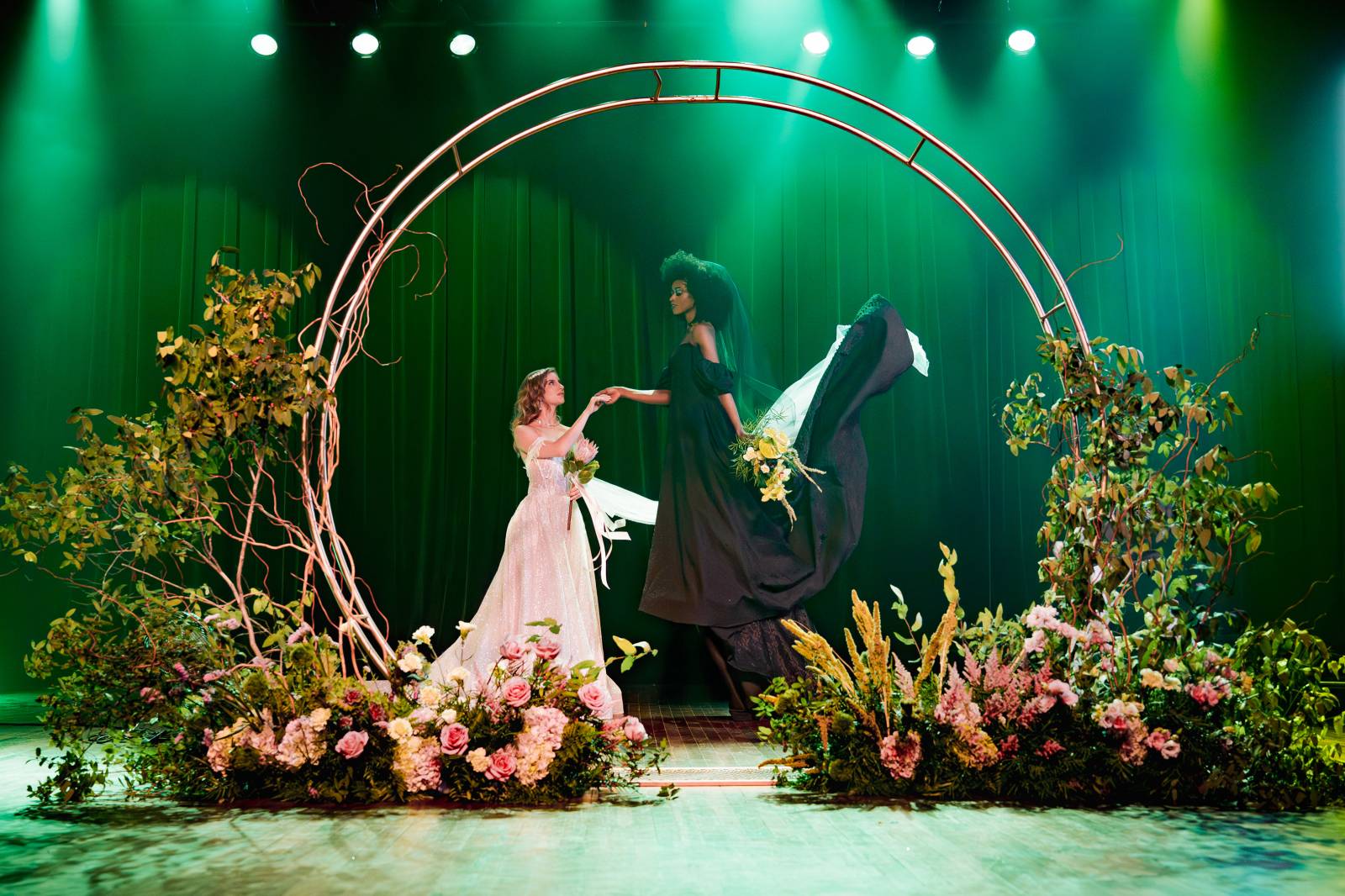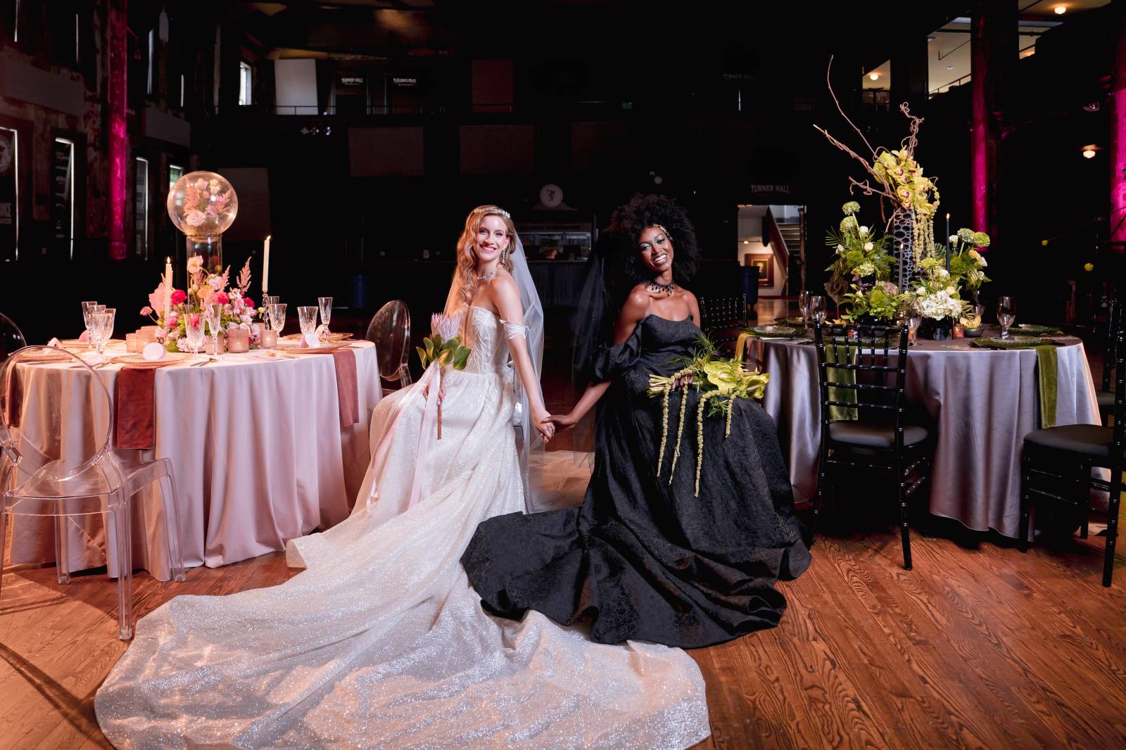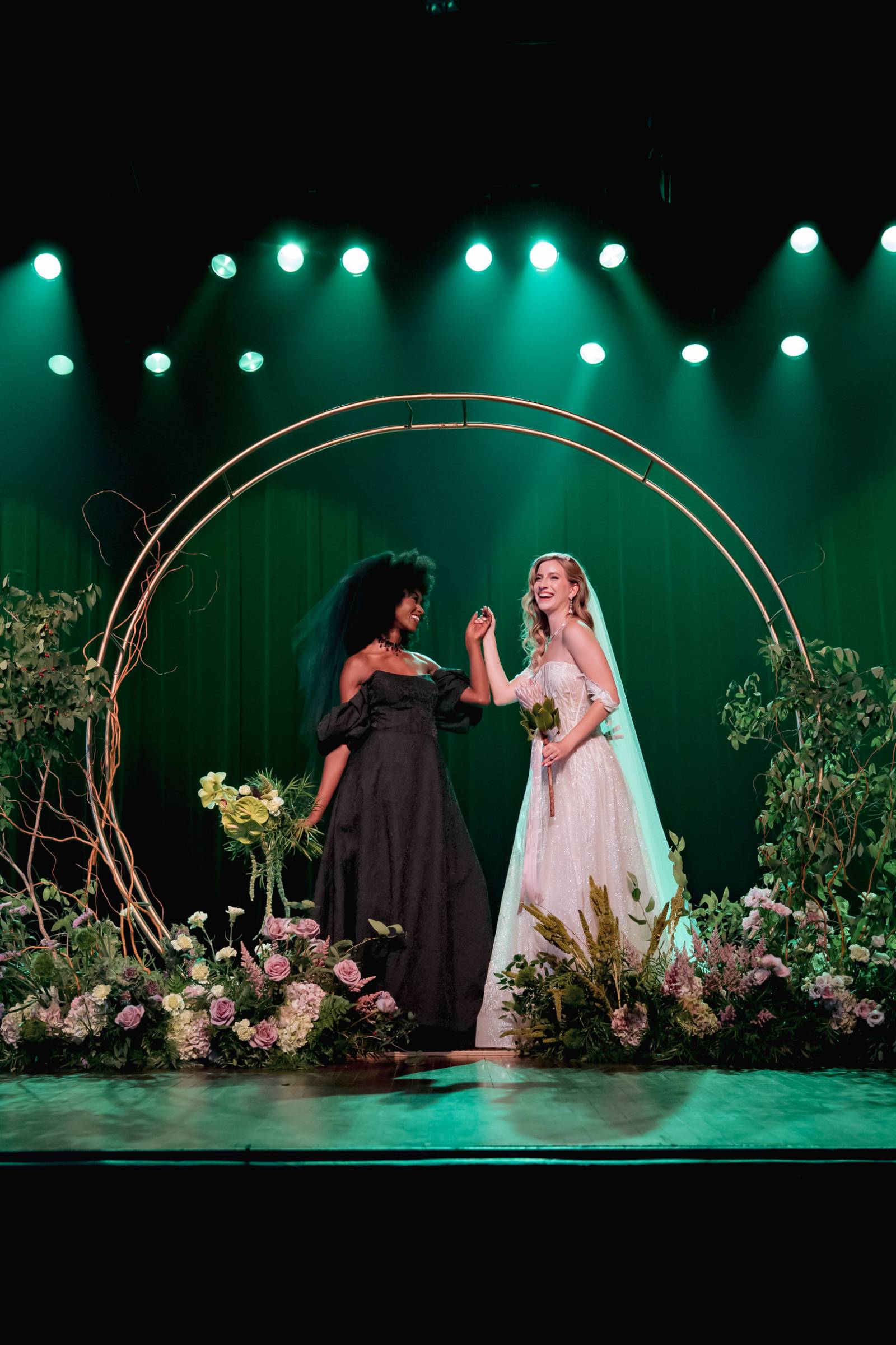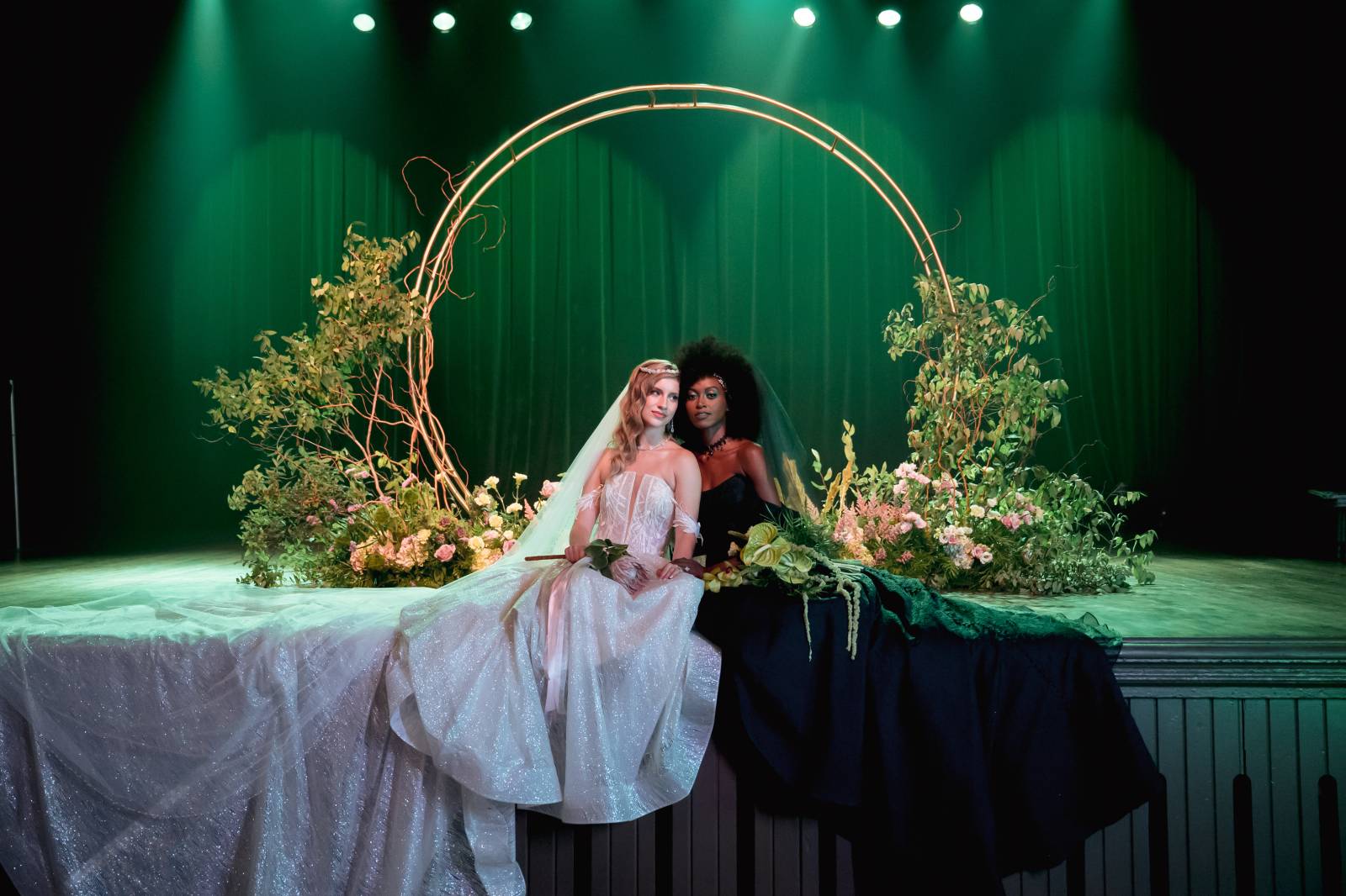Lights, fog, and a little bit of Broadway magic set the stage for this Wicked-inspired wedding editorial. Set in the historic Turner Hall Ballroom, this creative collaboration, led by OSO IN LOVE Wedding & Event Curators, pulled together bold fashion, layered lighting, scene-stealing décor, and soaring heights to reimagine a love story based on the beloved book, film, and musical. From glittering gowns and glowing florals to cakes worthy of Oz, this shoot is your backstage pass to a theatrical, modern celebration.