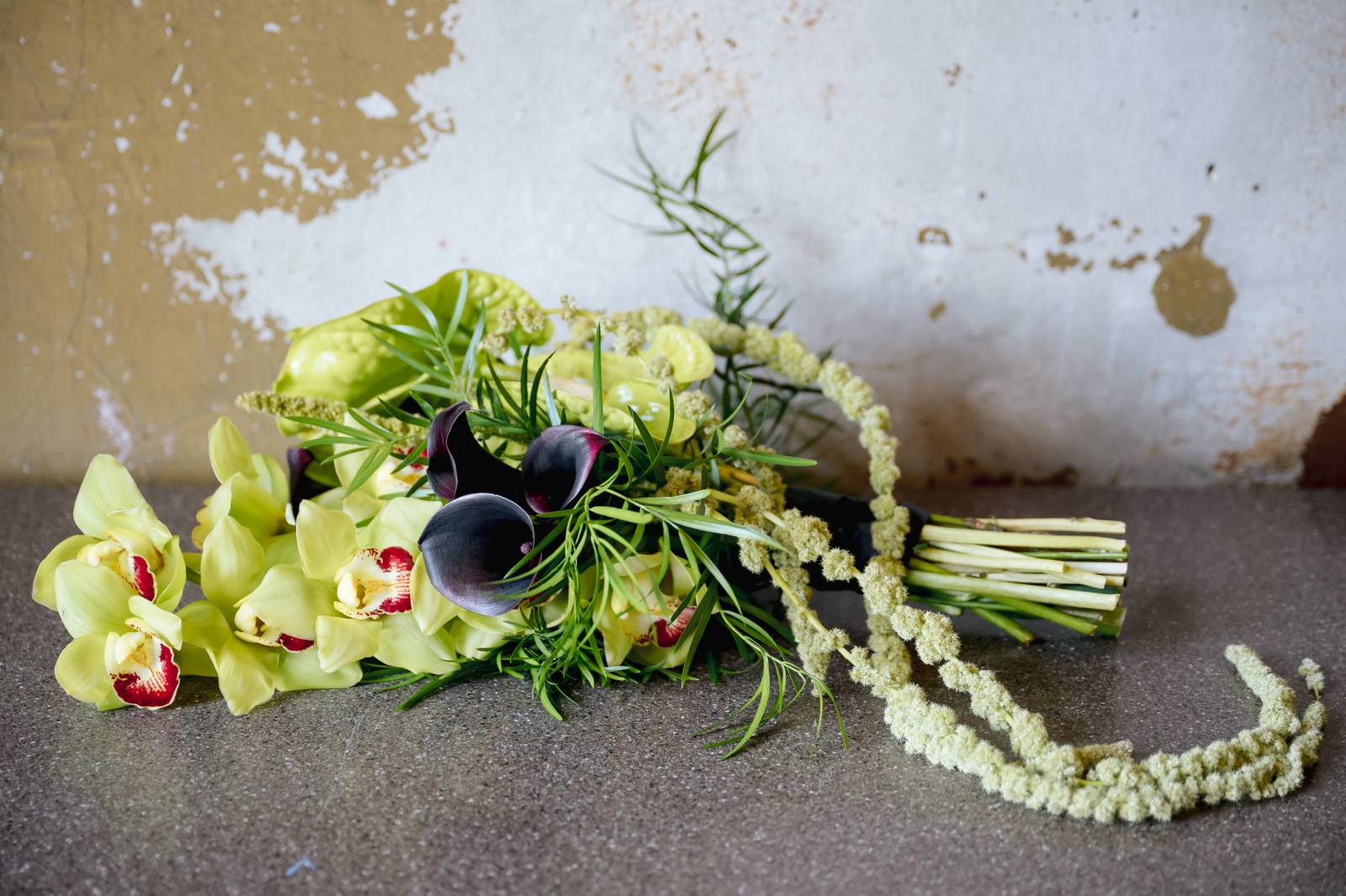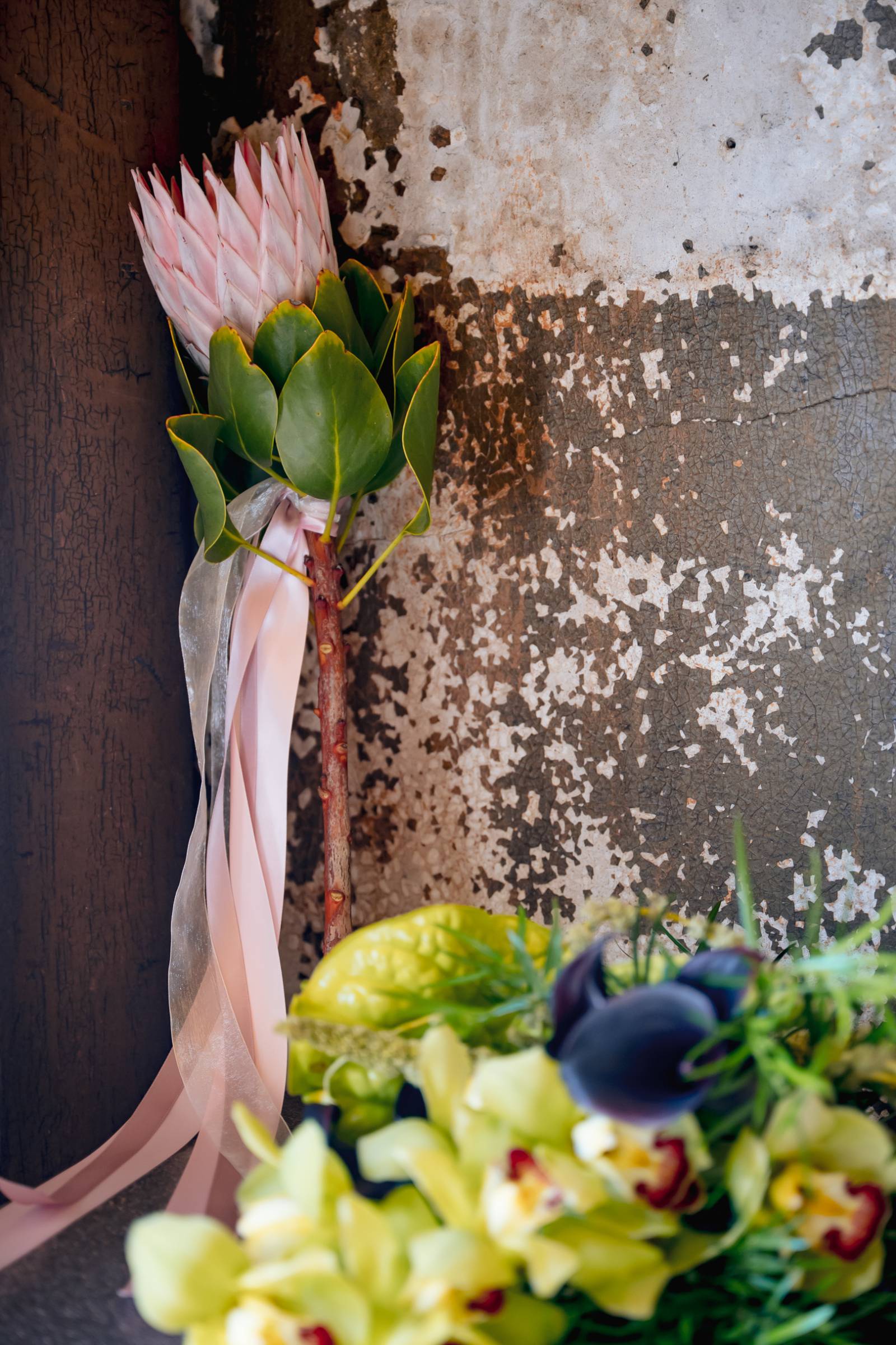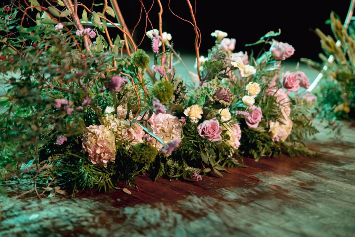 At the ceremony scene, Flowers for Dreams gathered branches, focused on sustainability, and sourced other local Midwest blooms. With a restrained color palette of green and pink, they experimented with tonal variation and subtle hues to create an innovative, distinct, and fairytale-worthy backdrop. They also crafted whimsical bouquets for each model.
