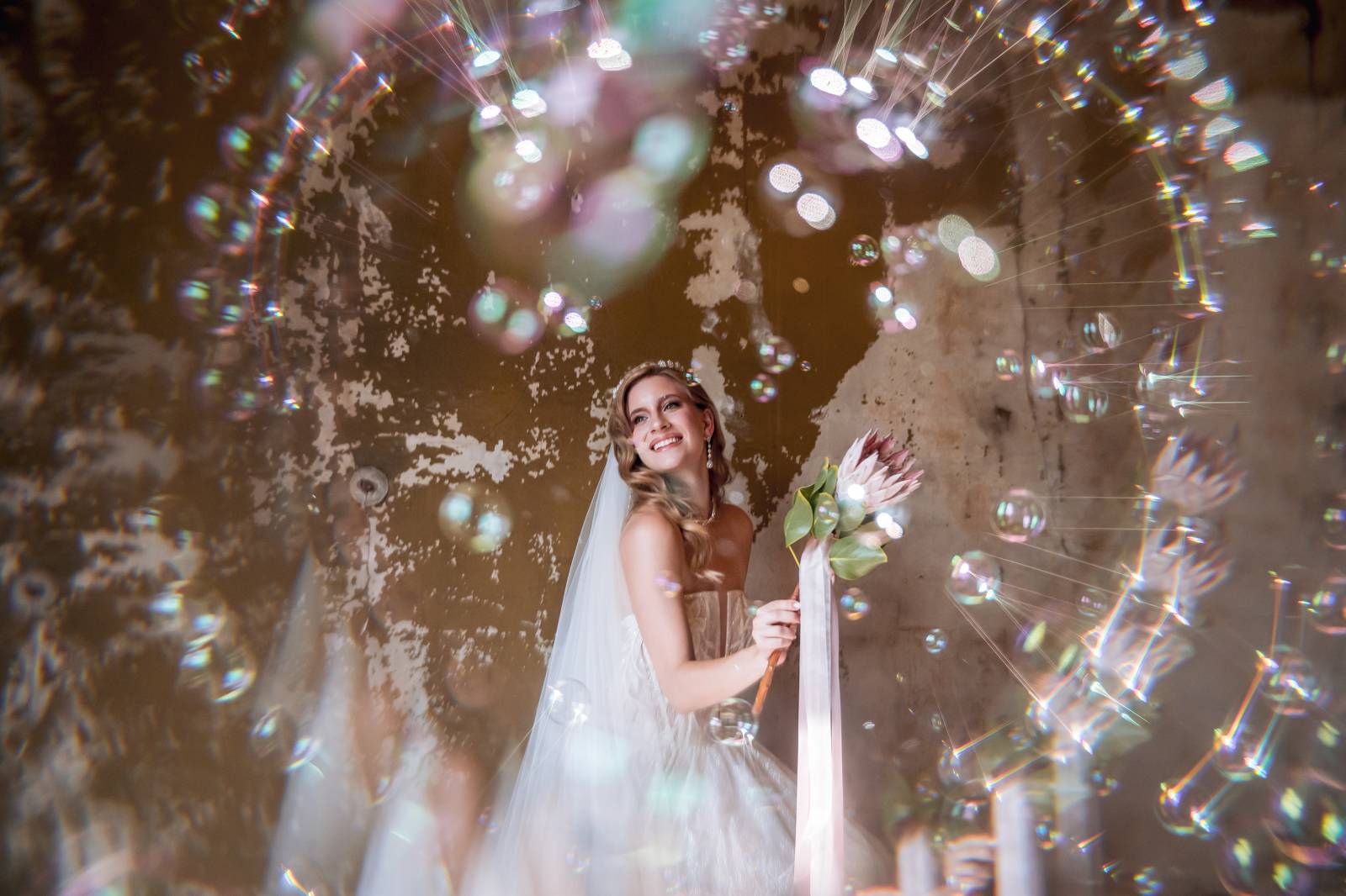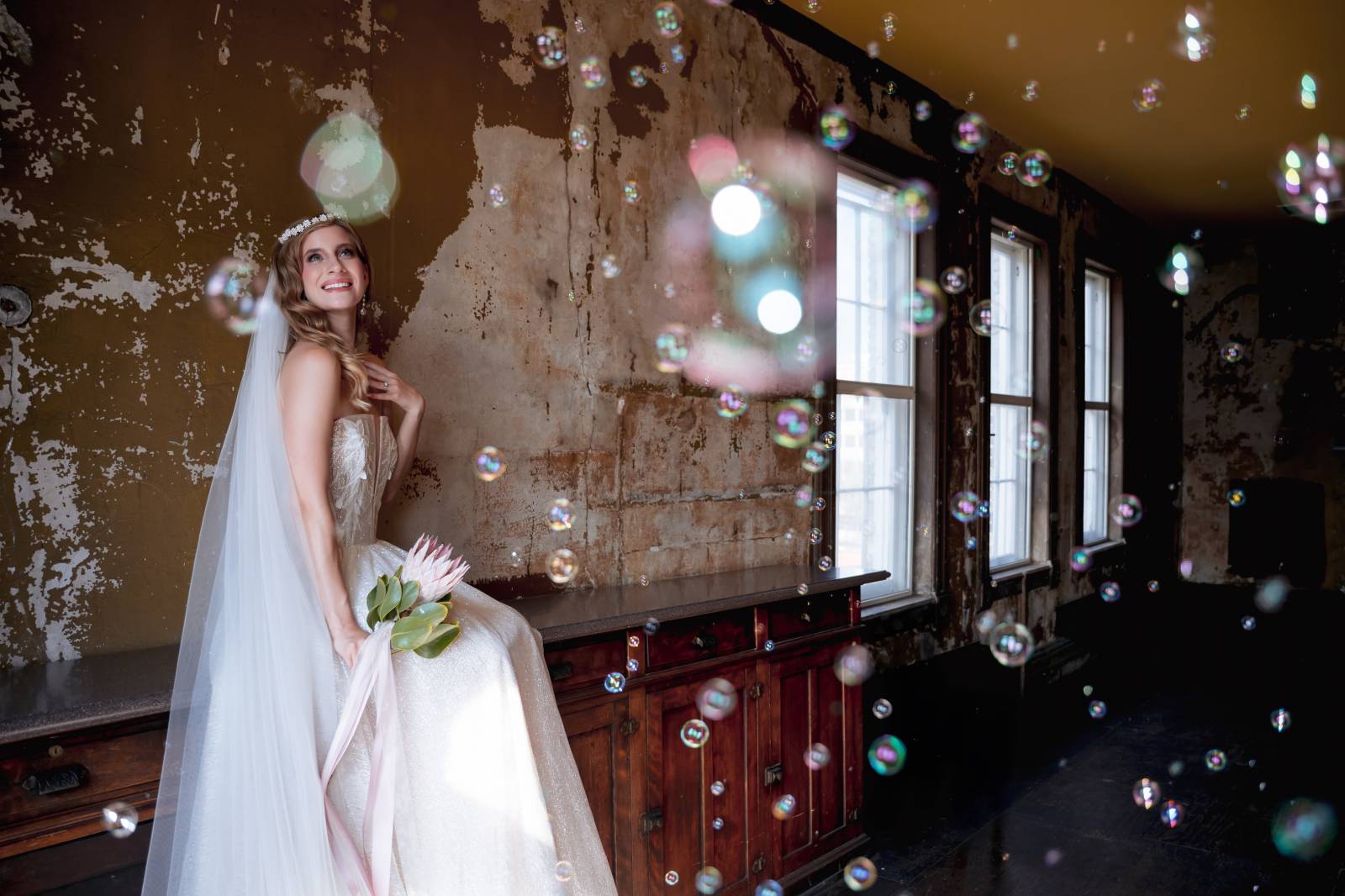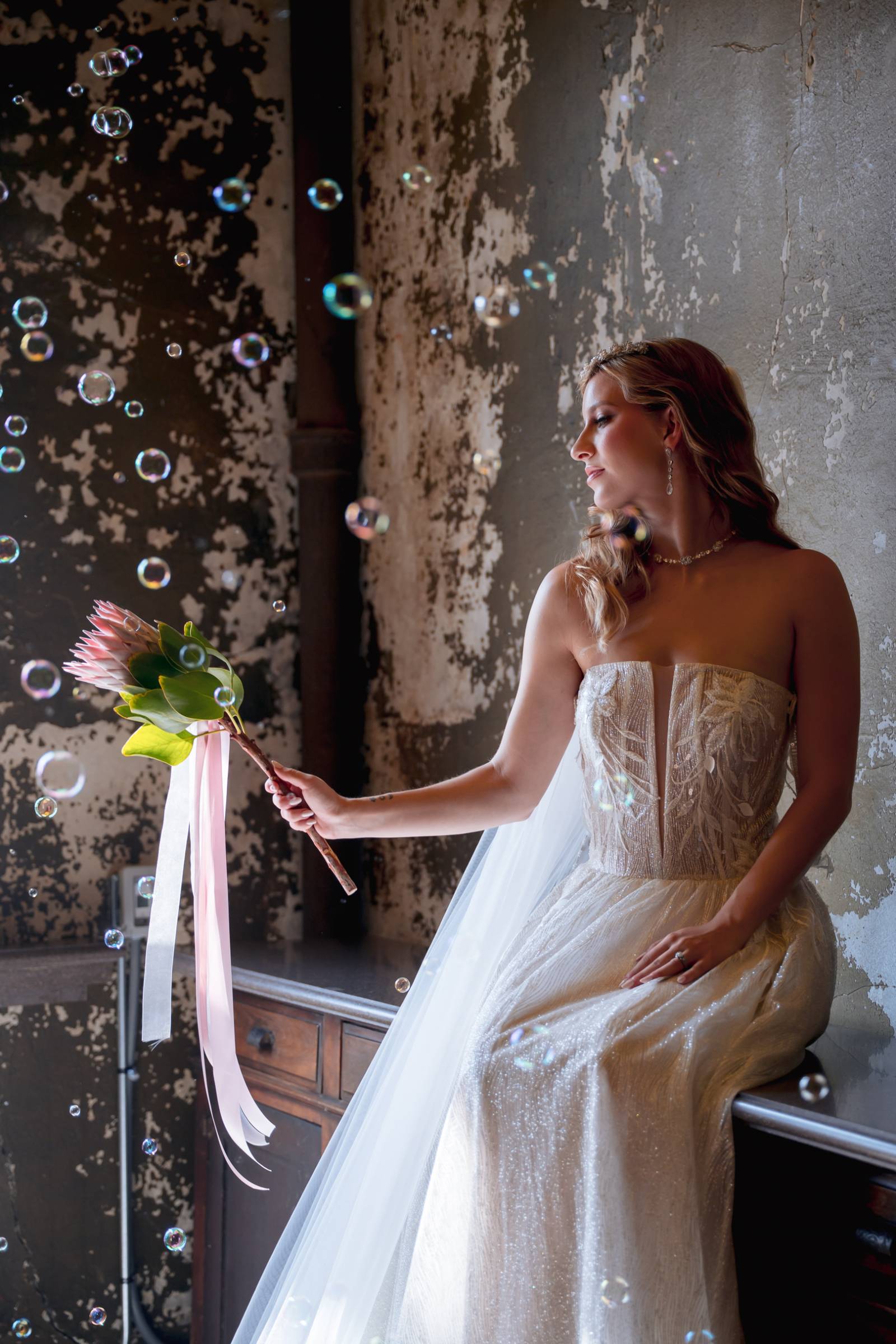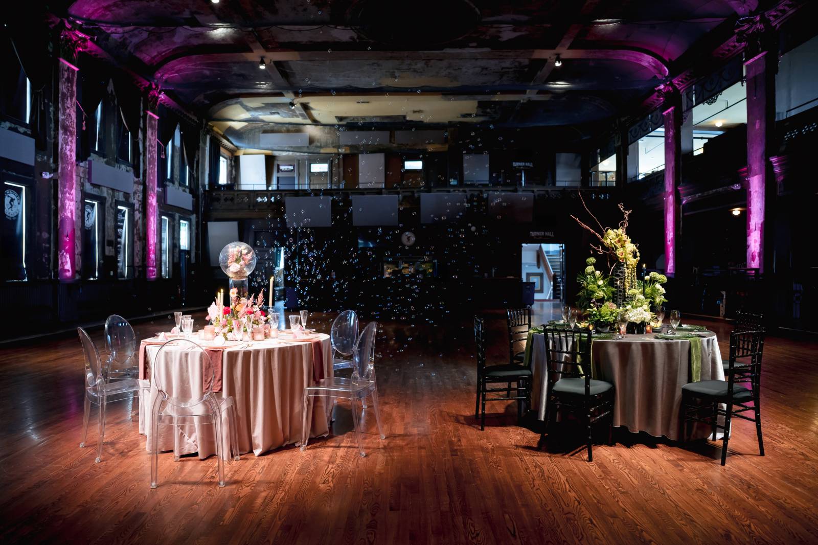 Reminisce Photography brought their own creative vision for the shoot to capture both edgy and elegant portraits and detailed shots. They played into moody lighting, colored highlights, fog, bubbles, and even fractals to add visual layers and depth to the story. The stage glow and contrasting dark interiors and natural light in the venue further added to the magic of the final gallery.