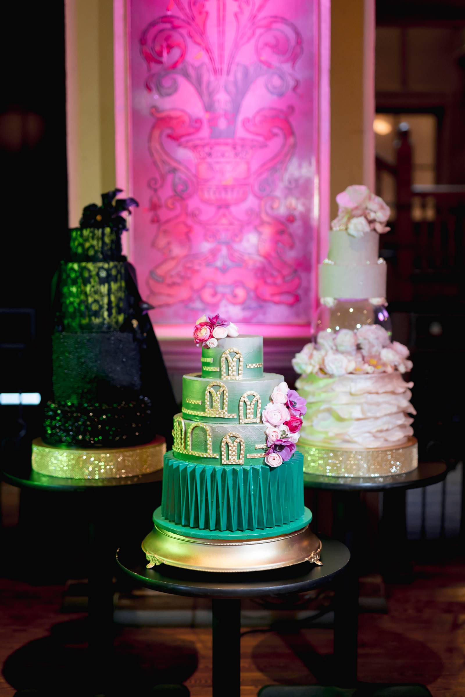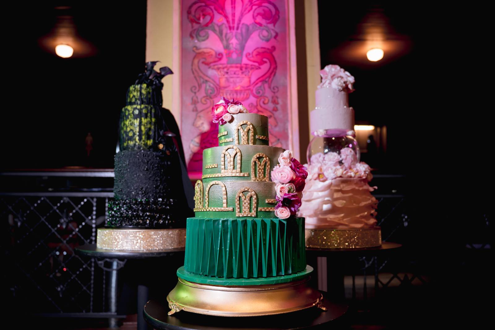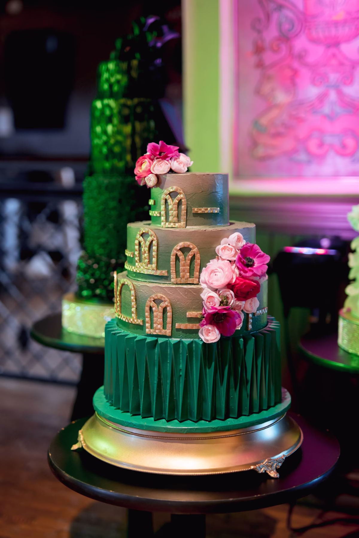 At the front, the Emerald City design stood tall on a green base, frosted in rich shades of green and gold with golden, checkered arches to mimic the city’s iconic architecture, all accented by soft pink and white blooms.
