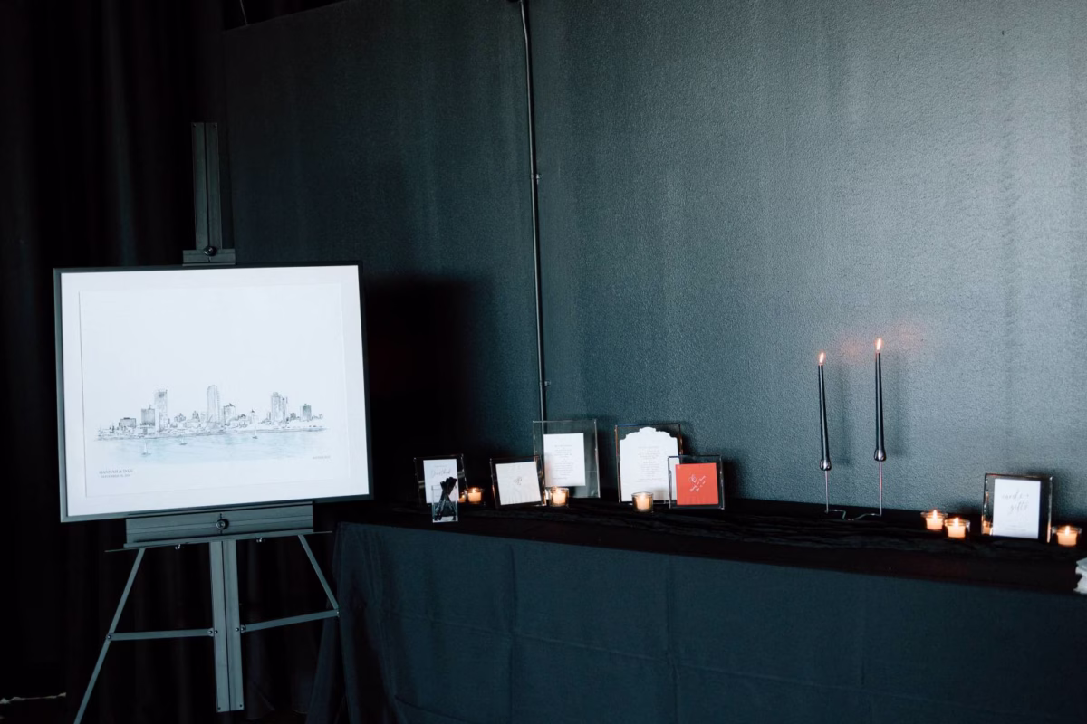 With floor-to-ceiling windows, industrial architecture, soaring ceilings, and incredible views, Jan Serr Studio was the perfect location for Hannah and Dan’s vision for their black tie event — minimalist, modern, clean, airy, and luminous. After securing their venue and primary vendors, they hired Heather Farr Events as a coordinator to help organize contracts, build a timeline, and provide valuable insights into the planning process. The couple highly recommends budgeting for a wedding coordinator, especially for hosting a wedding in an unfamiliar area, like a new city or destination.
