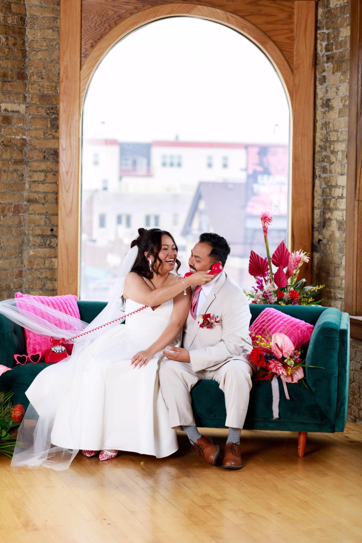 More rich colors awaited in the lounge, showcasing All Star Rentals' teal Theodorus sofa flanked by quilted, hot-pink pillows, florals, and a vintage telephone.